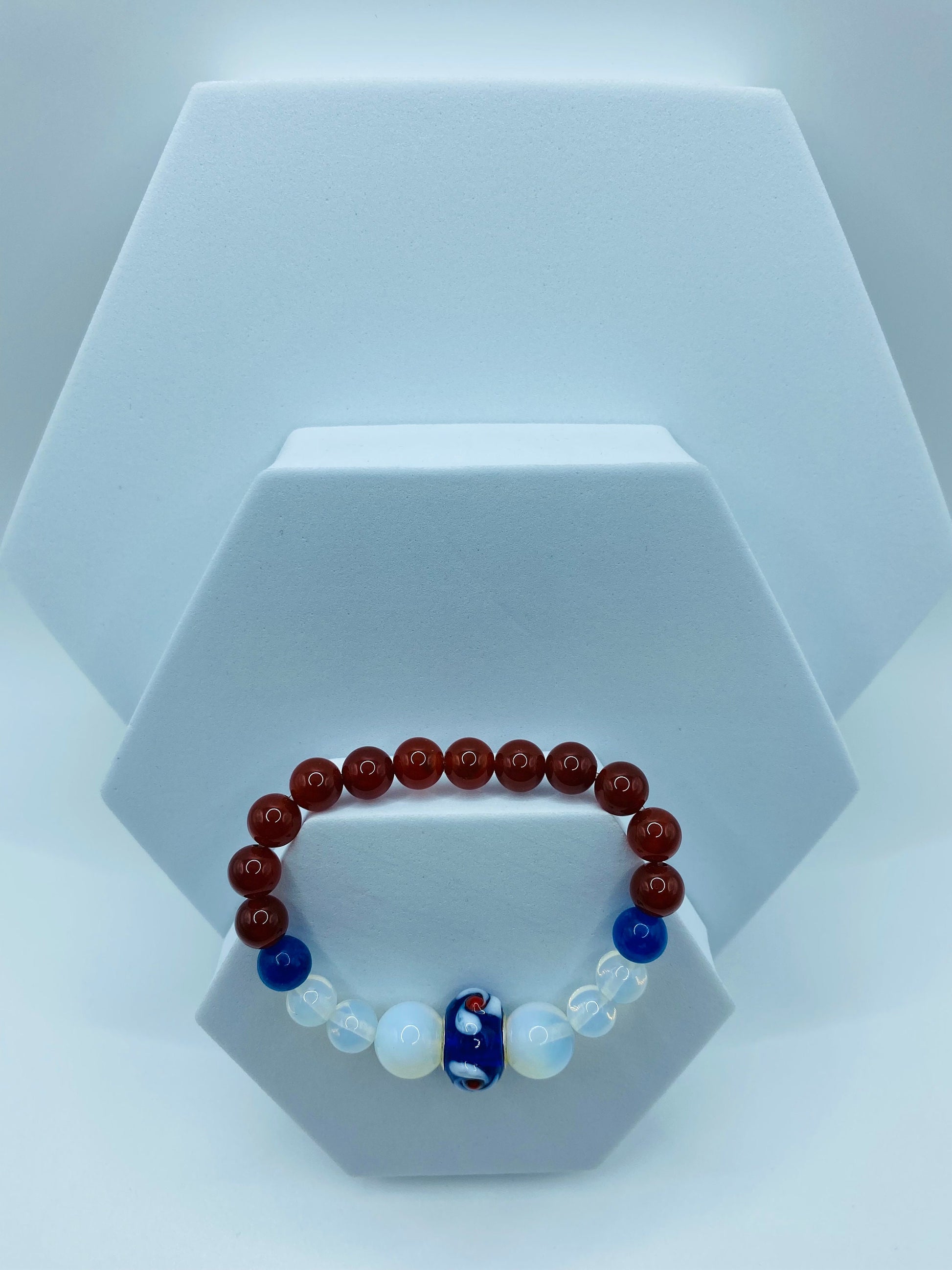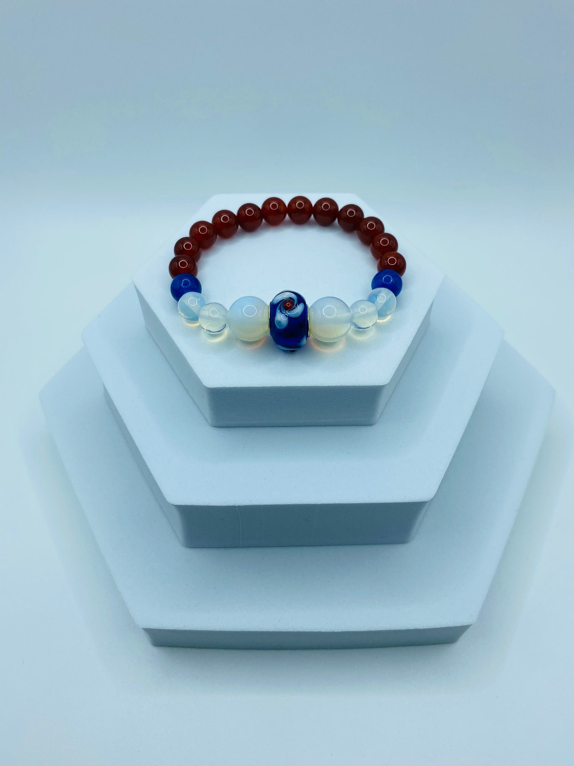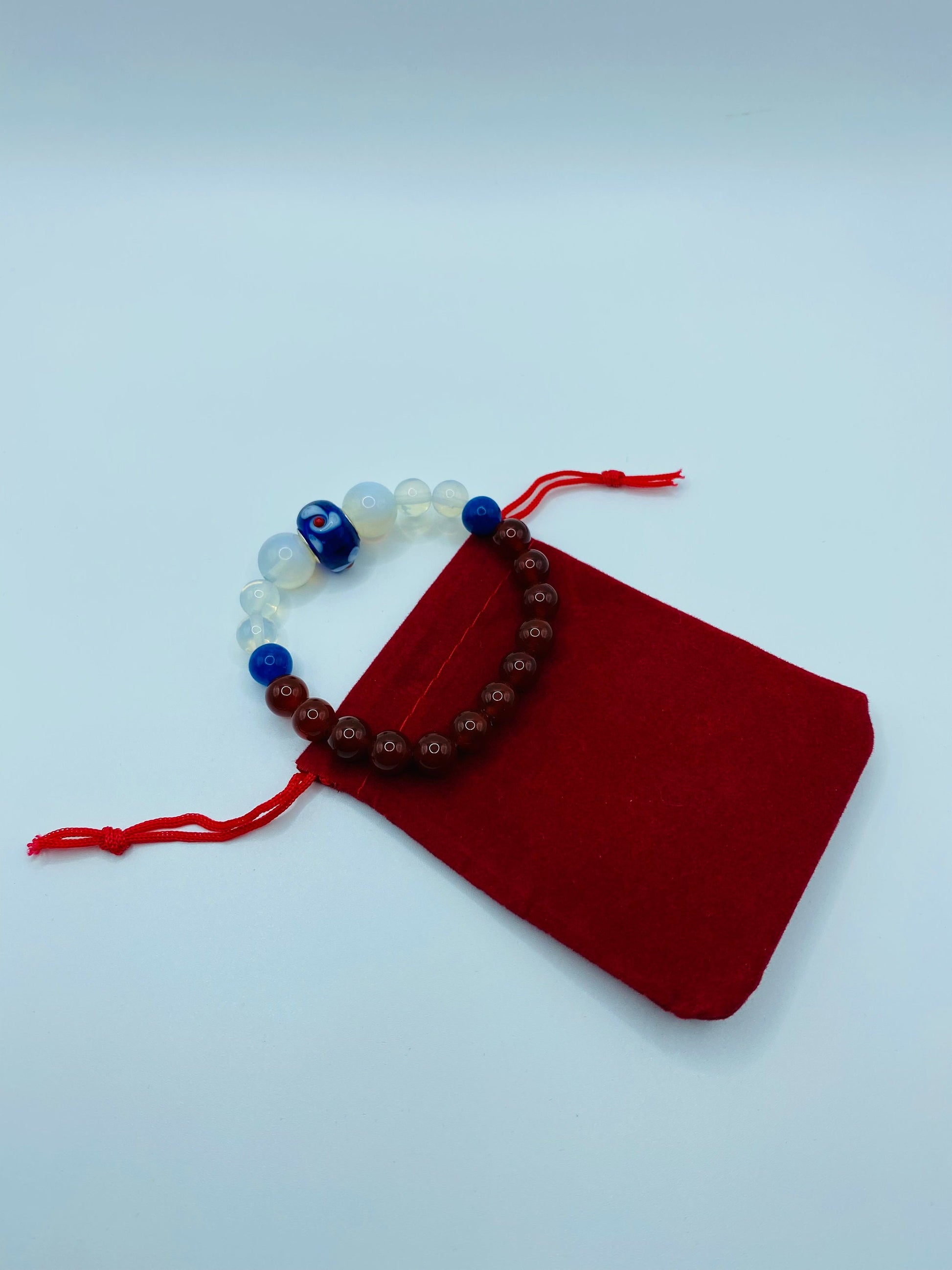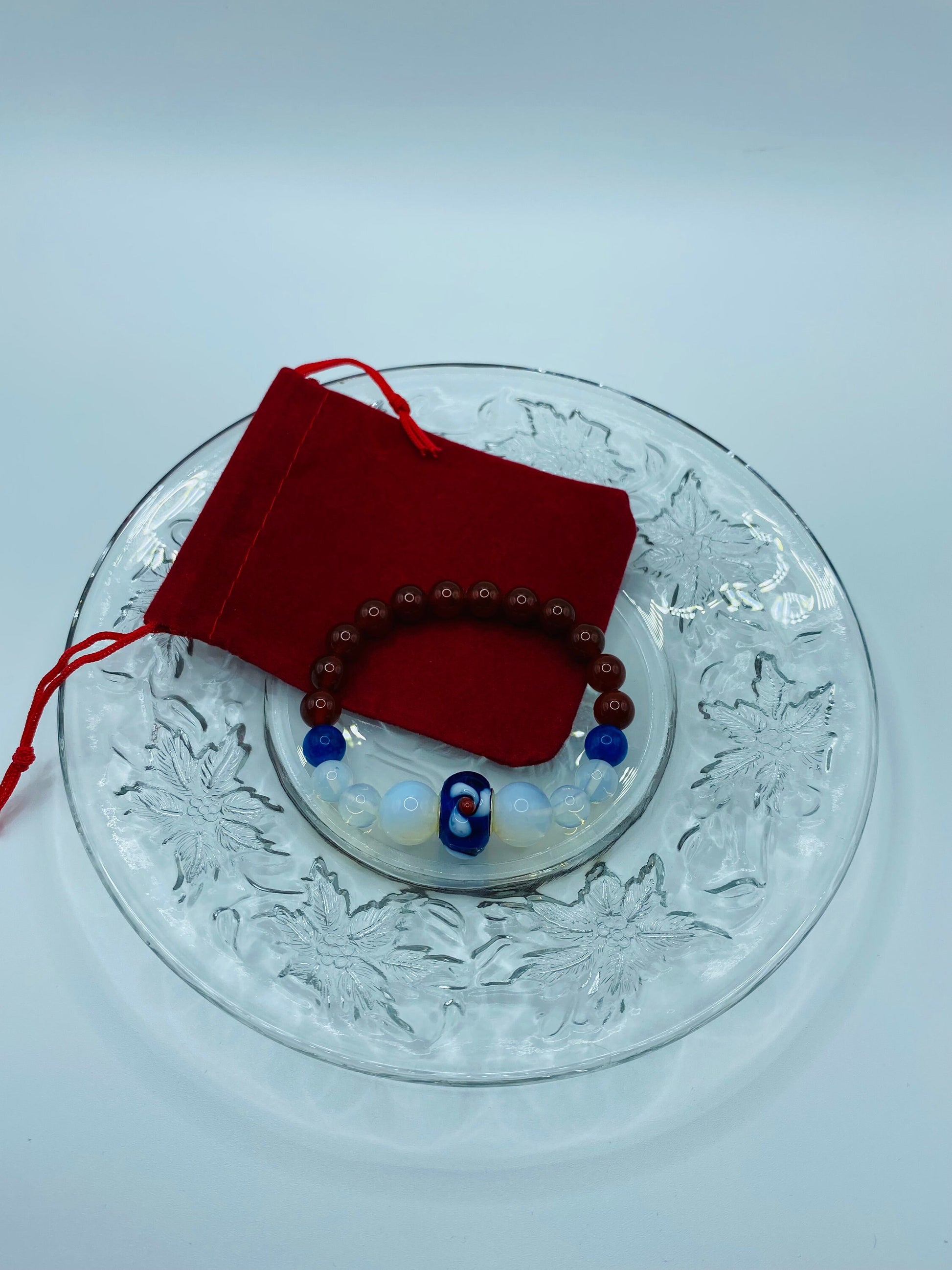Elevate your accessory game with our stunning Opal Bracelet, a perfect blend of natural beauty and vibrant colors. Featuring 8mm natural opal gemstone beads, this bracelet captures the mesmerizing play of colors that opals are famous for. Each bead is unique, giving you a one-of-a-kind piece that stands out in any collection. Complementing the opal are exquisite 8mm red carnelian and natural blue chalcedony beads, adding warmth and serenity to your wrist. The rich, fiery tones of the carnelian create a striking contrast with the calming blues of the chalcedony, while the Murano glass beads introduce a touch of elegance and sparkle. Together, they form a bracelet that’s not just jewelry; it’s a statement piece. Whether you’re dressing up for a special occasion or adding flair to your everyday outfit, the Opal Bracelet is the perfect finishing touch. Don’t miss the chance to showcase your unique style—grab yours today and let your wrist do the talking!
