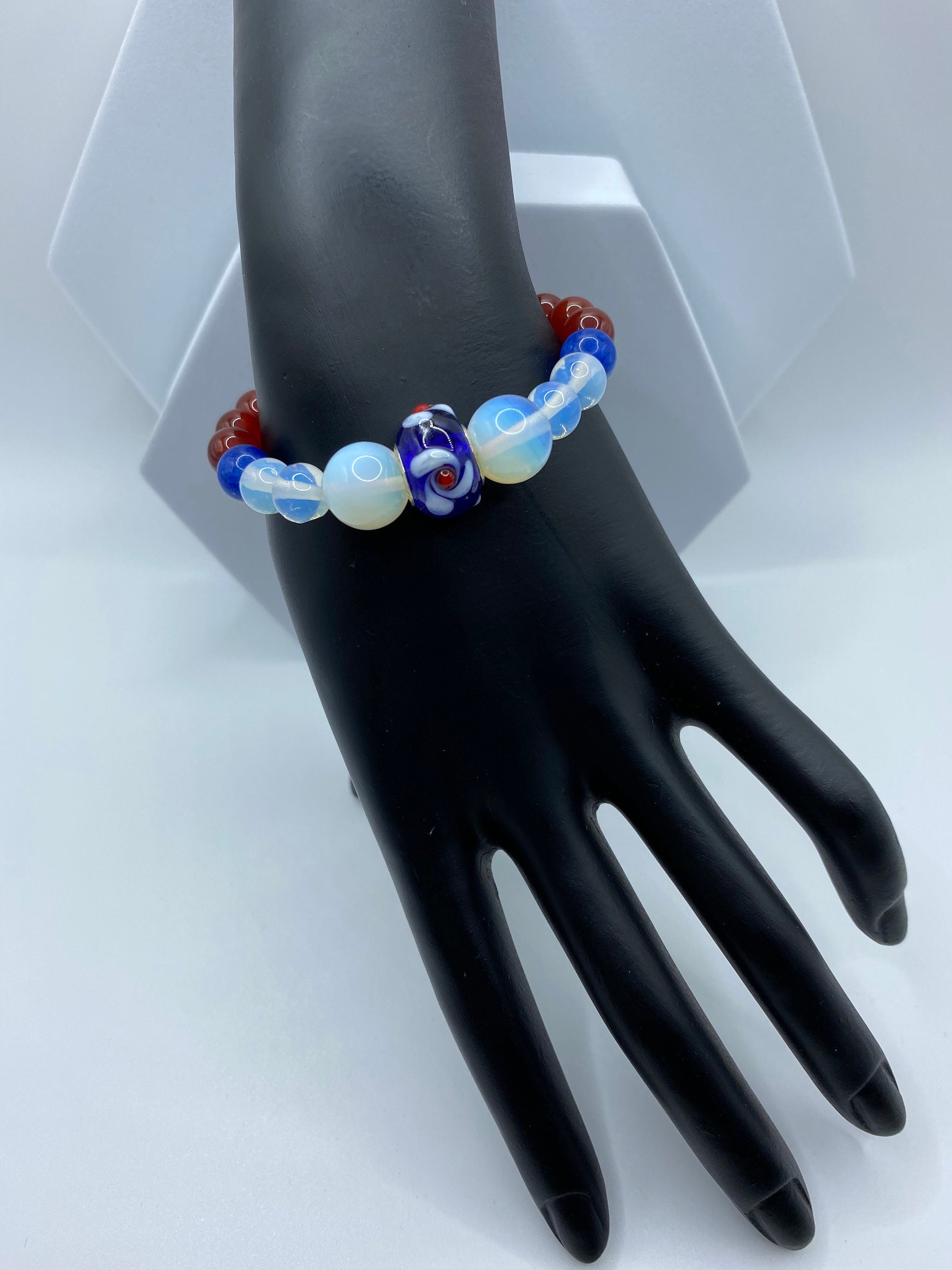 PRODUCT DETAIL - 8mm natural opal gemstone beads - 8mm red carnelian natural gemstone beads - 8mm natural blue chalcedony gemstone beads - 12mm natural opal gemstone beads - 14mm silver plated Murano floral glass bead charm - Strong, stretchy cord - Handmade in a clean and safe environment