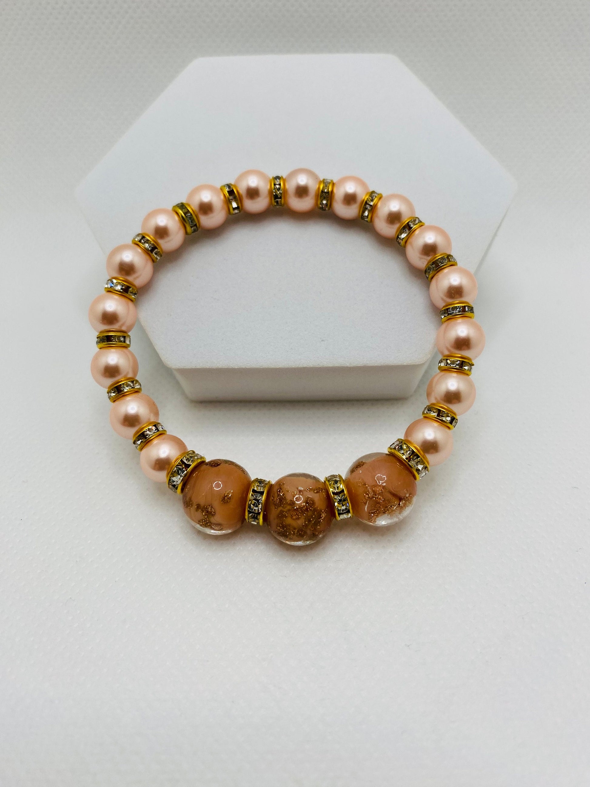 PRODUCT DETAILS - 12mm Lampwork Pink gold sand Glass beads - 8mm Pink Mother of Pearl gemstone beads - 6mm-8mm gold plated rondelle with rhinestones - Strong, stretchy cord - Handmade in a clean and safe environment