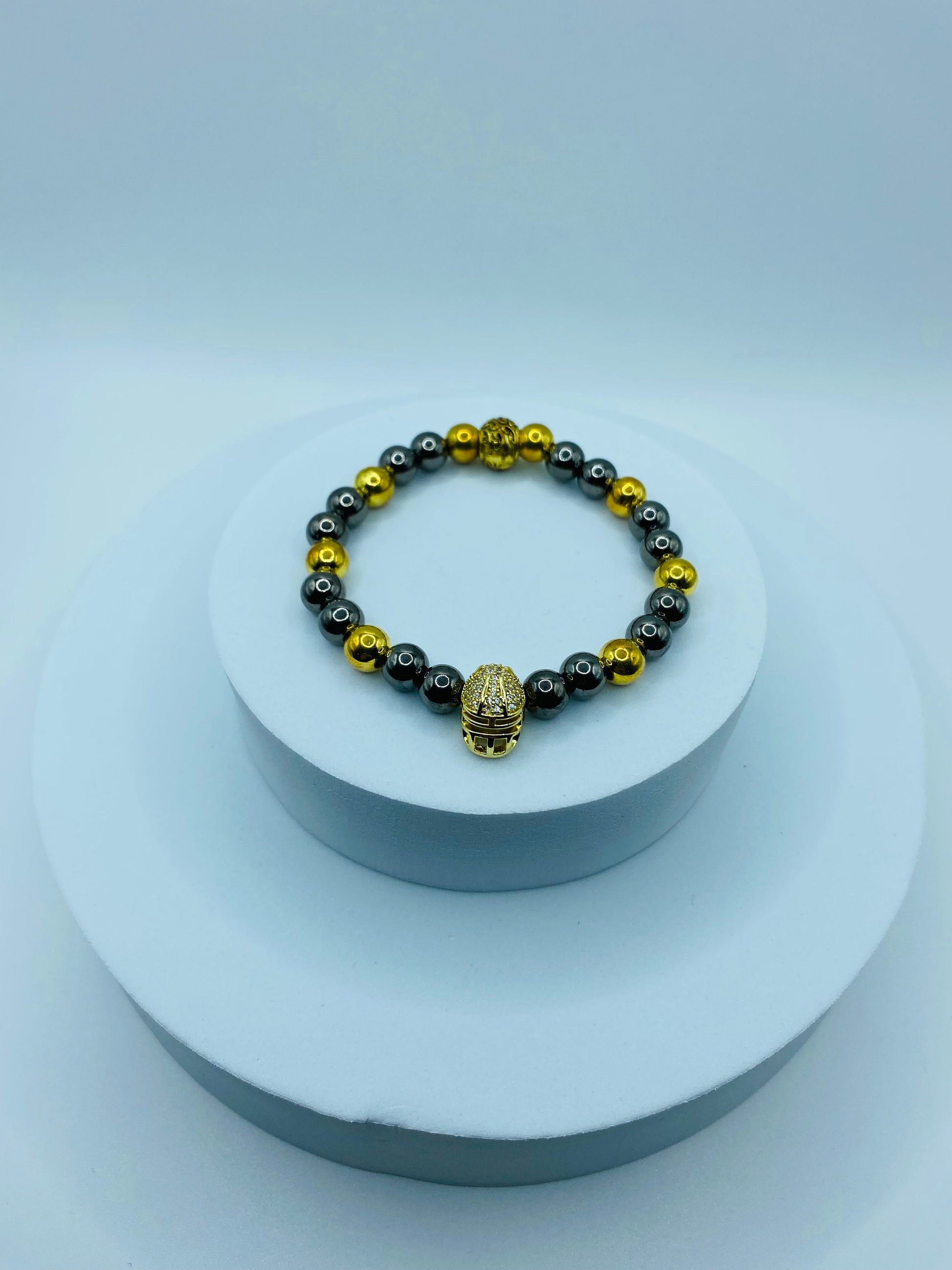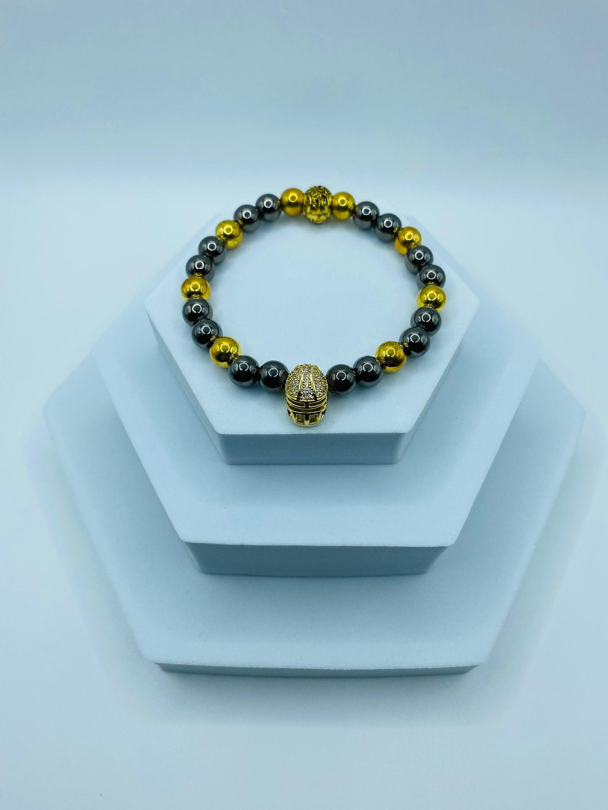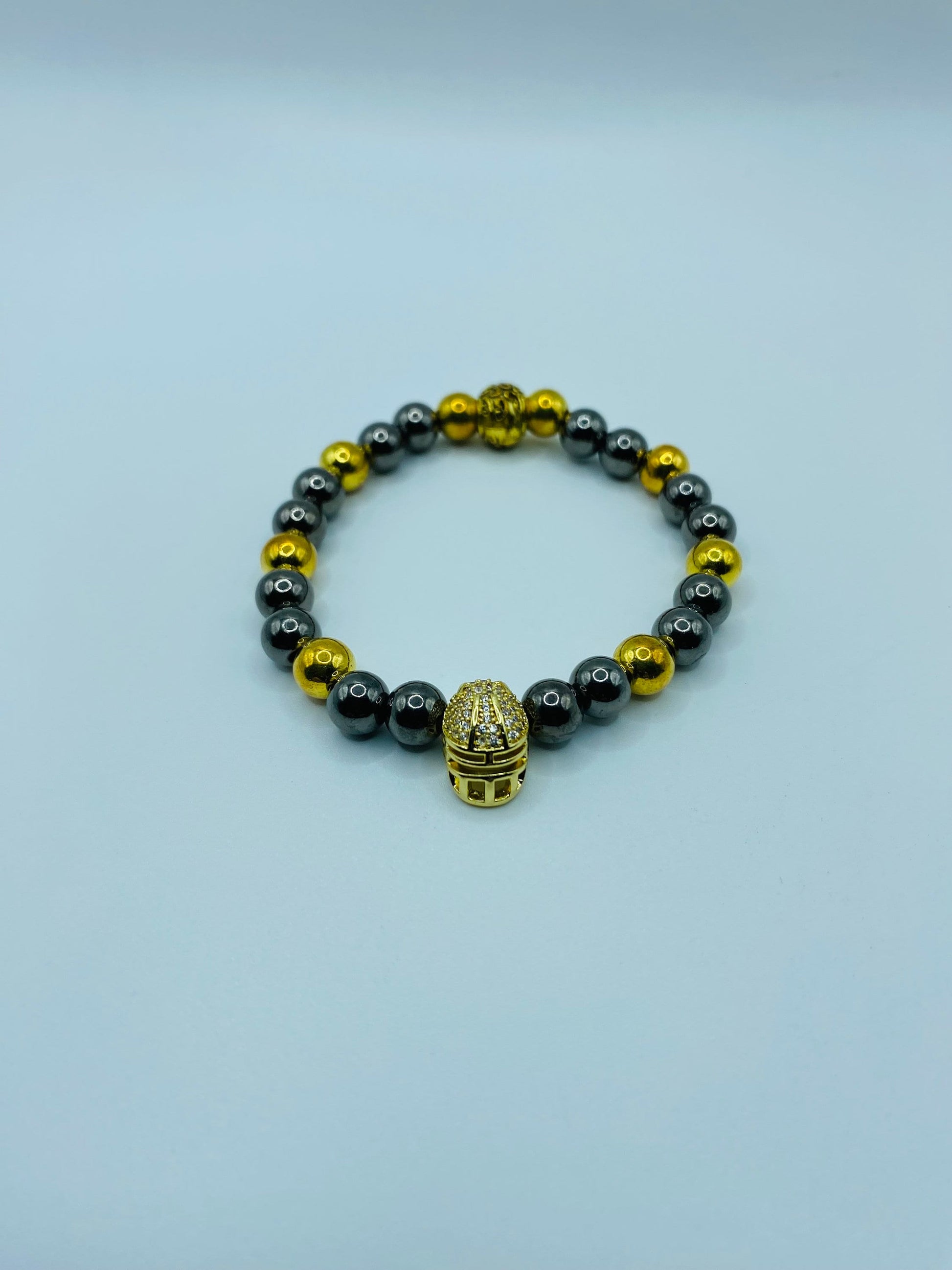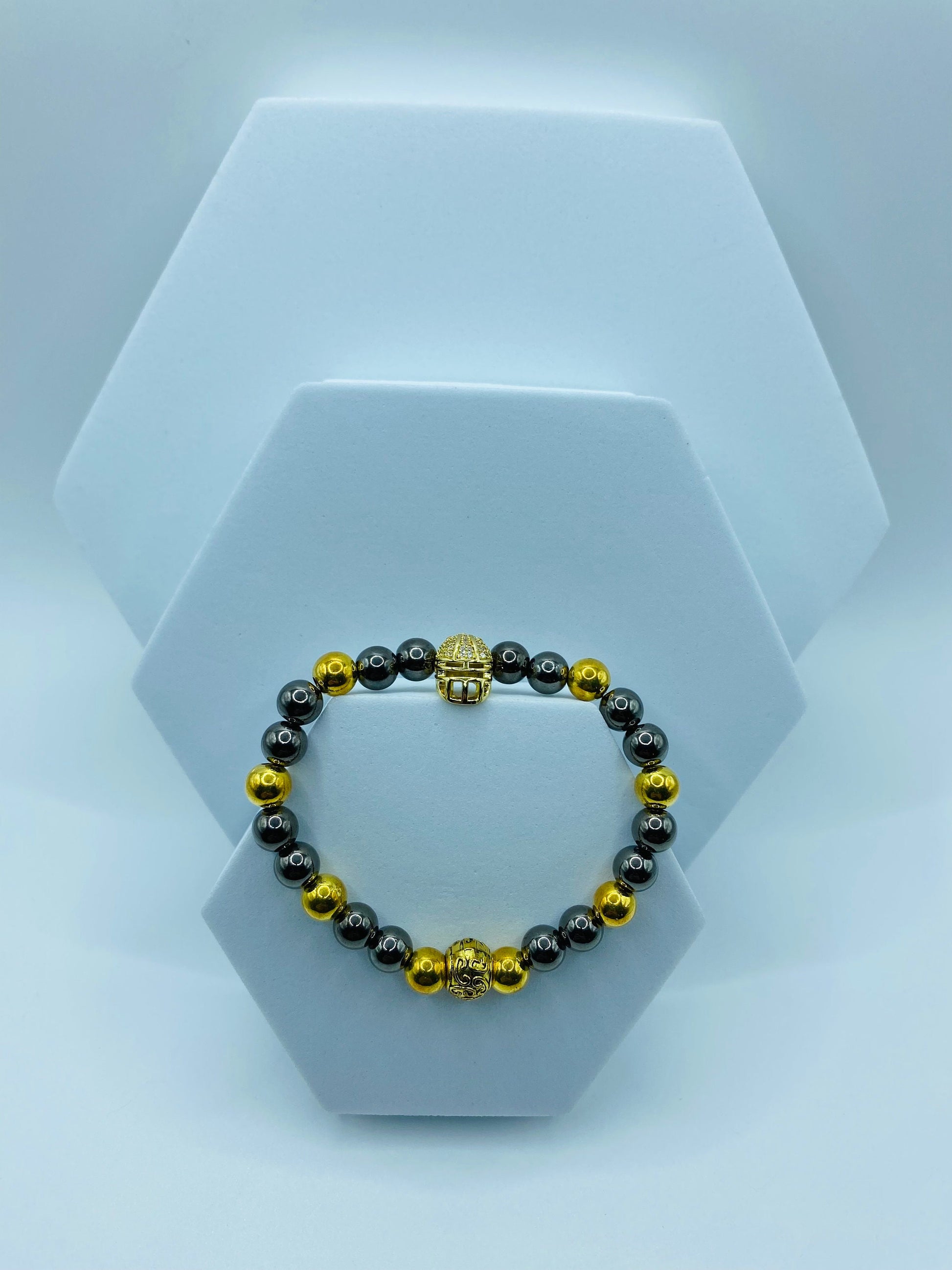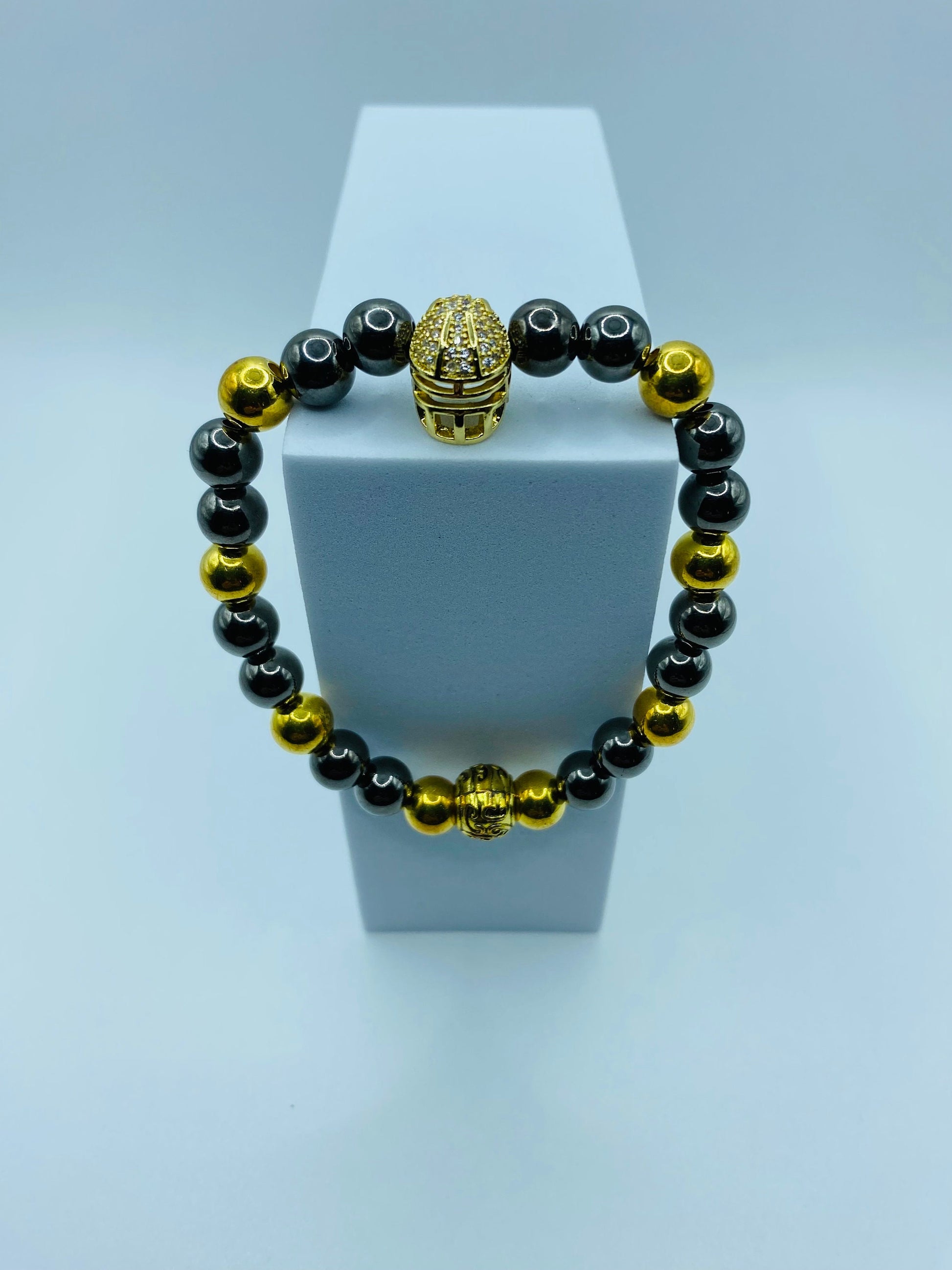 PRODUCT DETAILS - 8mm black hematite gemstone beads - 8mm 18k gold plated hematite gemstone beads - Tibetan antique gold tube spacer - Metallic gold-plated football helmet with inlaid cubic zirconia - Strong, stretchy cord - Handmade in a clean and safe environment
