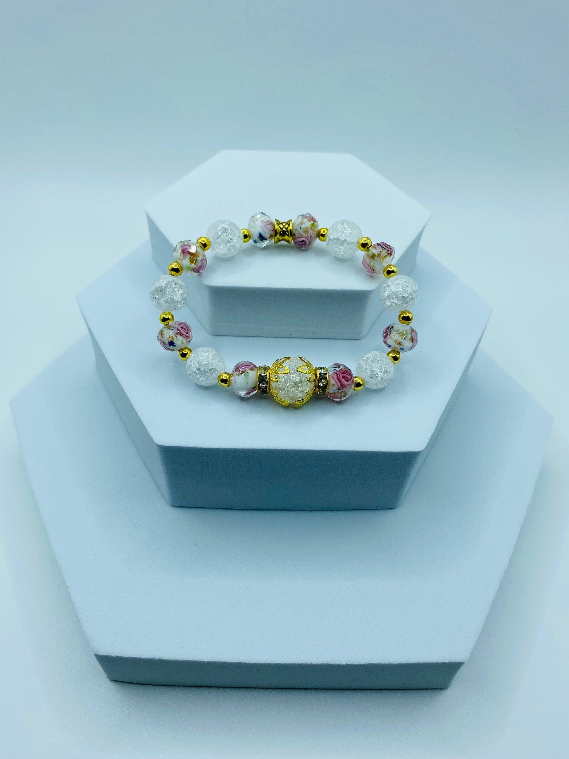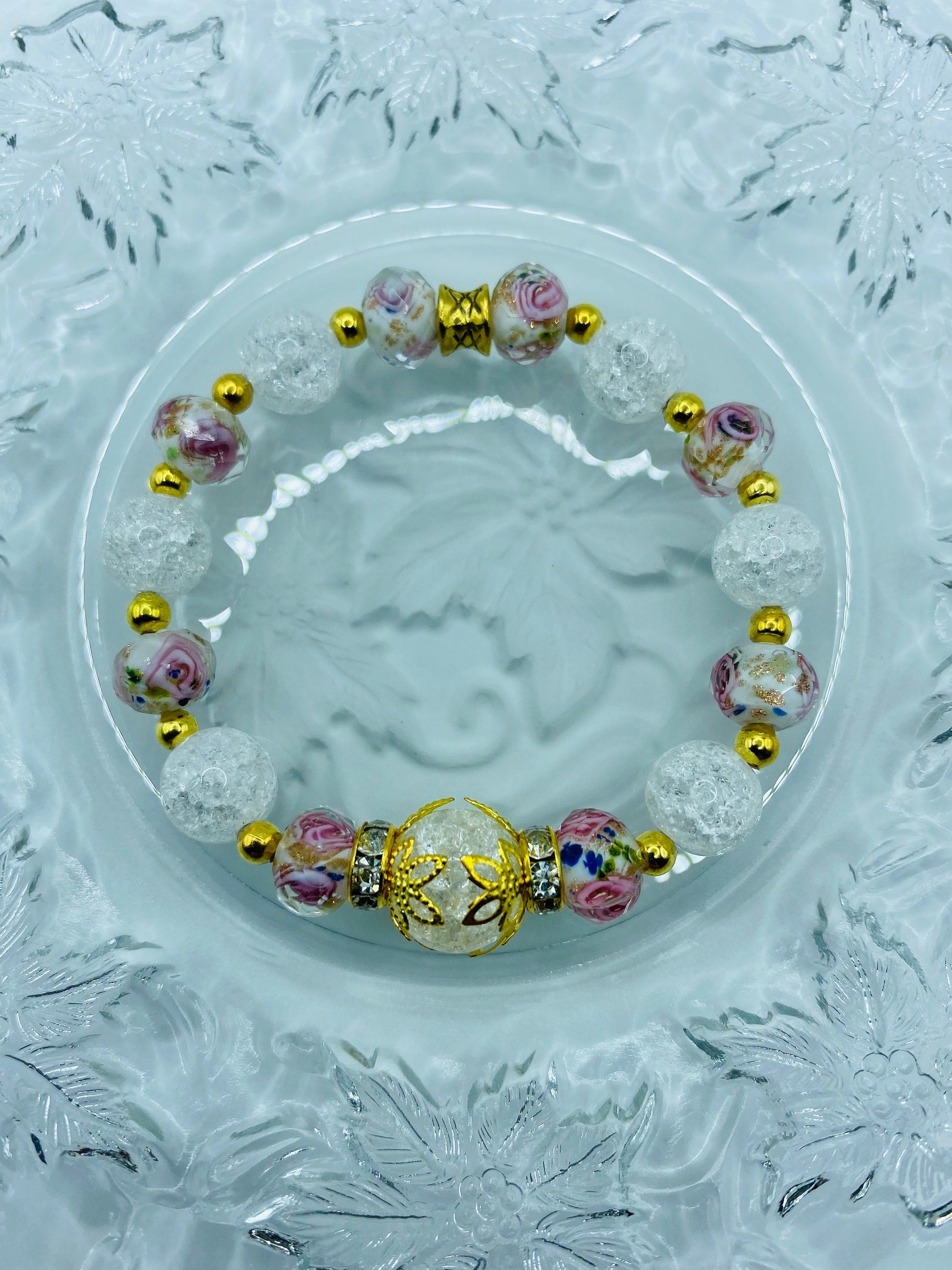 PRODUCT DETAIL - 12mm white crystal crackle quartz gemstone bead - 10mm white crystal crackle quartz gemstone beads - 10mm pink lampwork gold sand floral glass beads - 3mm gold plated round spacer beads - Gold plated rondelles with rhinestone crystals - Strong, stretchy cord - Handmade in a clean and safe environment