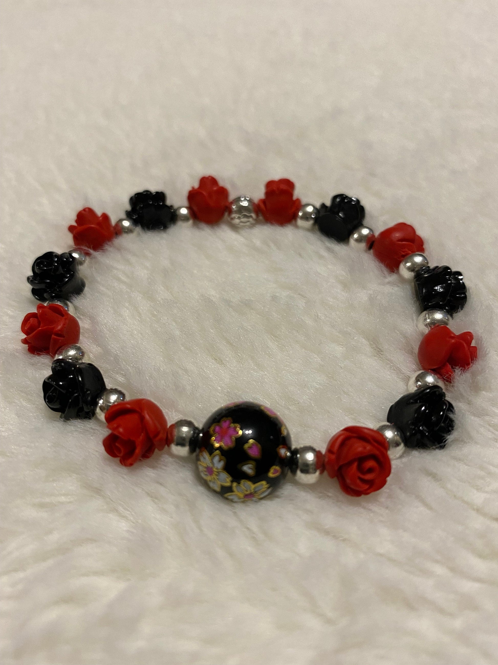 PRODUCT DETAILS - Red and Black rose floral glass bead bracelet - 12mm black floral painted goldleaf glass bead - 8mm acrylic red rose hand carved beads - 8mm acrylic black rose hand carved beads - 4mm silver plated Hematite beads - Strong, stretchy cord - Handmade in a clean and safe environment