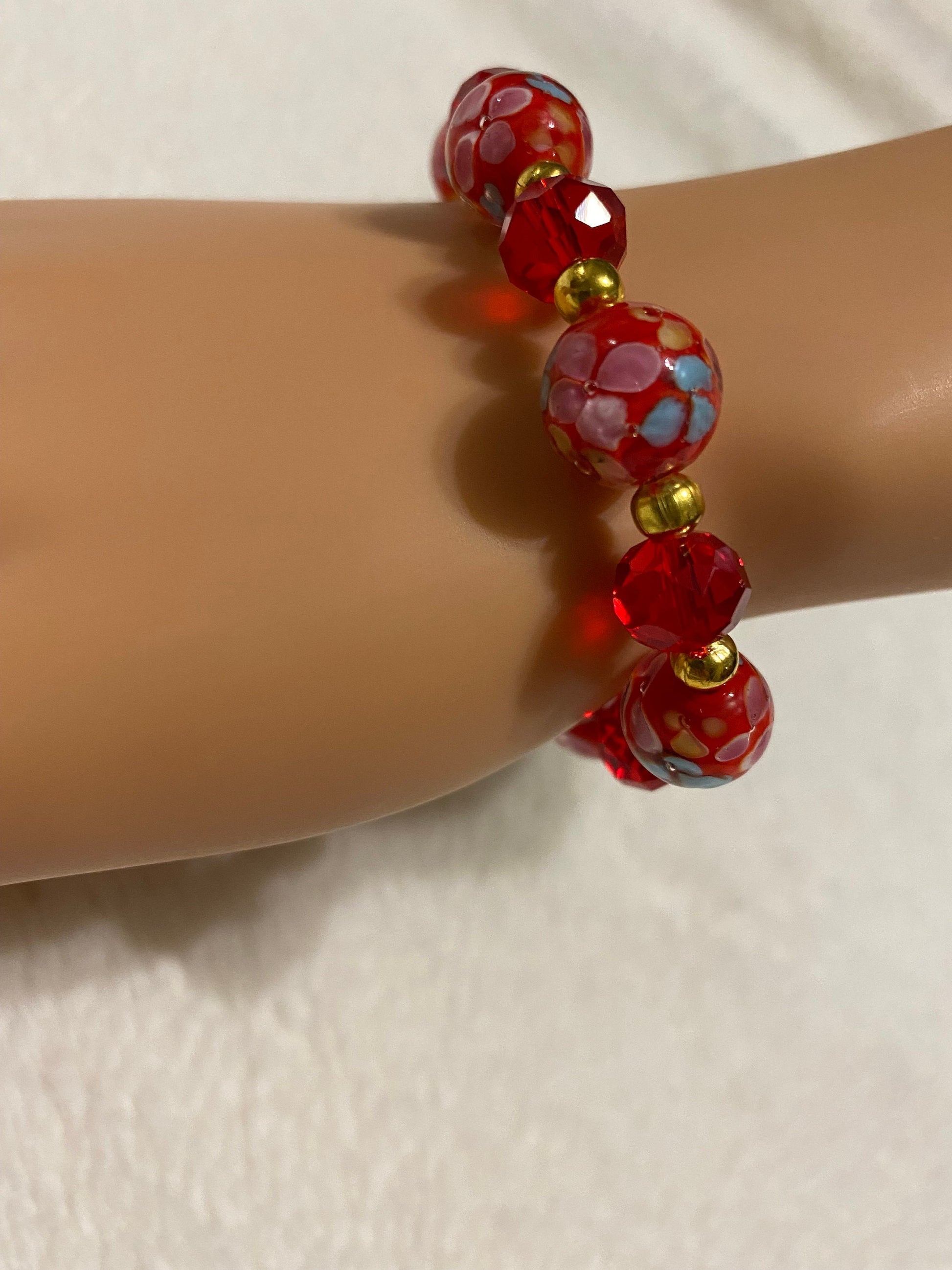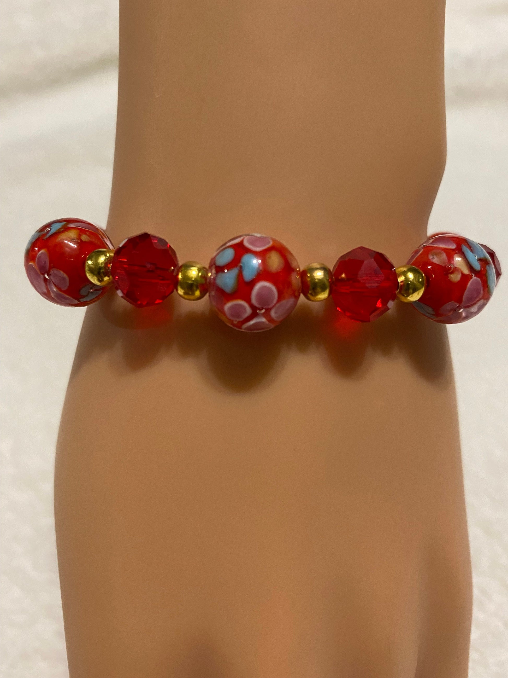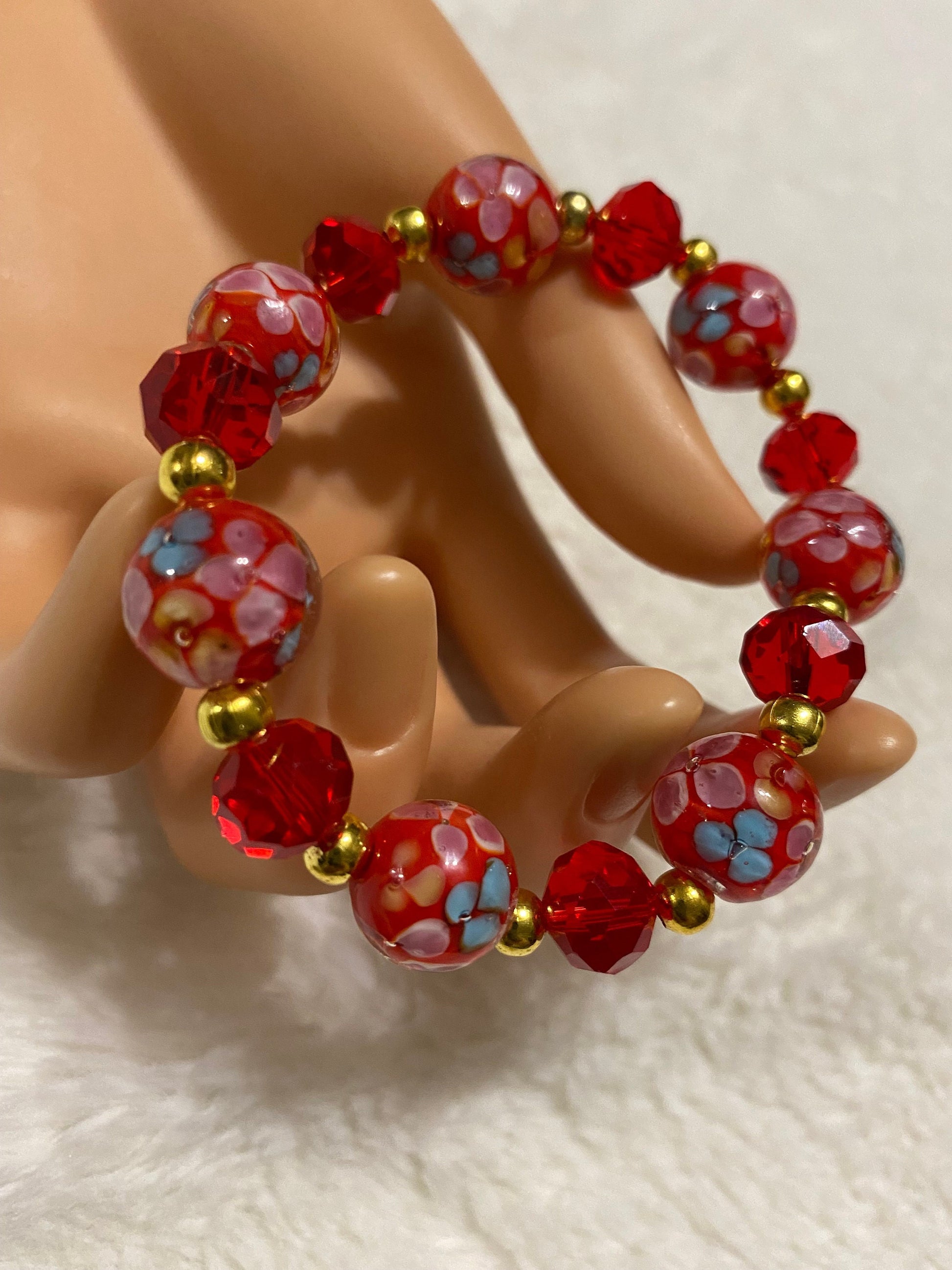 PRODUCT DETAILS - Red lampwork glass floral bracelet - 12mm red Murano lampwork floral glass beads - 10mm red faceted crystal glass beads - 4mm gold plated round Hematite beads - Strong, stretchy cord - Handmade in a clean and safe environment