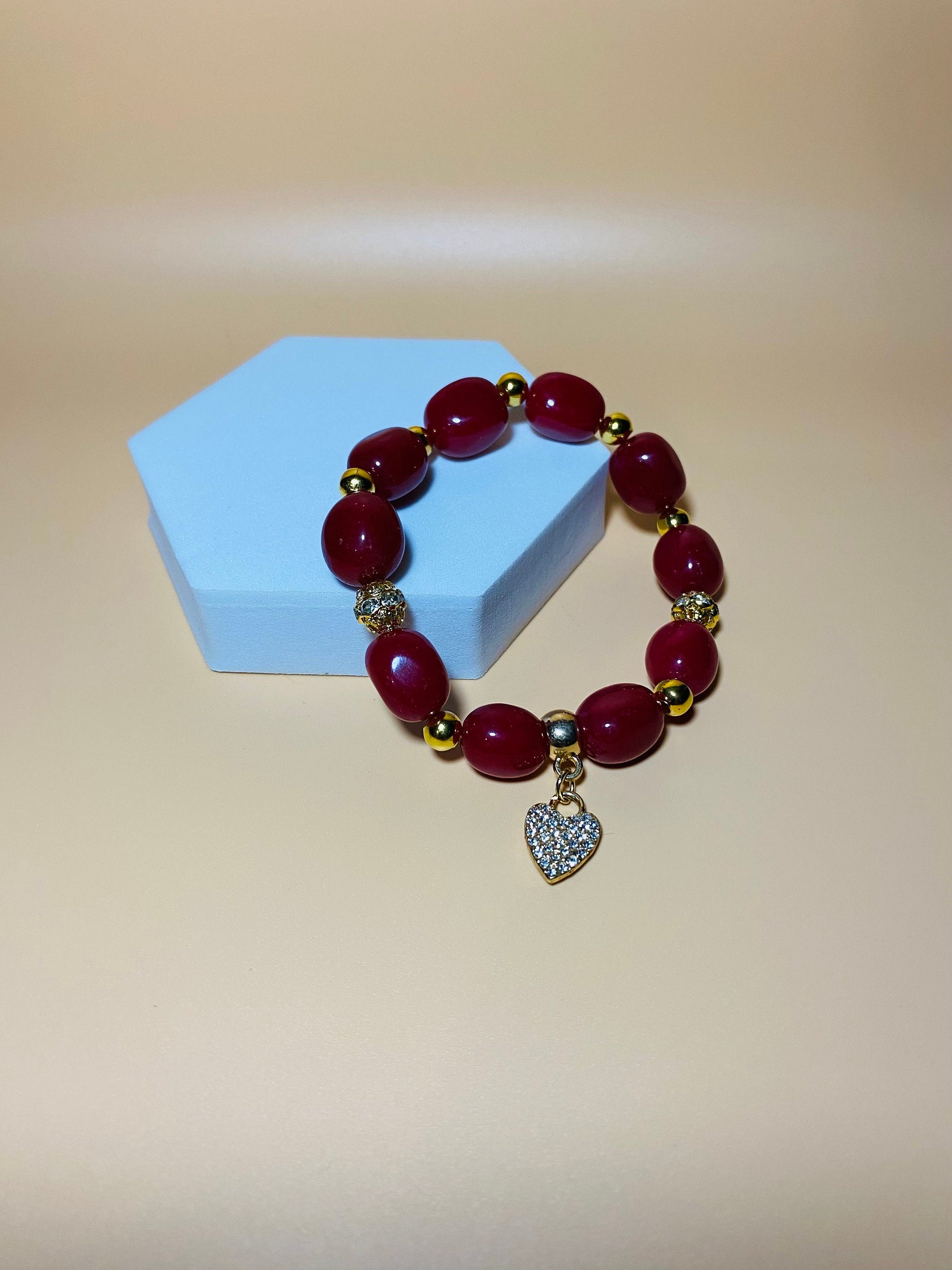 PRODUCT DETAILS : 10-16mm AA Natural Red Malaysia Jade beads freeform spacer Gemstone beads. : 18k Gold Plated Charm Holder with Inlaid Rhinestone Crystal Heart Pendant : 18k Gold Plated Hollow Spacer Beads with Sparkling Rhinestones. : 5mm 18k Gold Plated Round Spacer Beads. : Strong Stretchy Elastic Cord. : Handmade in a Clean and Safe Environment.