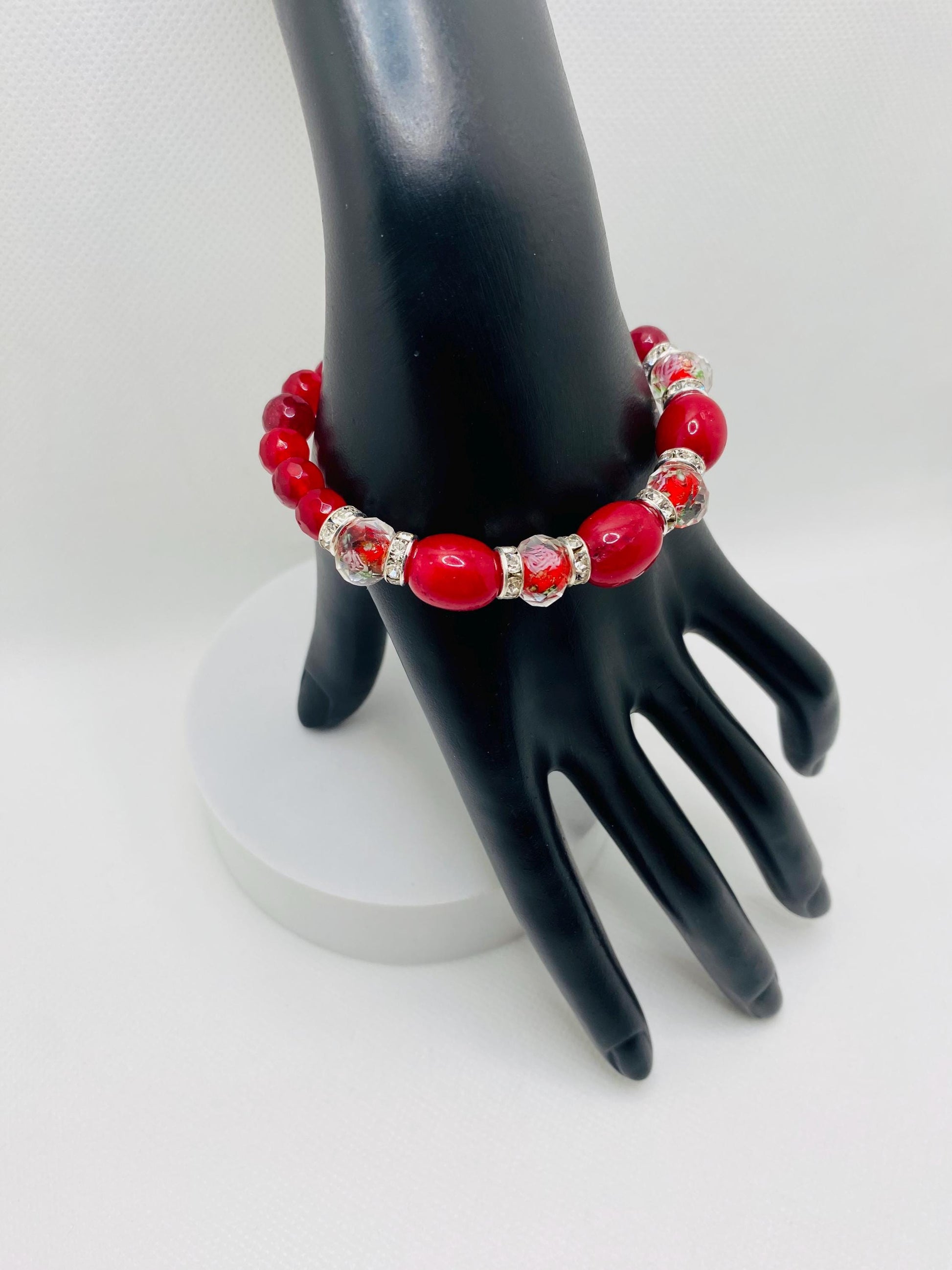 PRODUCT DETAILS : 10-16mm AA Natural Red Malaysia Jade beads freeform spacer Gemstone beads. : 9x10mm Red Floral Lampwork Glass beads. : 8mm Natural Red Faceted Agate Gemstone Beads. : 8mm Silver Plated Rhinestone Rondelle Spacer Beads. : Strong Stretchy Elastic Cord. : Handmade in a Clean and Safe Environment.