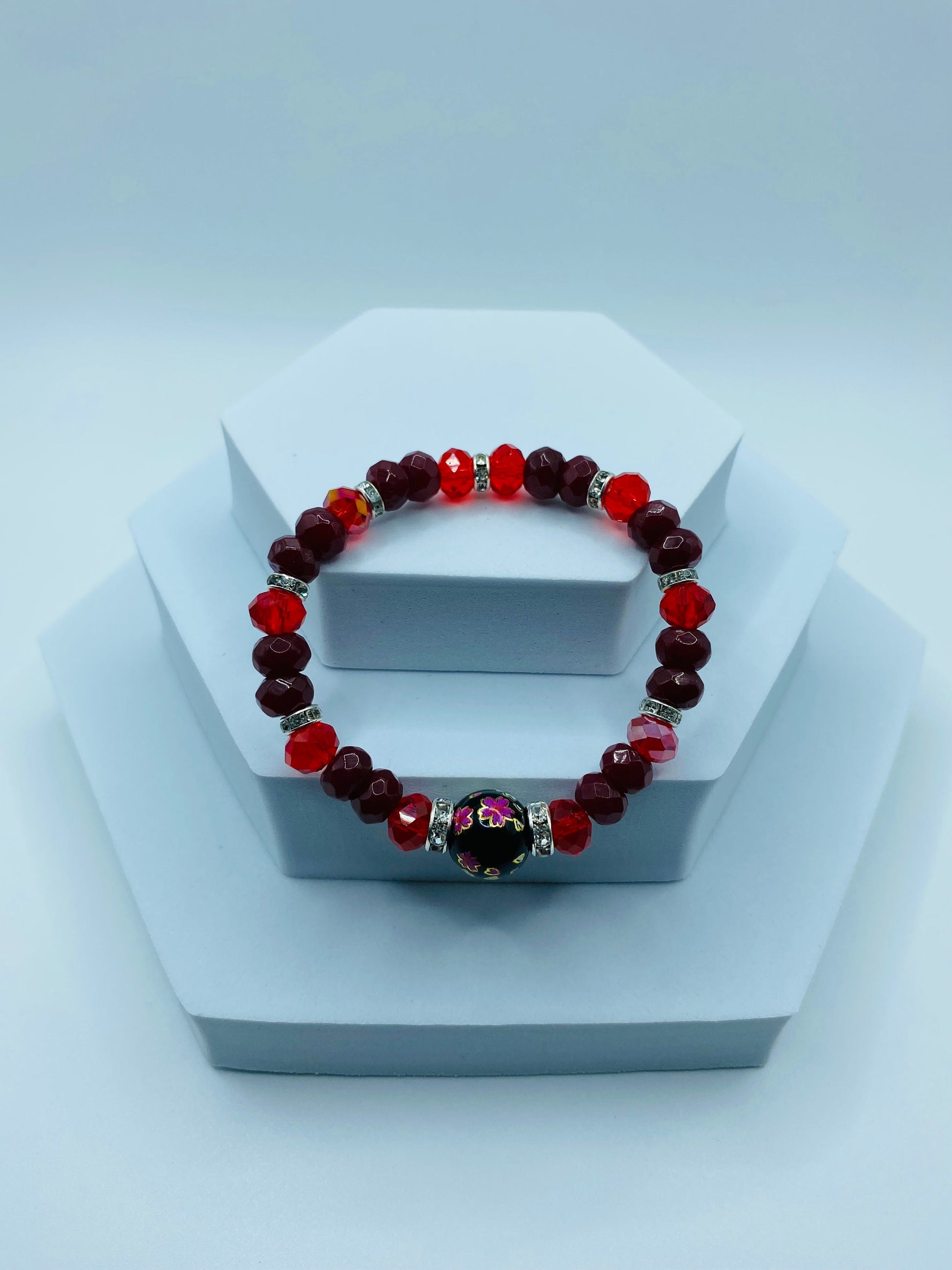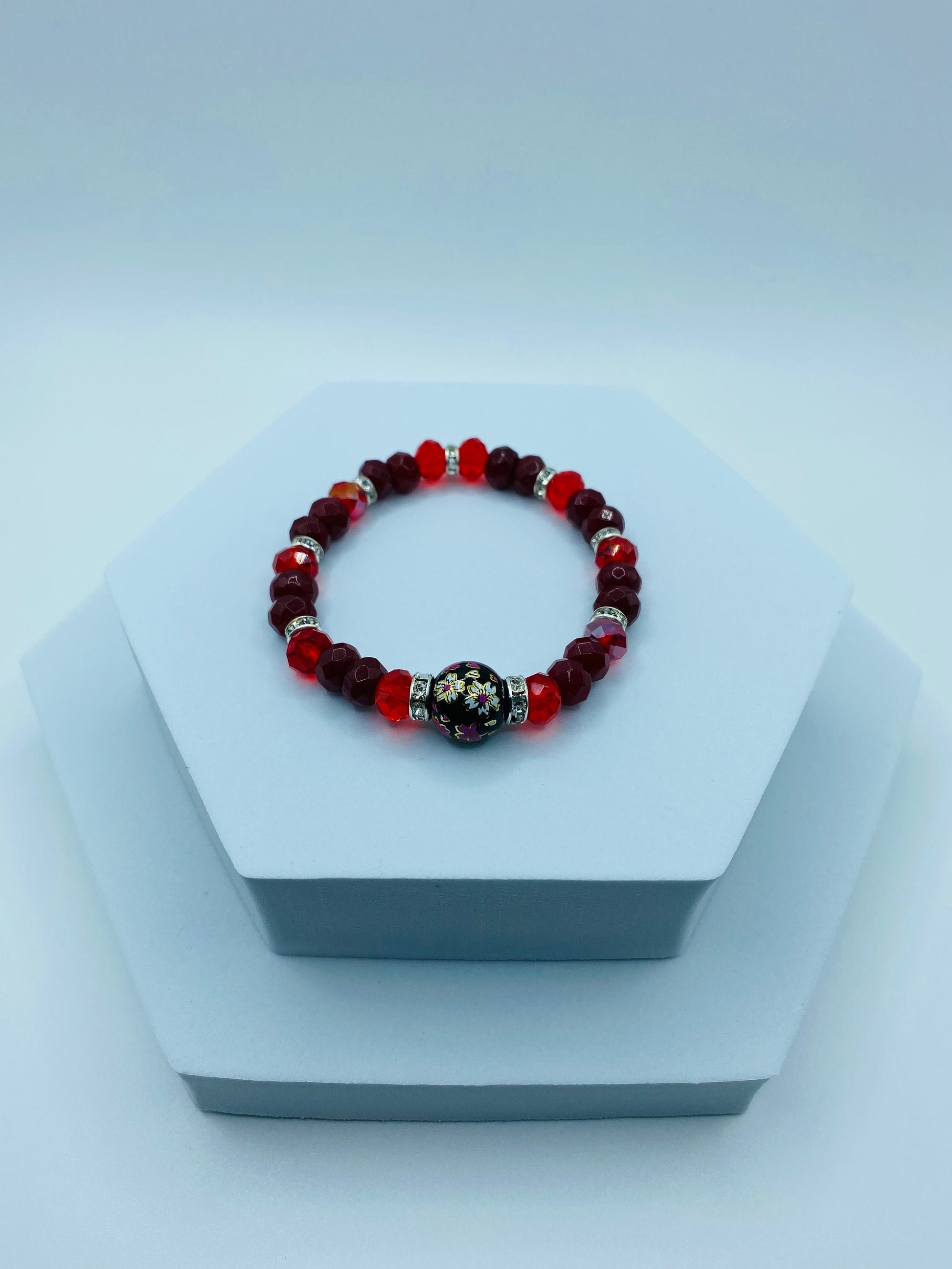 Red Jade & Crystal Beaded Bracelet with Floral Painted Glass Bead