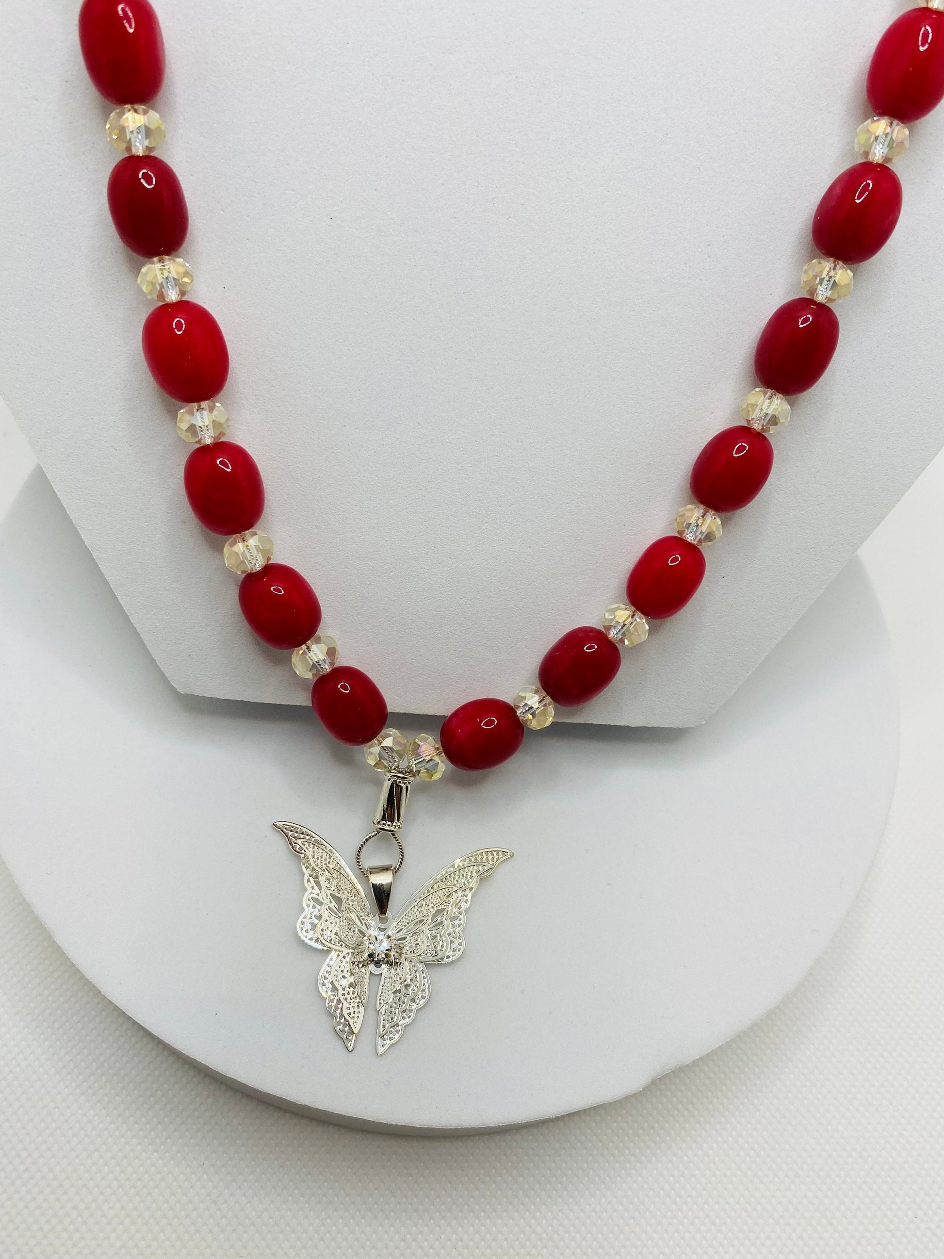 Add a touch of bohemian elegance to your look with this stunning Red Jade Necklace featuring a Silver Butterfly Pendant and Crystal Glass Beads. Handcrafted for women who embrace unique and beautiful jewelry pieces, this necklace will effortlessly elevate any outfit. Perfect for adding a pop of color and charm to your wardrobe, this one-of-a-kind accessory is a must-have for any jewelry lover.