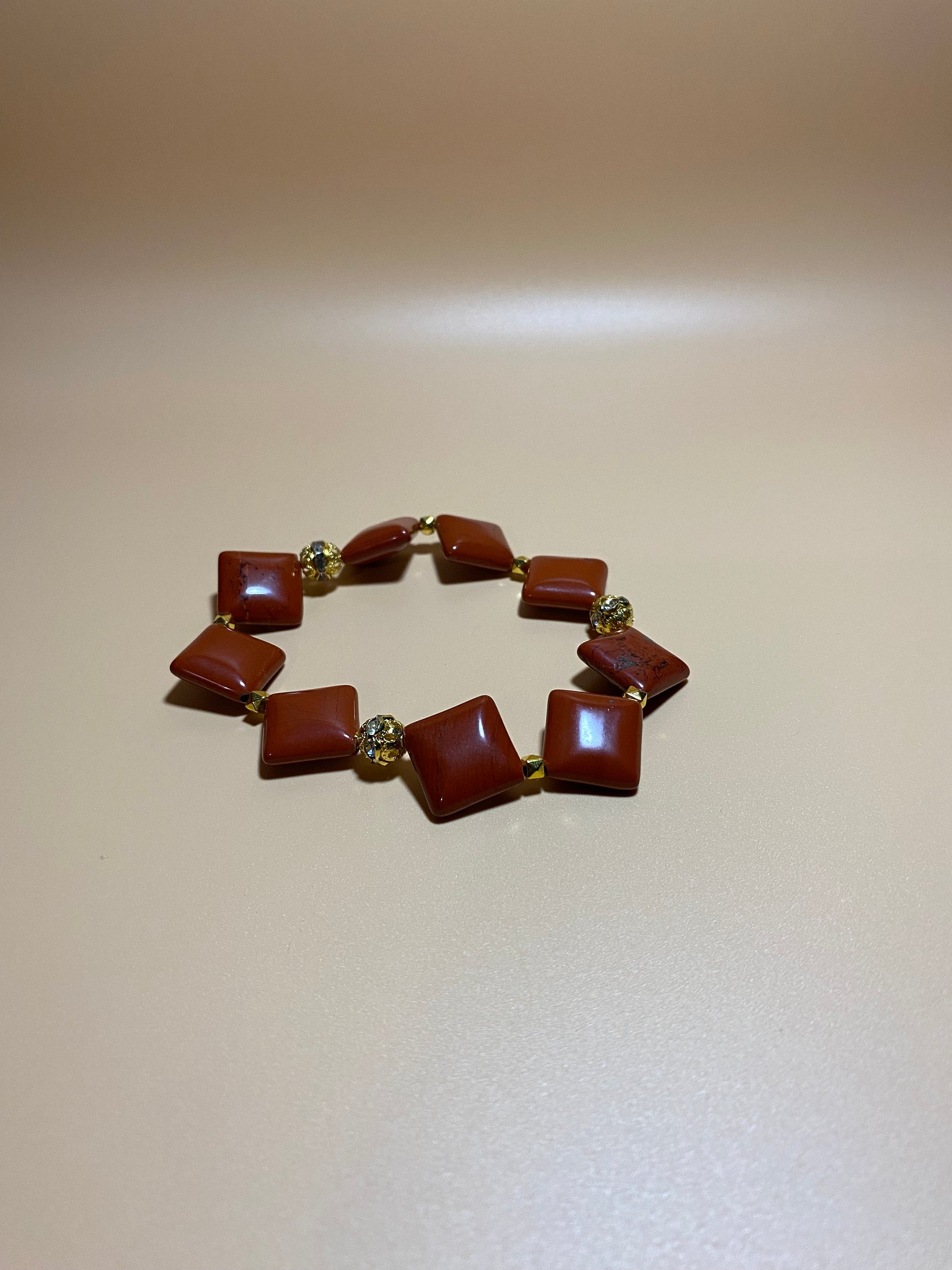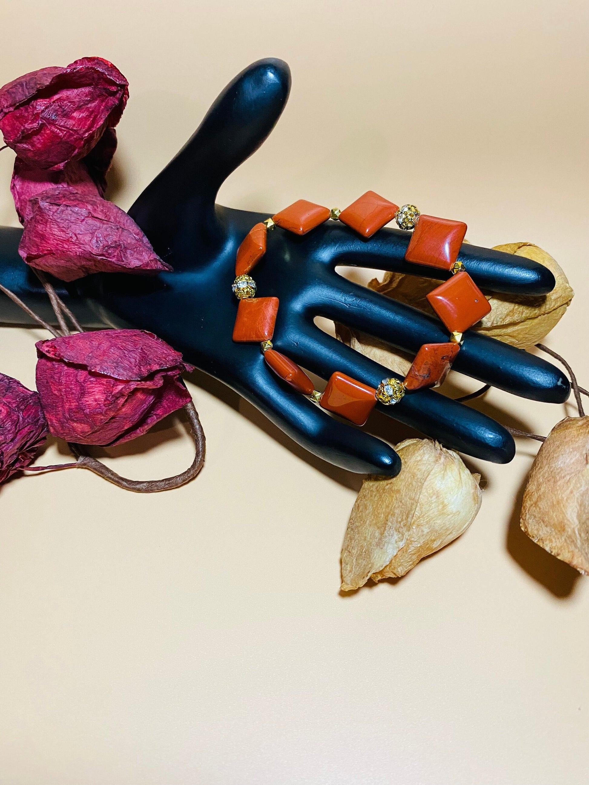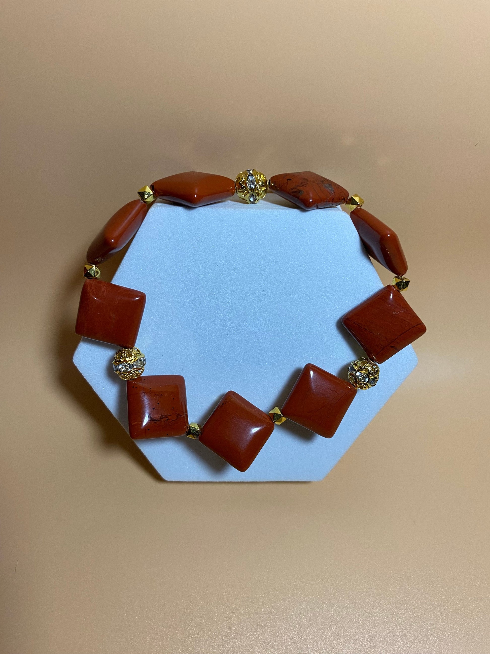 PRODUCT DETAILS : 16mm Natural Genuine Red Jasper Diagonally Power Energy Gemstone Beads. : 18k Gold Plated Hollow Beads with Rhinestone Crystals : 18k Gold Plated Square Spacer Beads. : Strong Stretchy Elastic Cord. : Handmade in a Clean and Safe Environment.