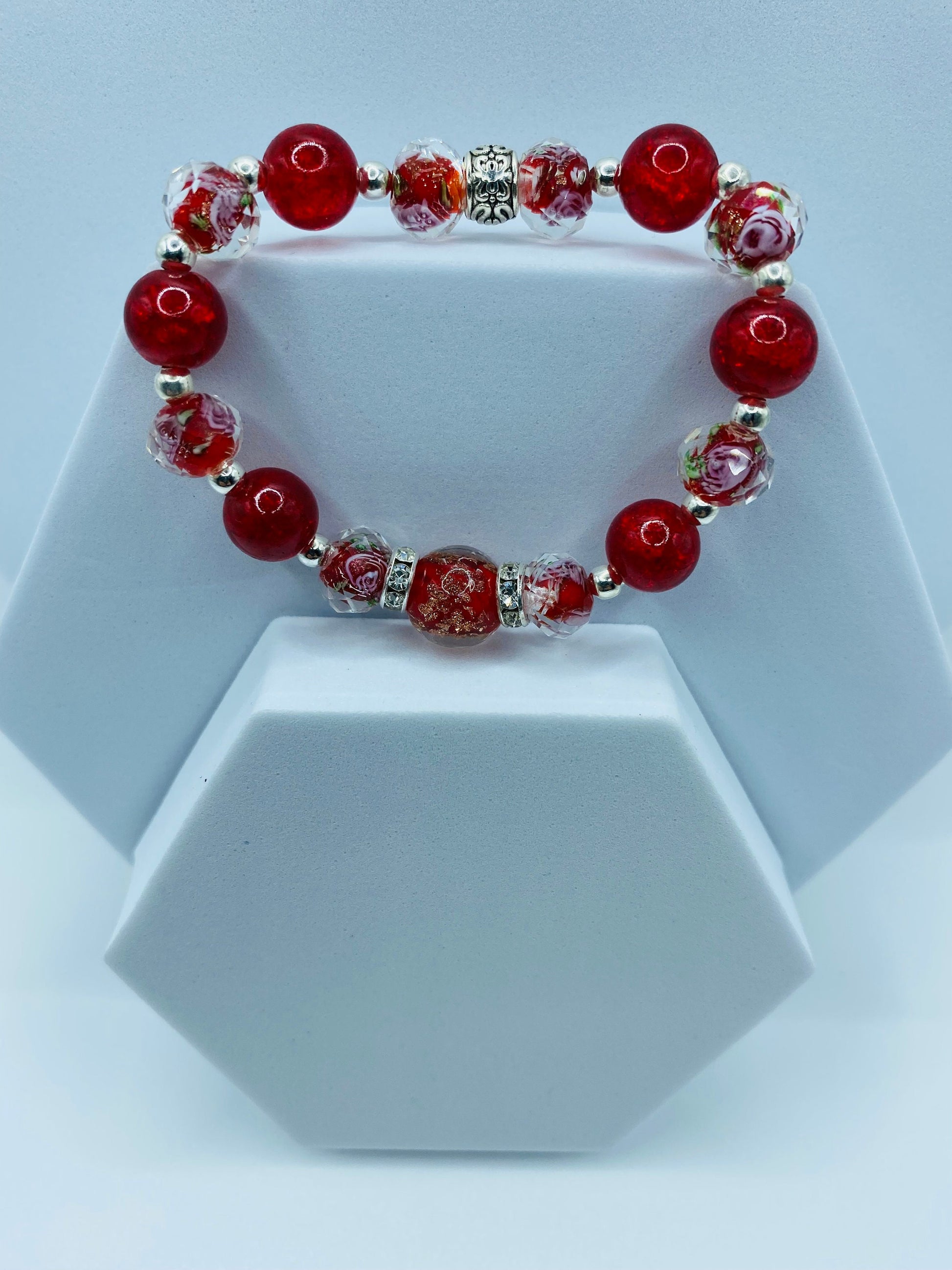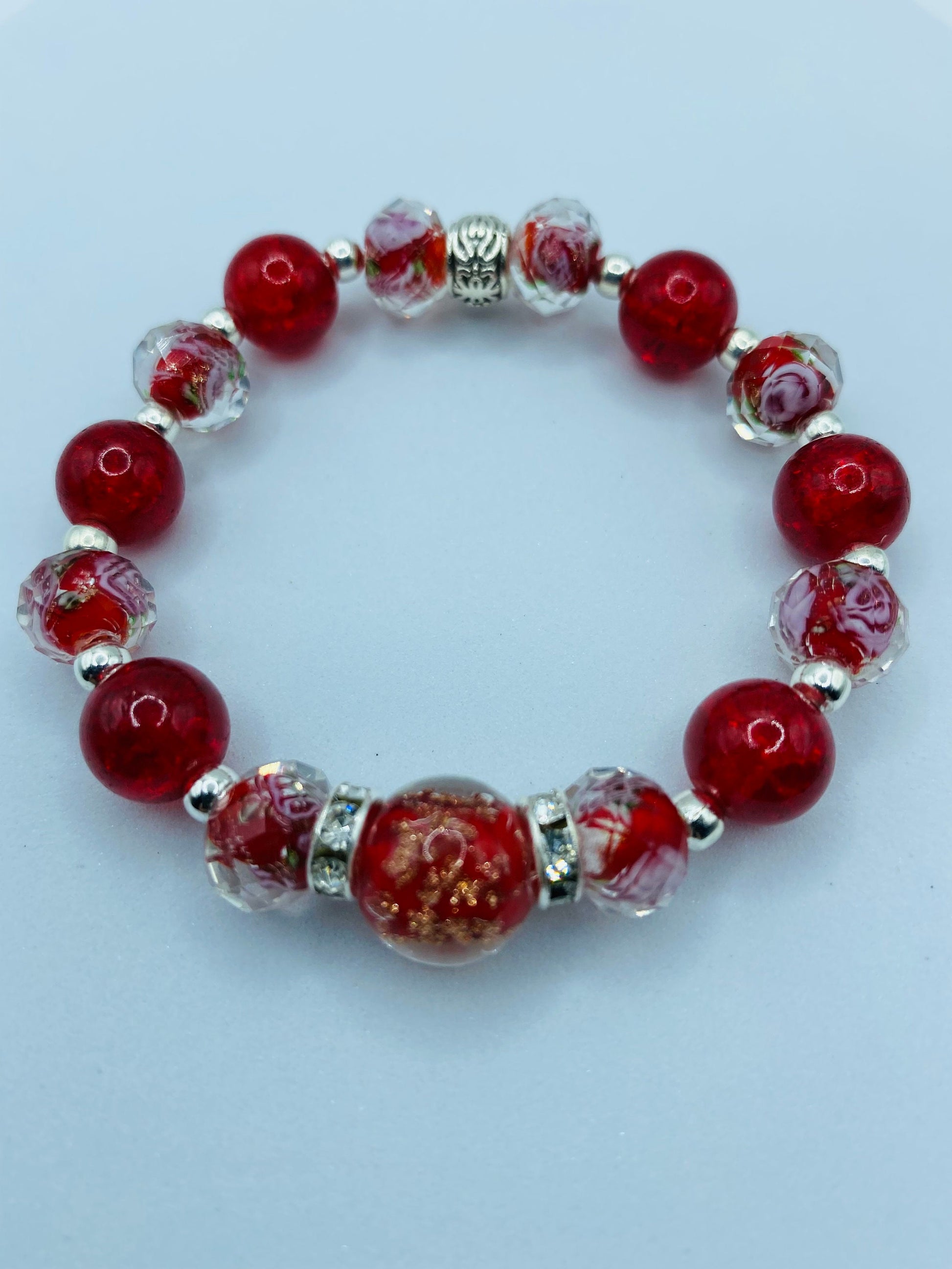 PRODUCT DETAIL - 12mm red gold sand lampwork glass bead - 10mm red crackle lampwork glass beads - 10mm red lampwork gold sand floral glass beads - 3mm silver plated Hematite beads - silver plated rondelles with rhinestone crystals - Antique silver Tibetan spacer bead - Strong, stretchy cord - Handmade in a clean and safe environment