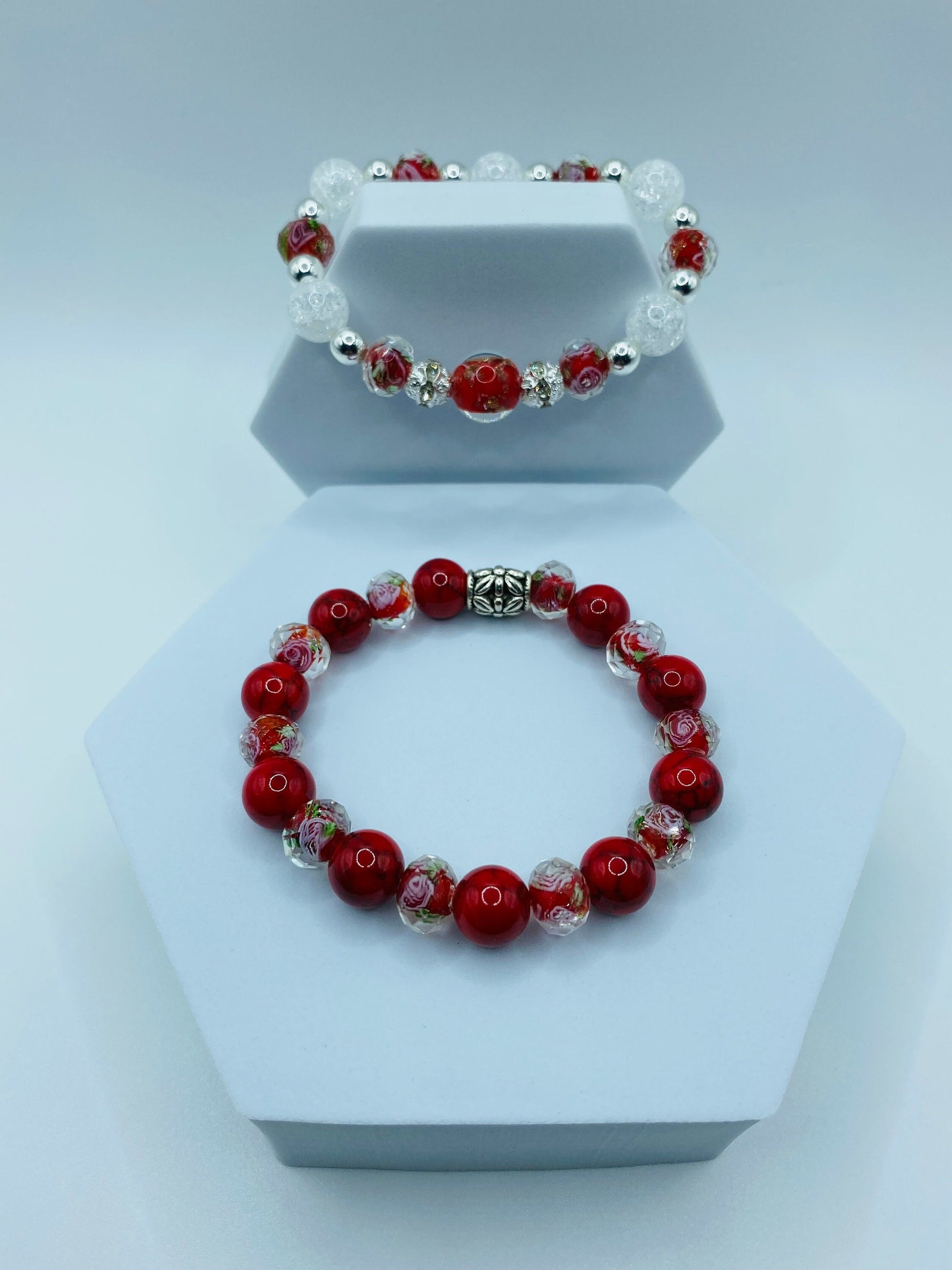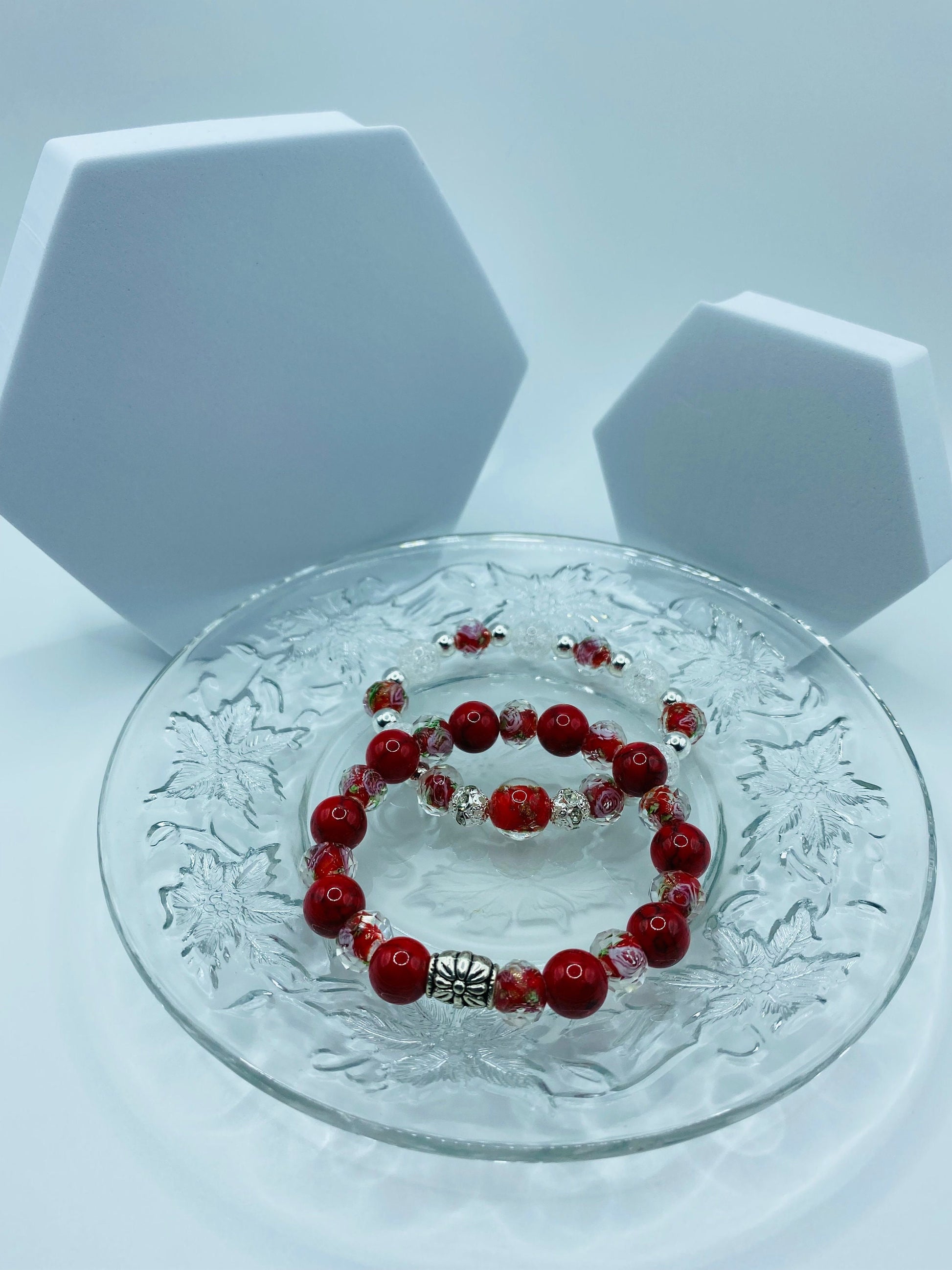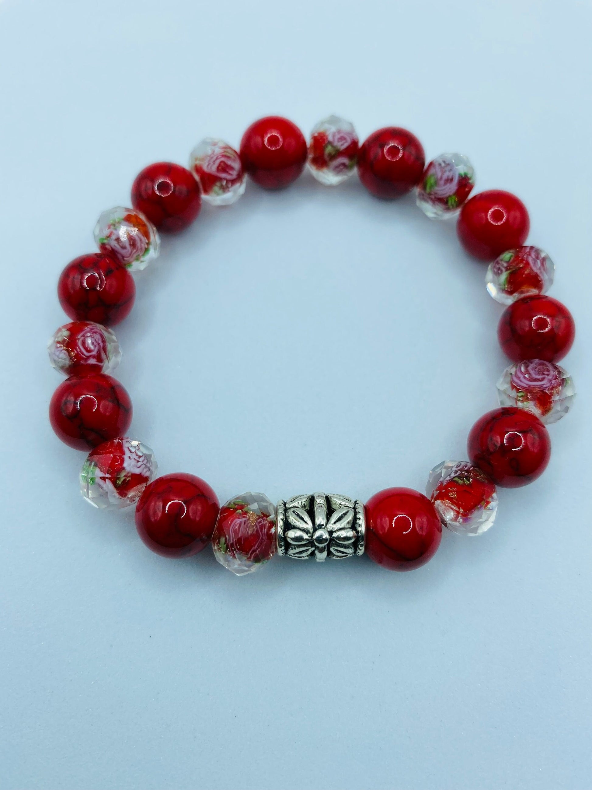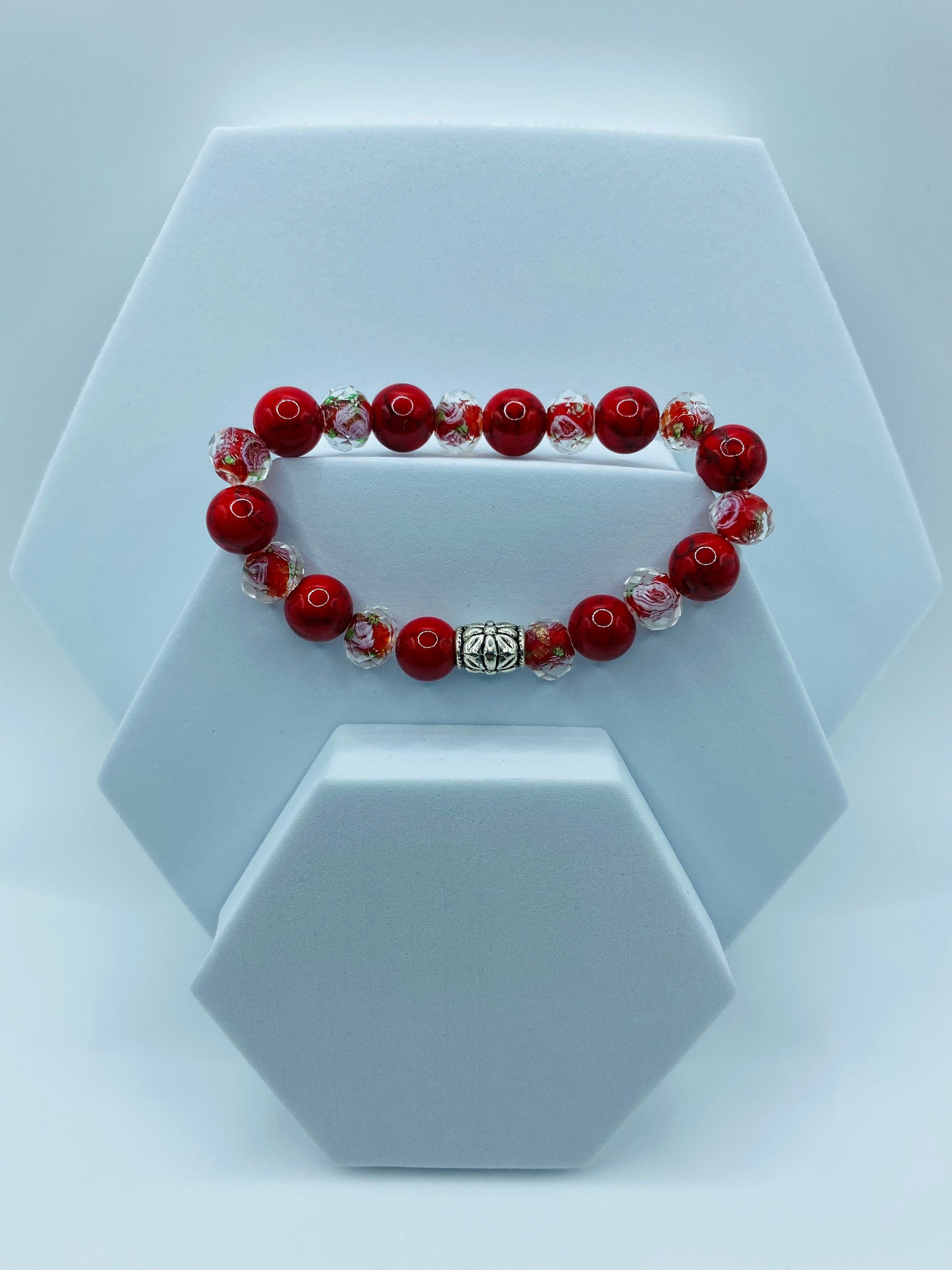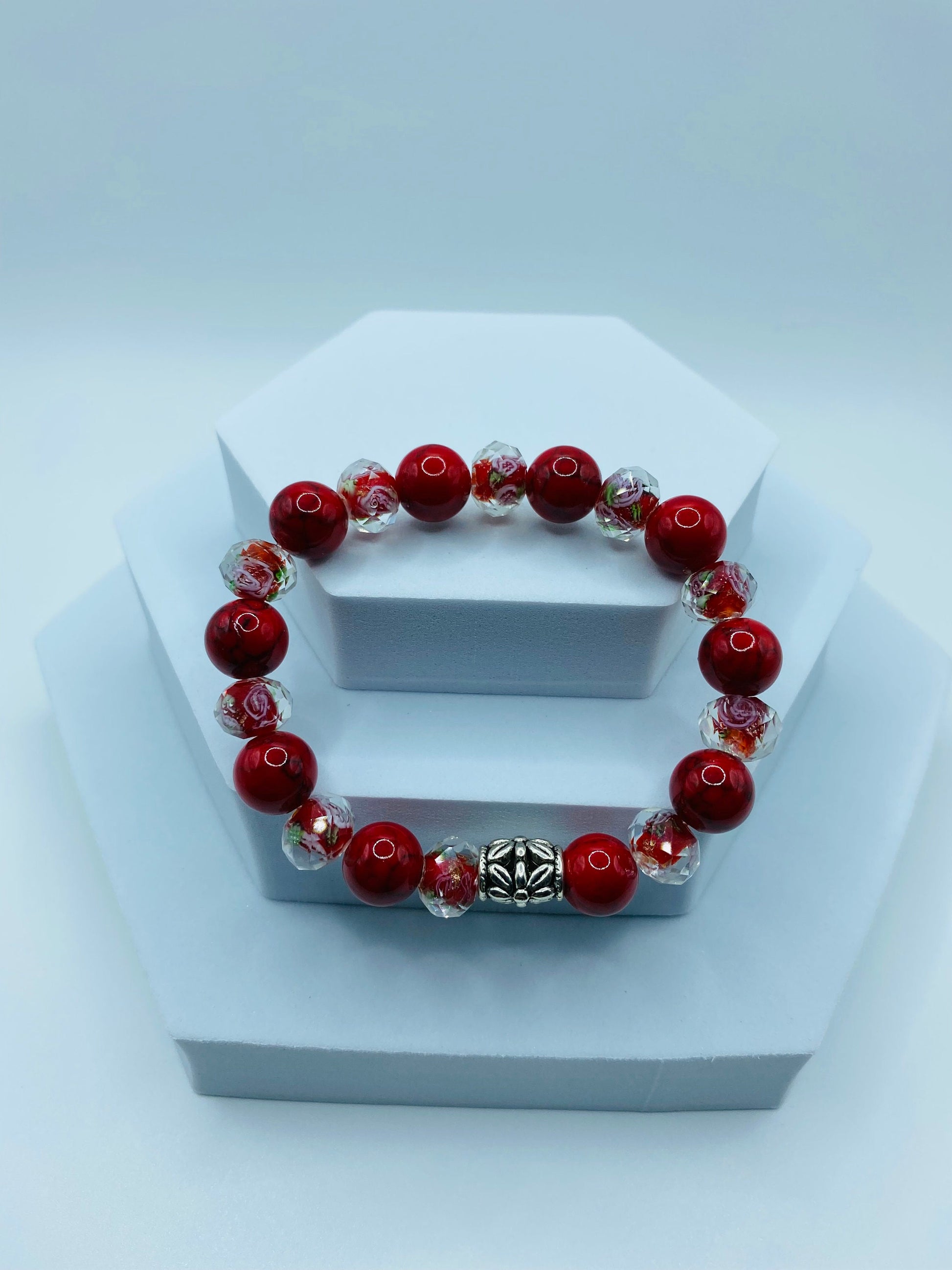 PRODUCT DETAILS - 10mm red turquoise gemstone beads - 10mm red floral lampwork glass beads - Antique silver floral tube bead charm - Strong, stretchy cord - Handmade in a clean and safe environment
