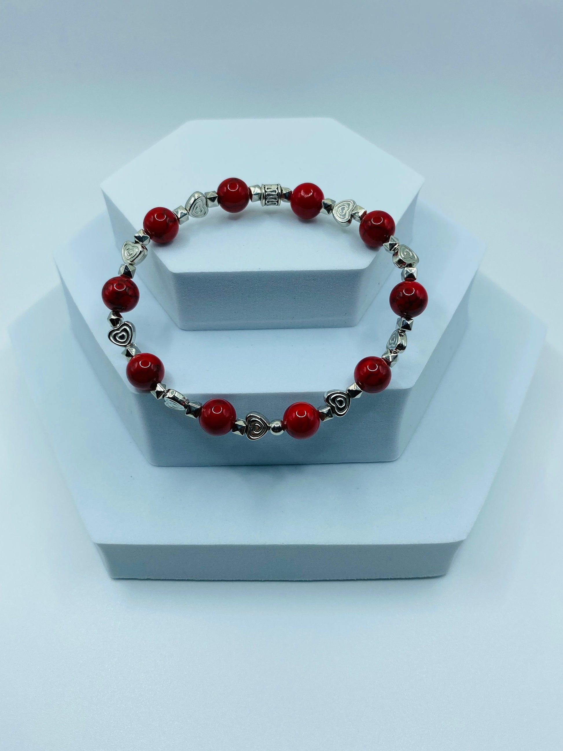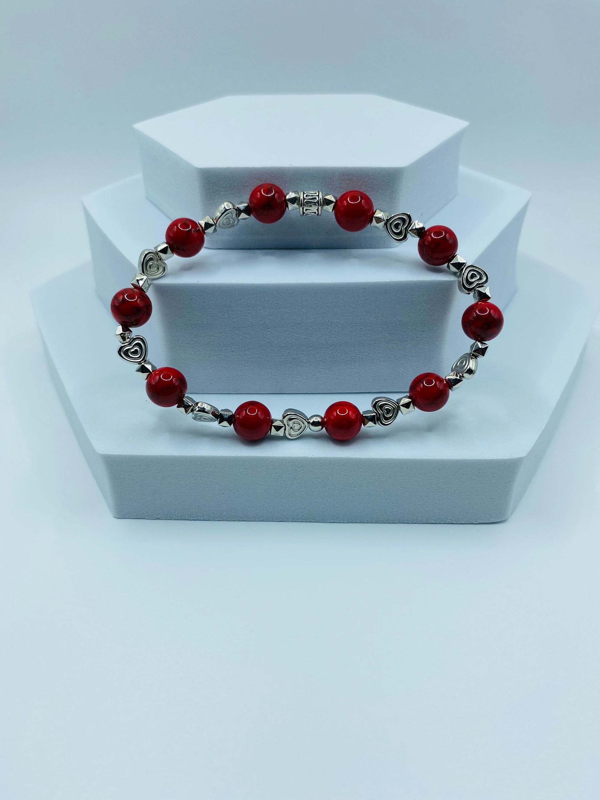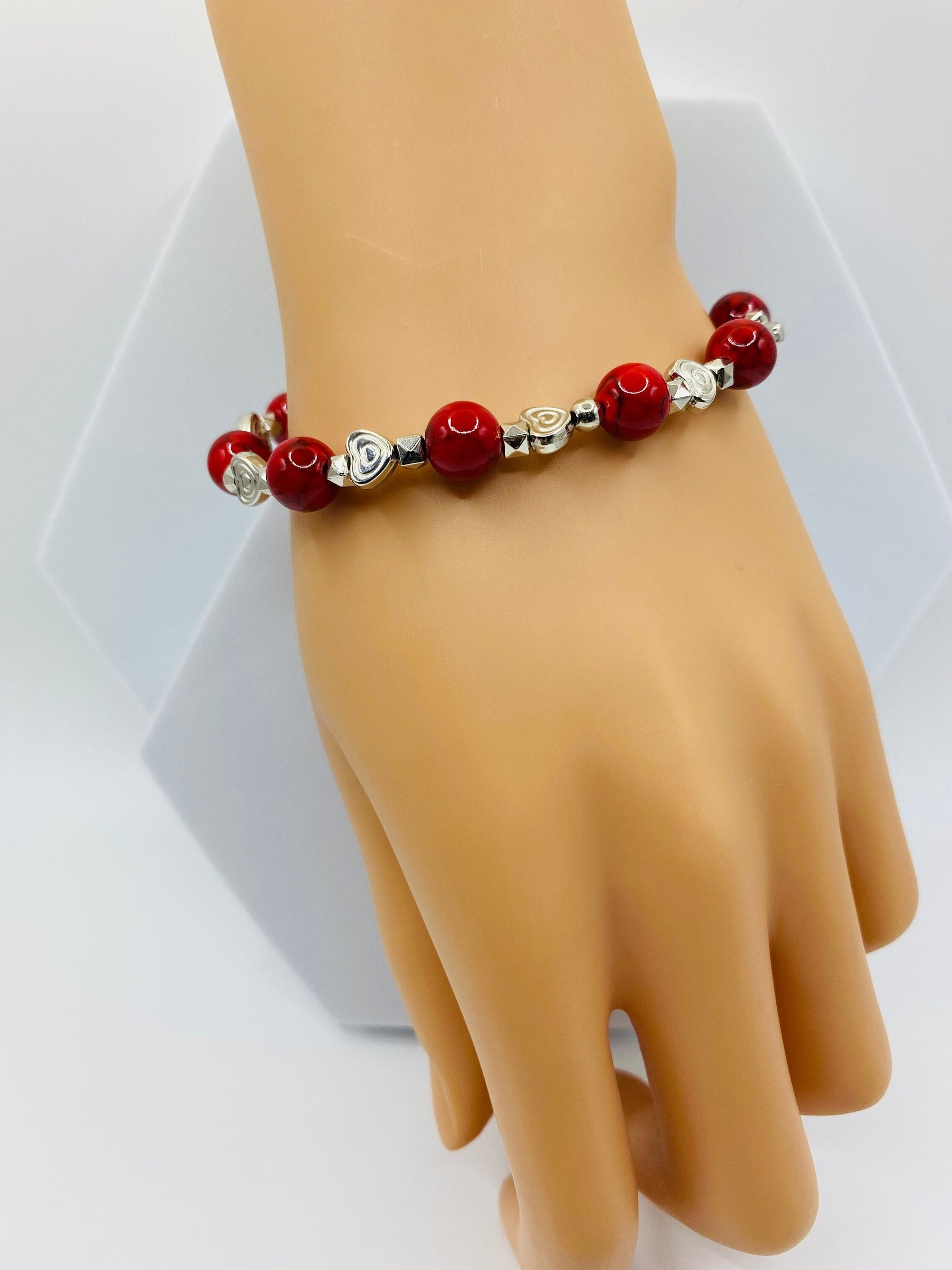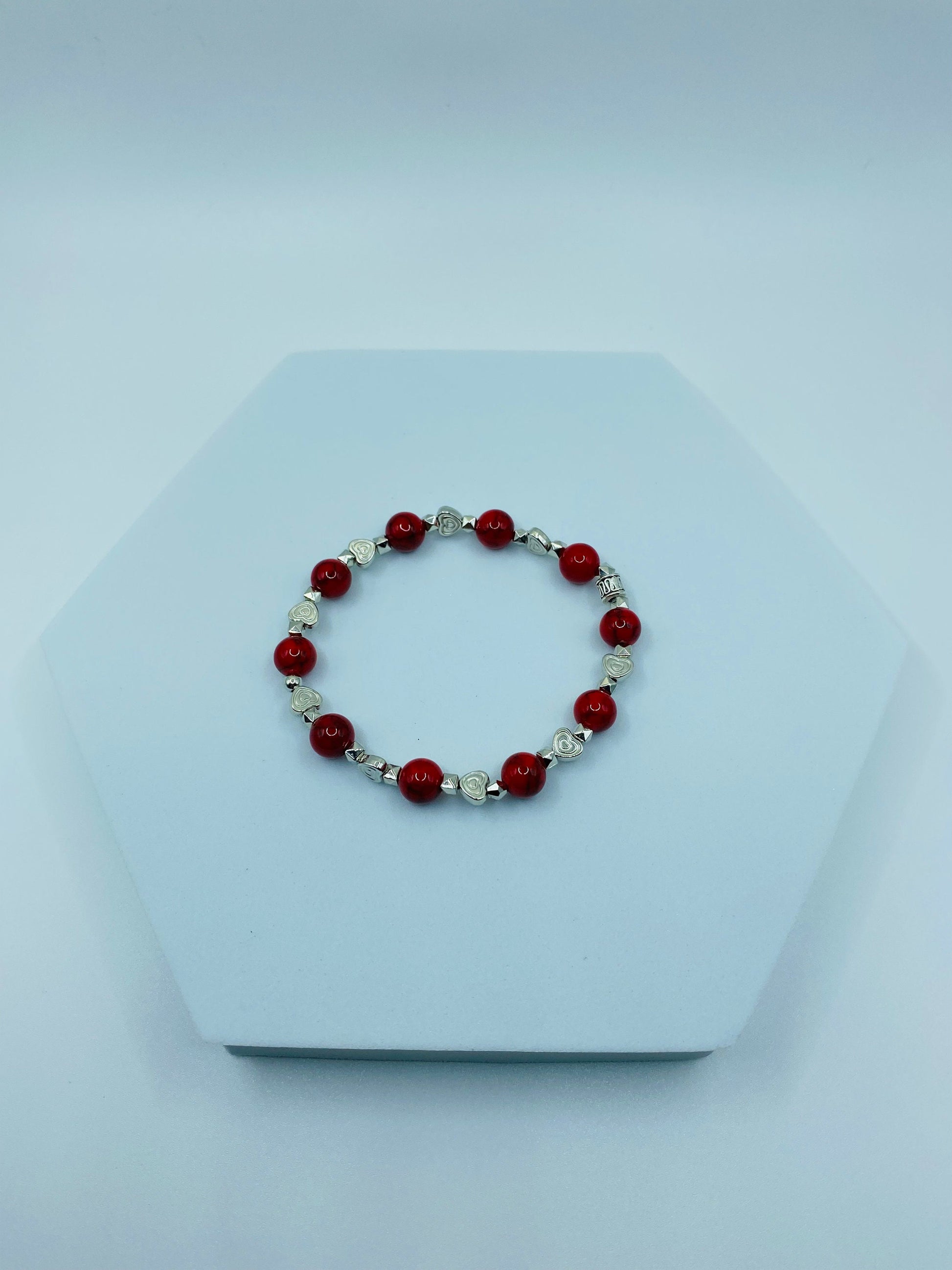 PRODUCT DETAILS - Turquoise with white gold hearts beaded bracelet - 8mm Red Turquoise gemstone bead - 6mm real white gold heart beads - 2mm silver plated round spacer beads - Strong, stretchy cord - Handmade in a clean and safe environment