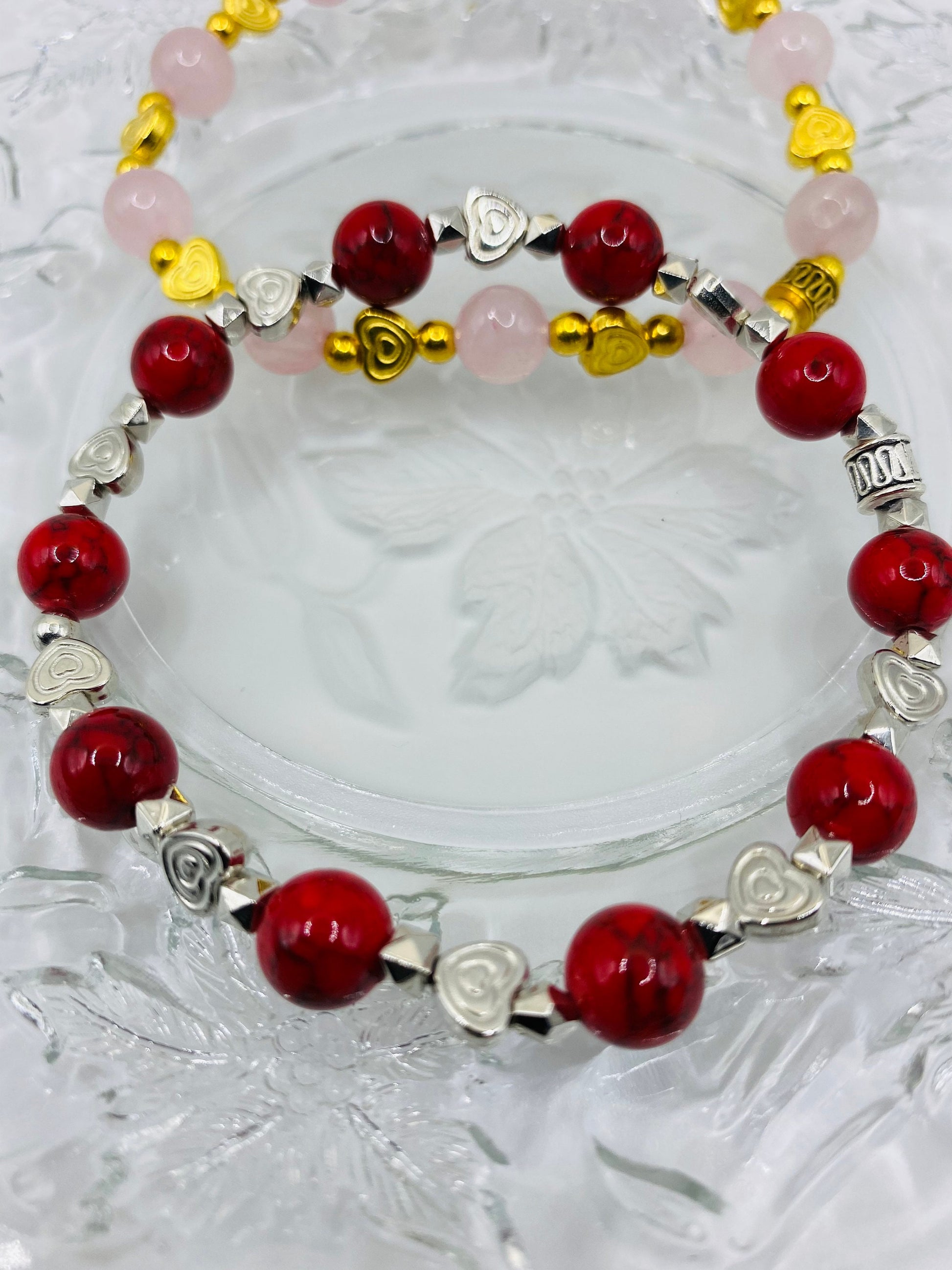 Add a touch of elegance to your outfit with this stunning Turquoise, Red Bracelet featuring beautiful White Gold Heart Charms and Spacers. This Love Bracelet is perfect for expressing your love and adding a pop of color to your look. Handcrafted with care, it makes a thoughtful gift for yourself or a loved one. Stand out with this unique and eye-catching accessory that is sure to make a statement. This love bracelet is perfect for adding a touch of whimsy and romance to your look.