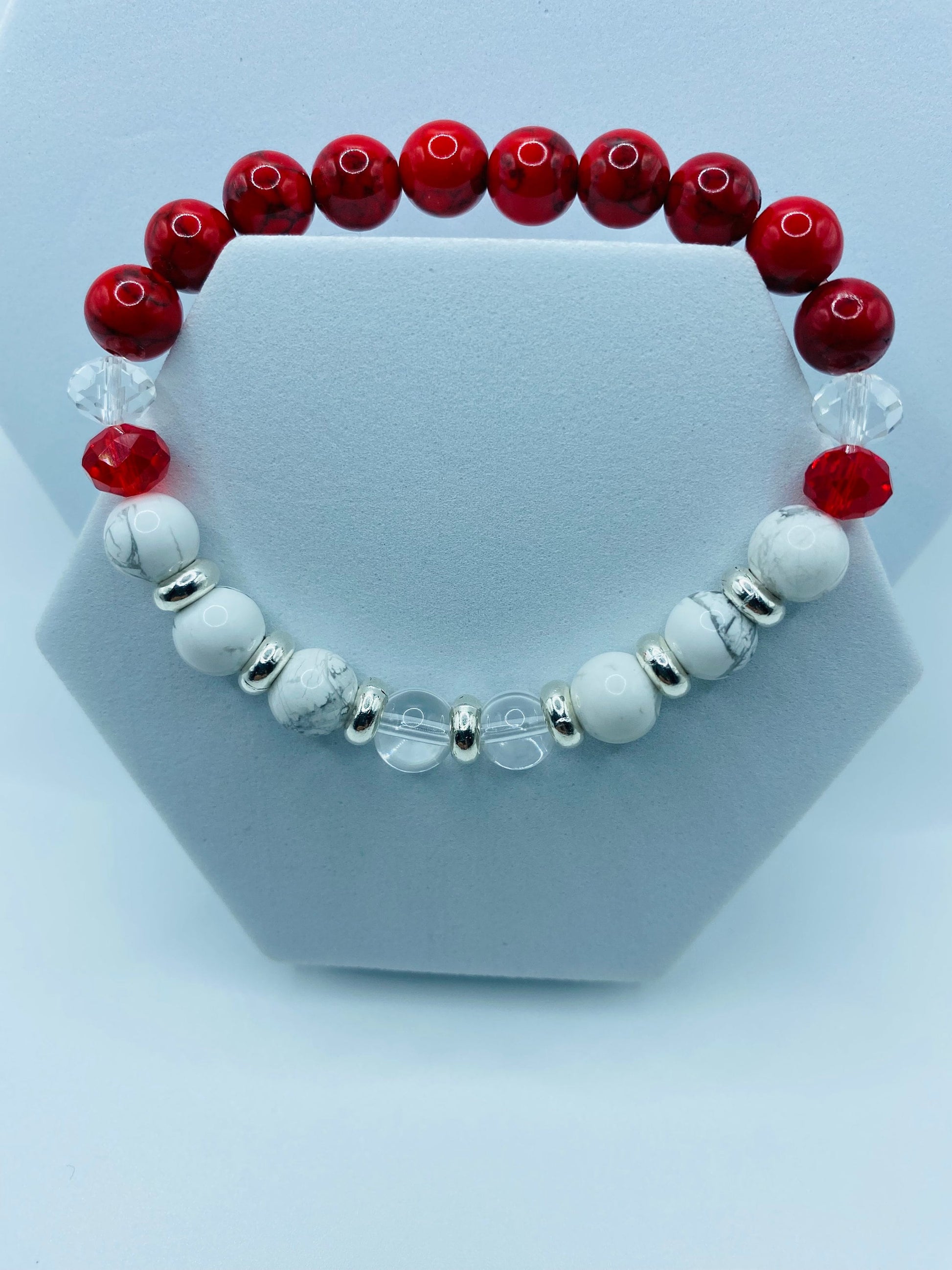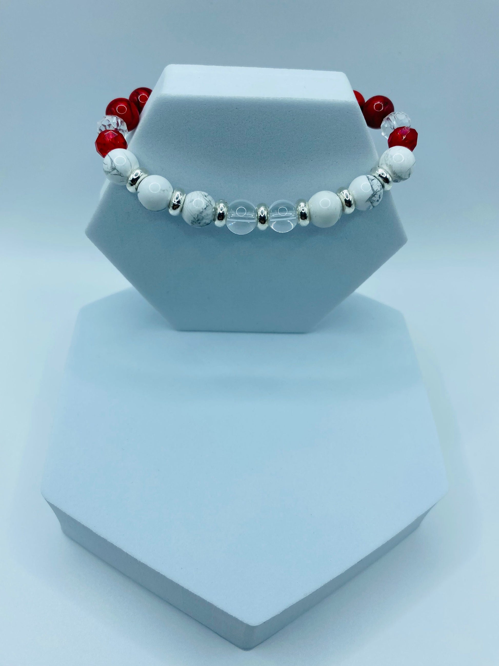 PRODUCT DETAIL - 8mm red turquoise gemstone beads - 8mm white howlite gemstone beads - 8mm clear smooth quartz gemstone beads - 8mm clear faceted crystal glass beads - 8mm red faceted crystal glass beads - 6mm silver plated spacers - Strong, stretchy cord - Handmade in a clean and safe environment