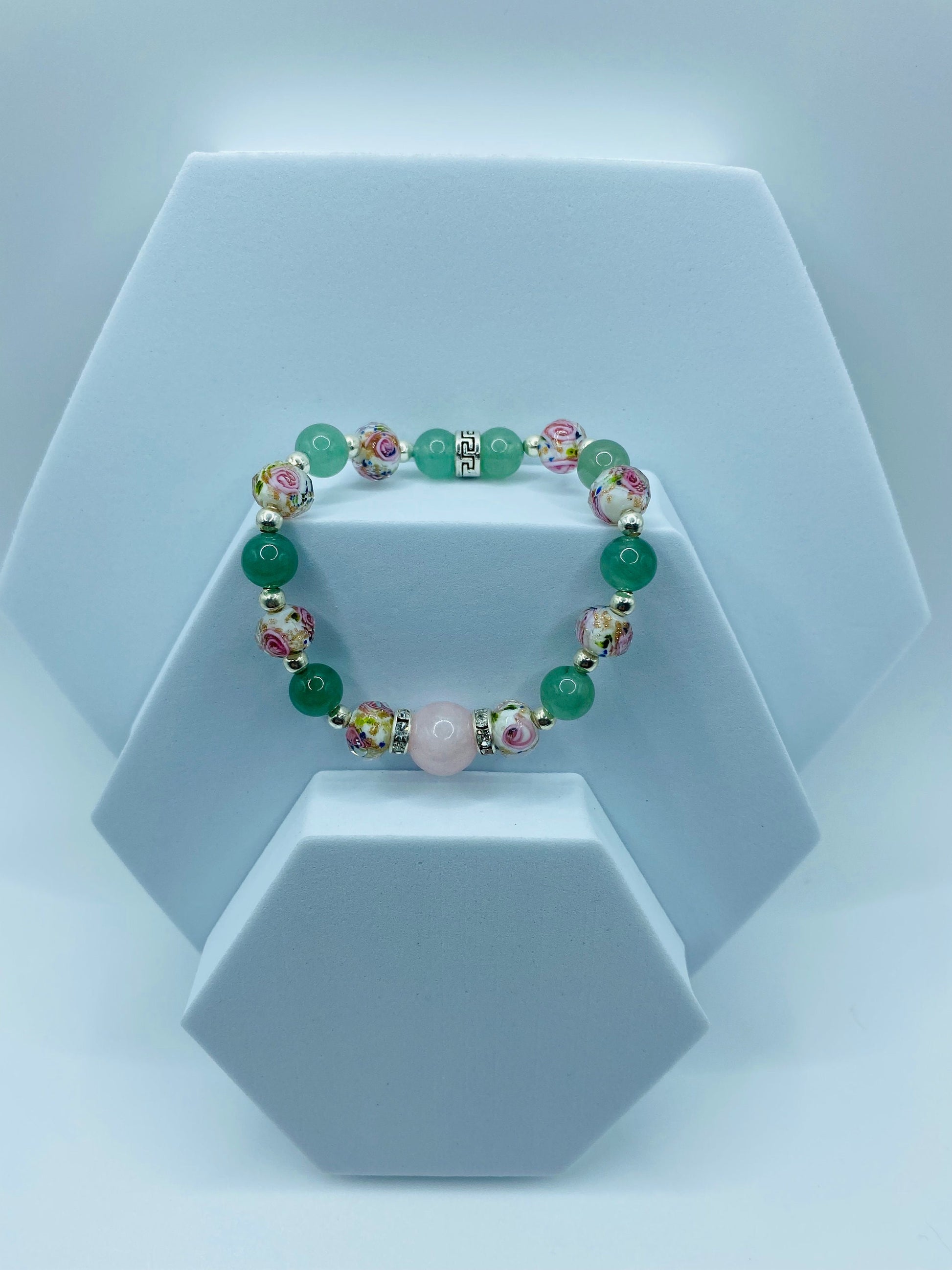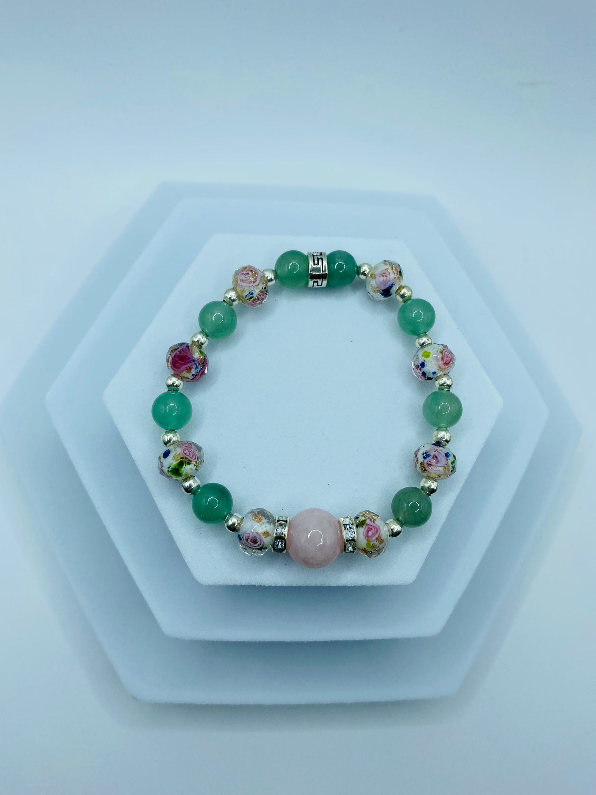 Elevate your style with this eye-catching bracelet featuring luscious Rose Quartz and soothing Green Aventurine gemstones, accented with charming Lampwork pink floral glass beads. Handcrafted with expert care, this unique piece exudes elegance and charm. Perfect for adding a touch of nature-inspired beauty to your outfit, this bracelet is a must-have accessory for any jewelry lover. Treat yourself or surprise a loved one with this stunning gemstone bracelet. Each bead exudes its own unique energy, promoting love, harmony, and positivity.