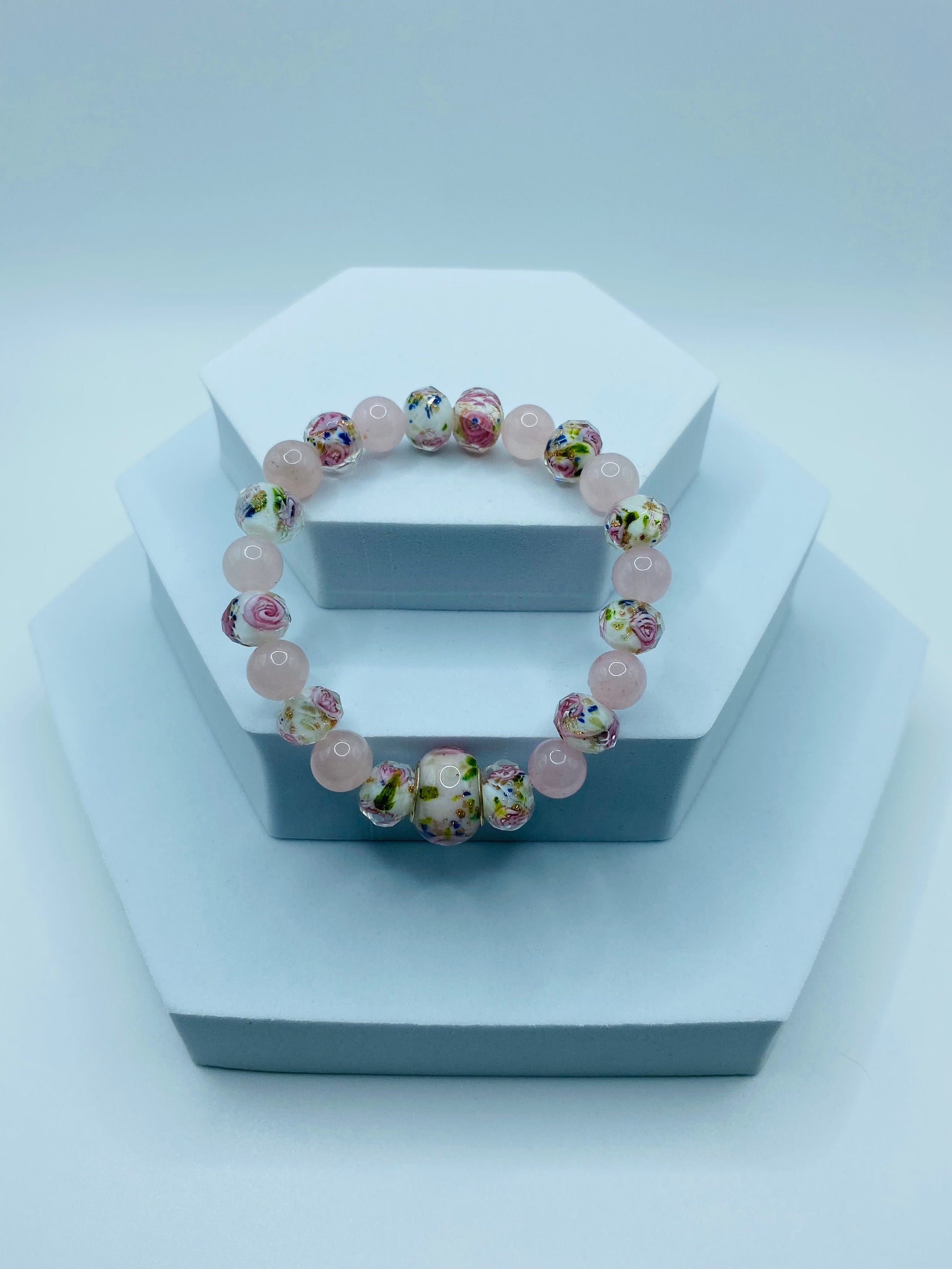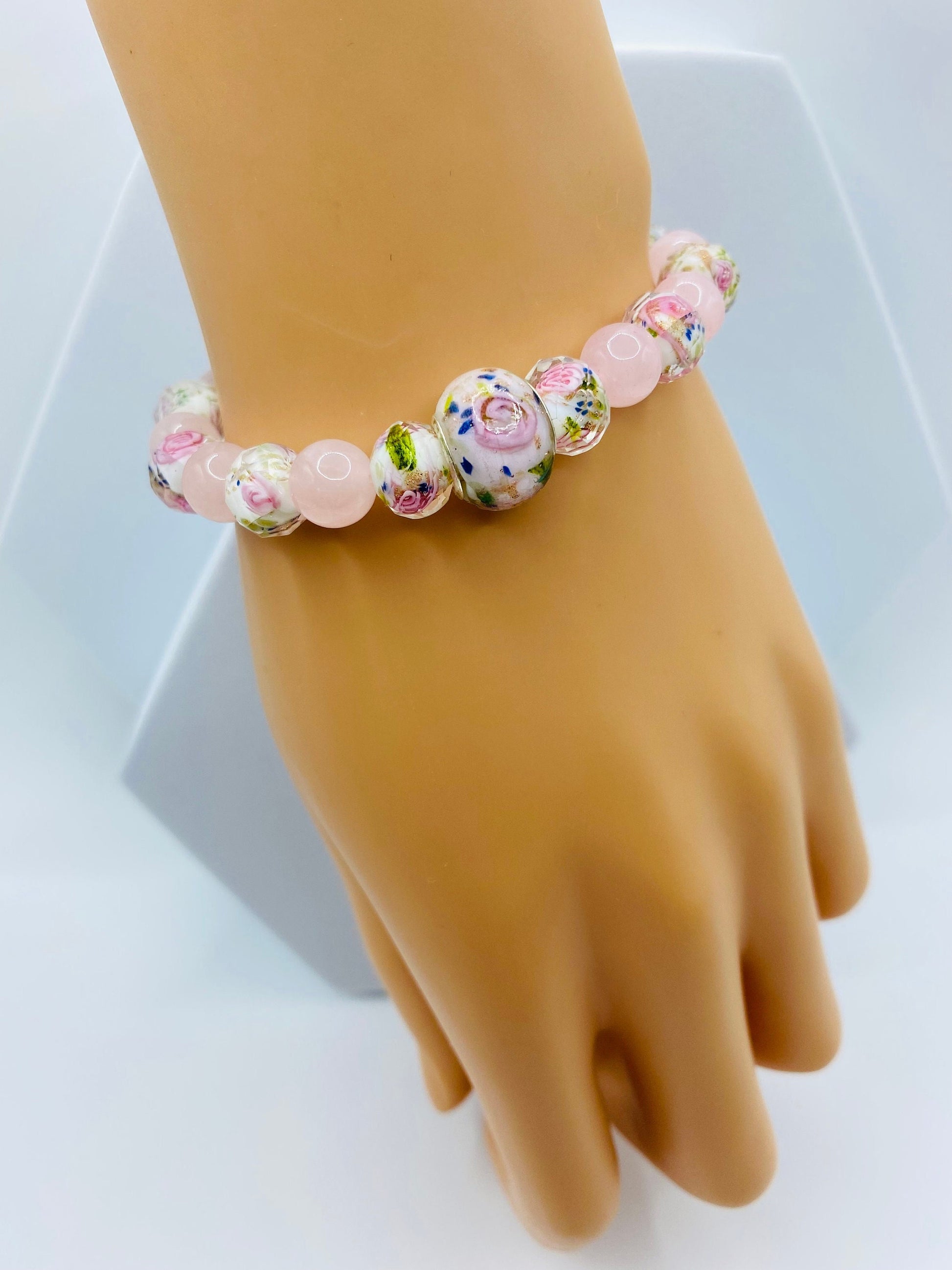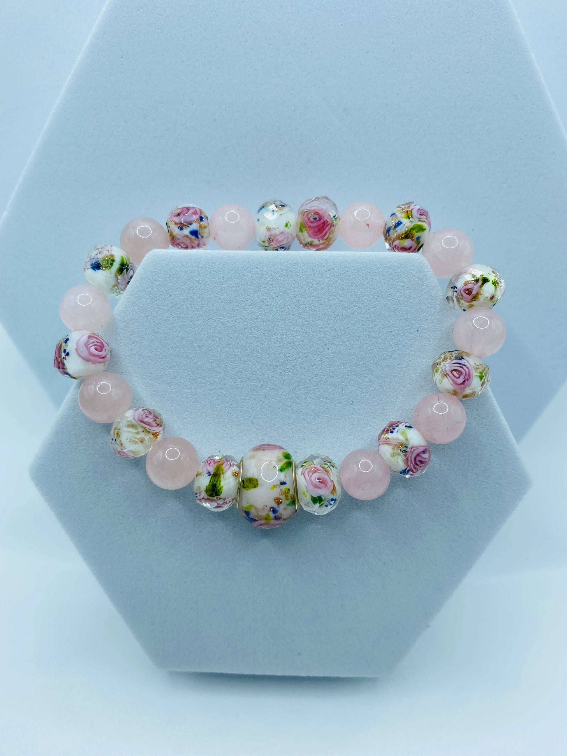 Rose Quartz Bracelet with Lampwork Floral Glass Beads