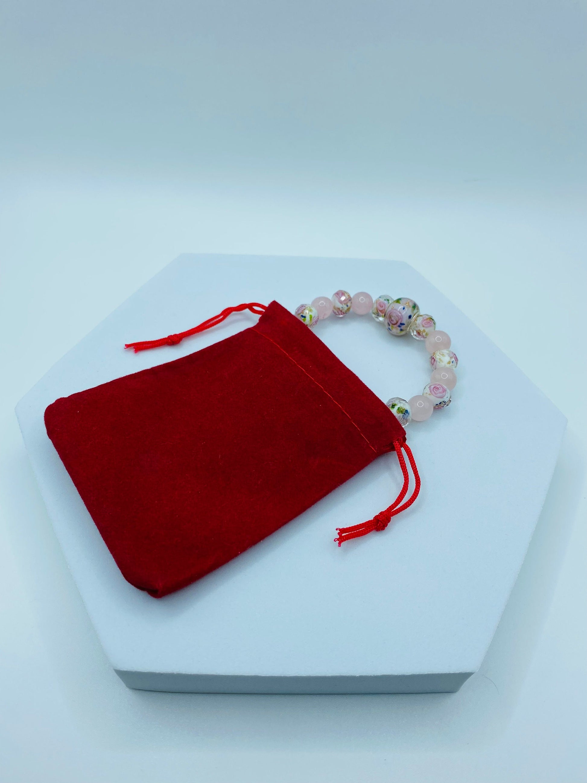 PRODUCT DETAILS - Lampwork floral glass bead pink bracelet - 10mm gold sand lampwork floral glass beads - 8mm natural rose quartz gemstone beads - 14mm European silver-plated floral glass bead - Strong, stretchy cord - Handmade in a clean and safe environment