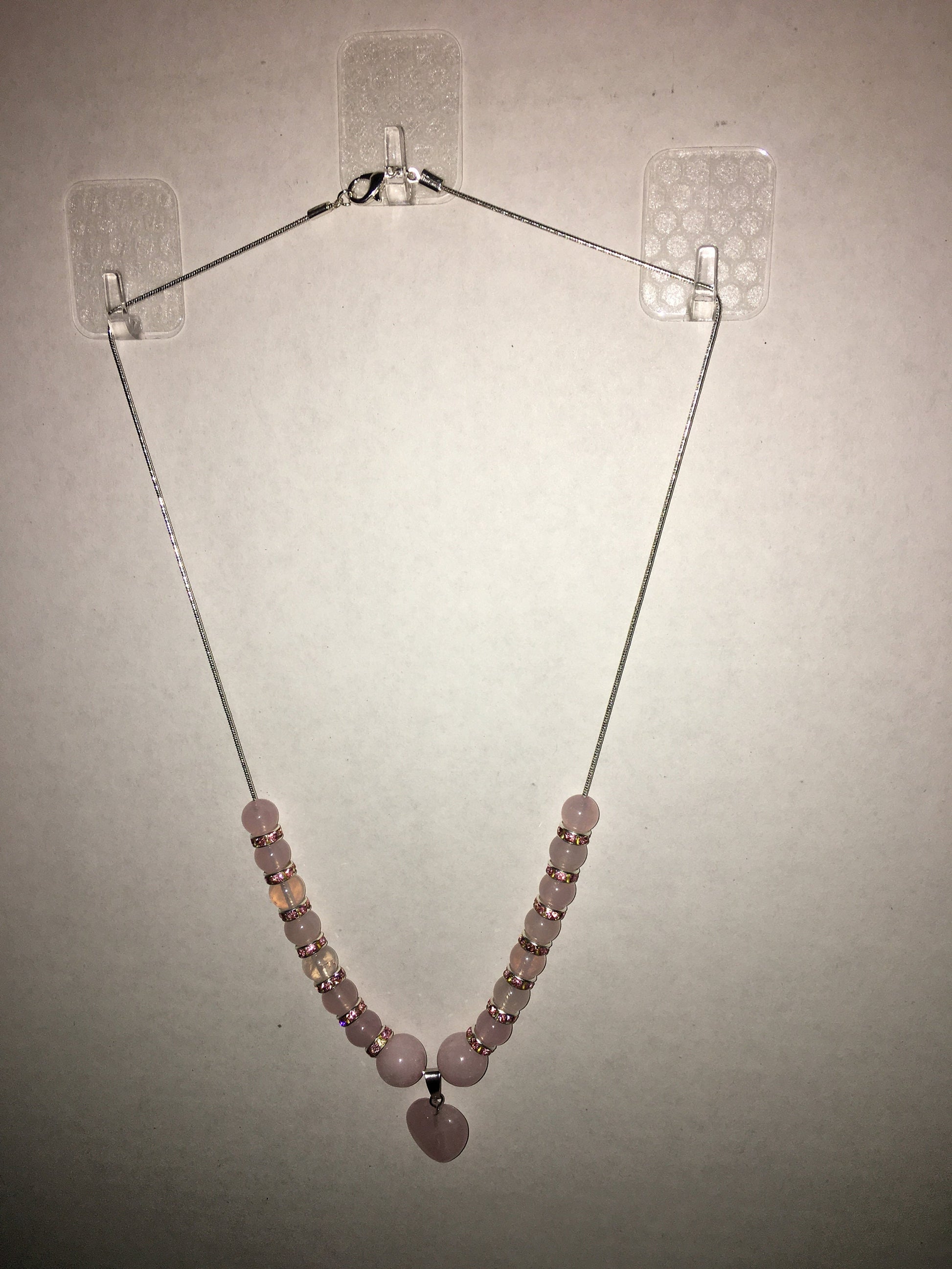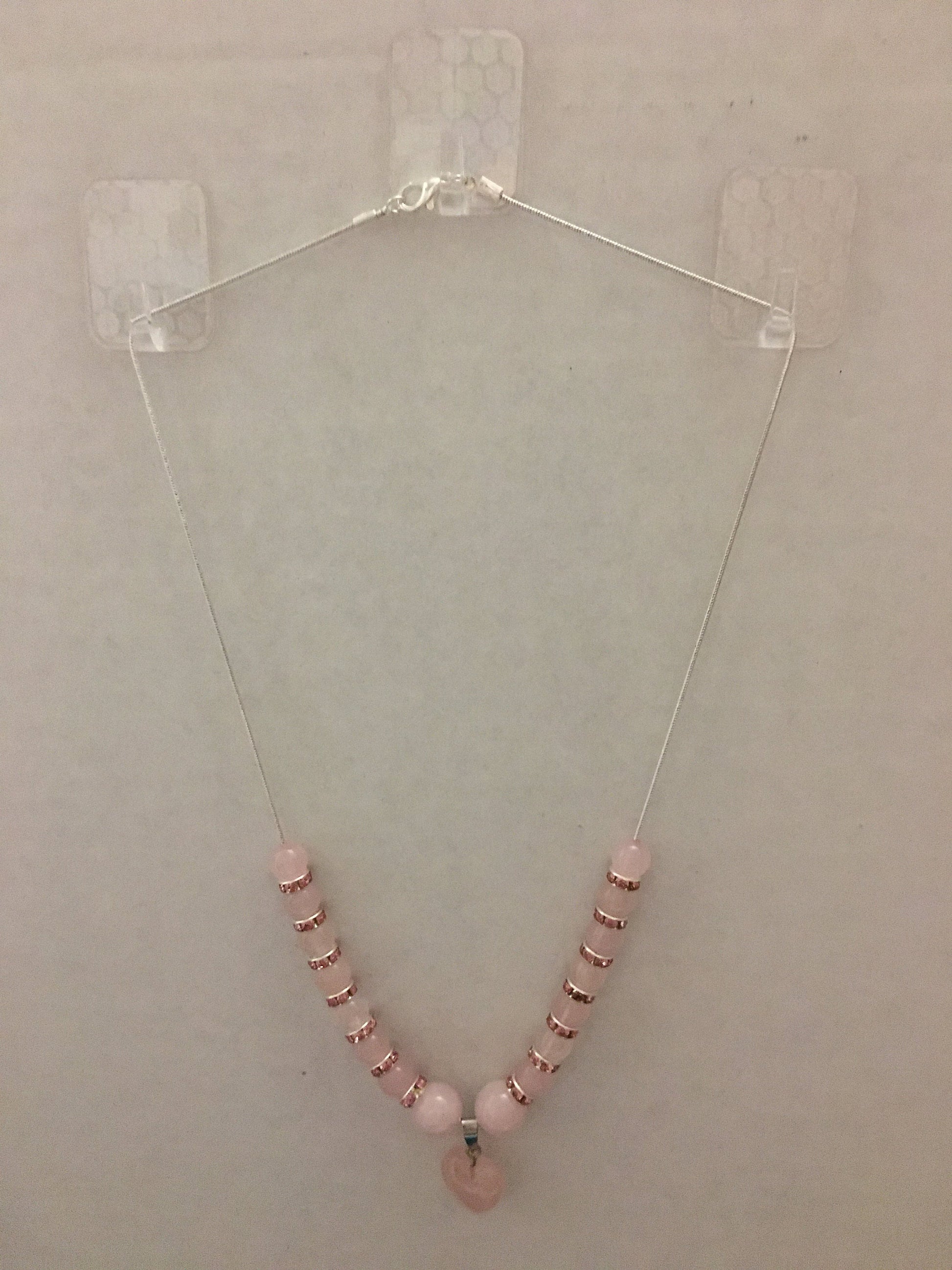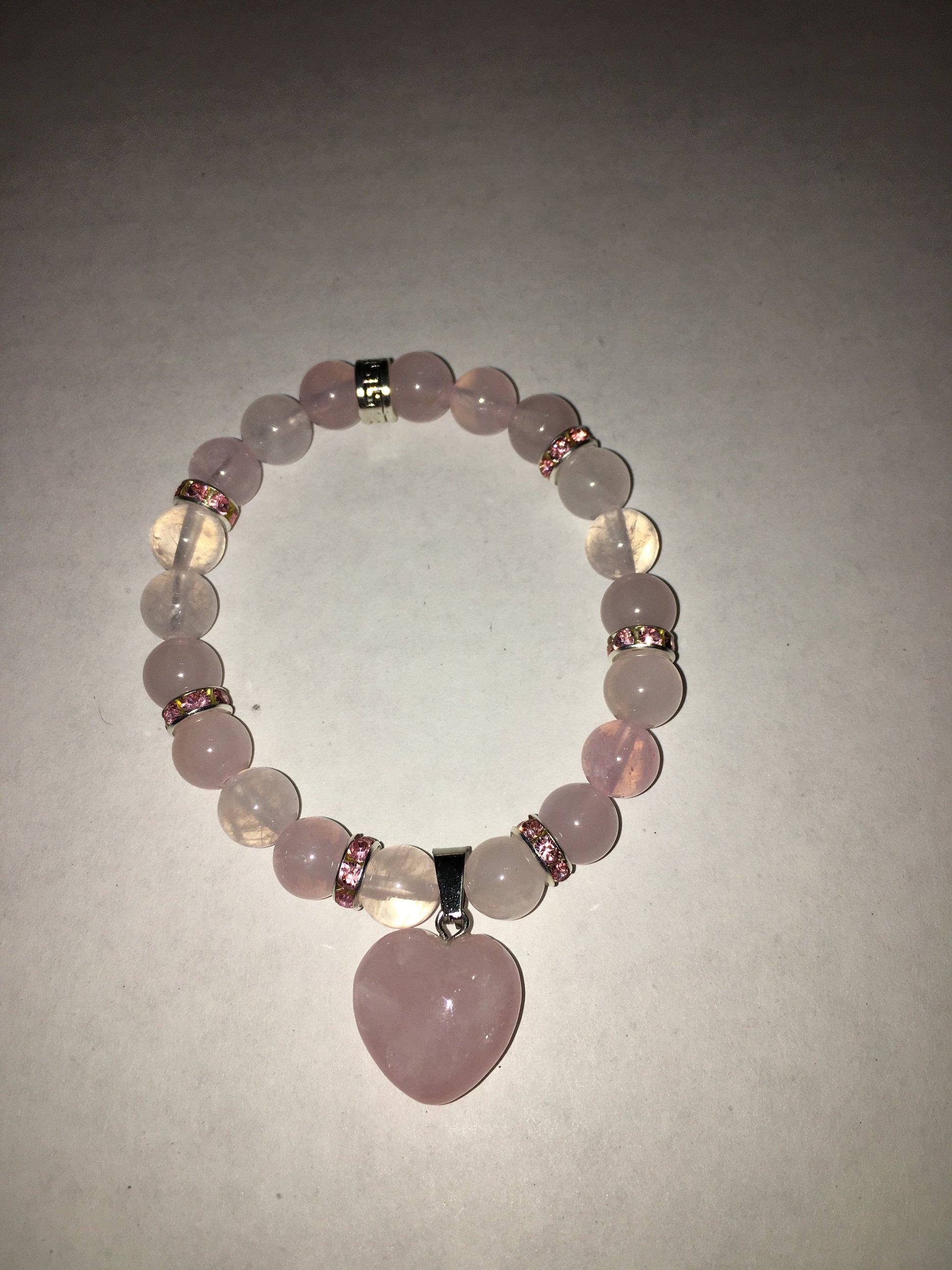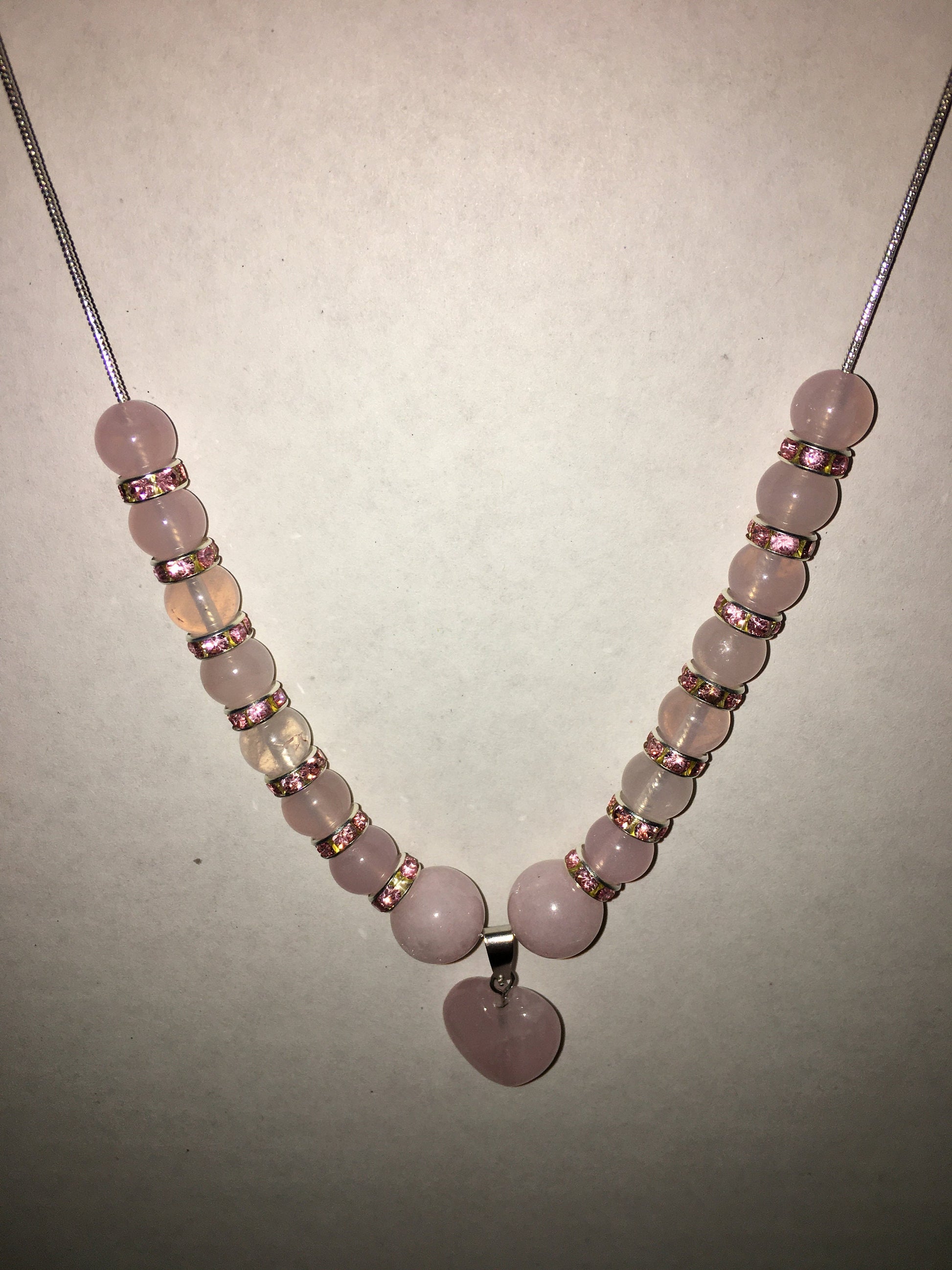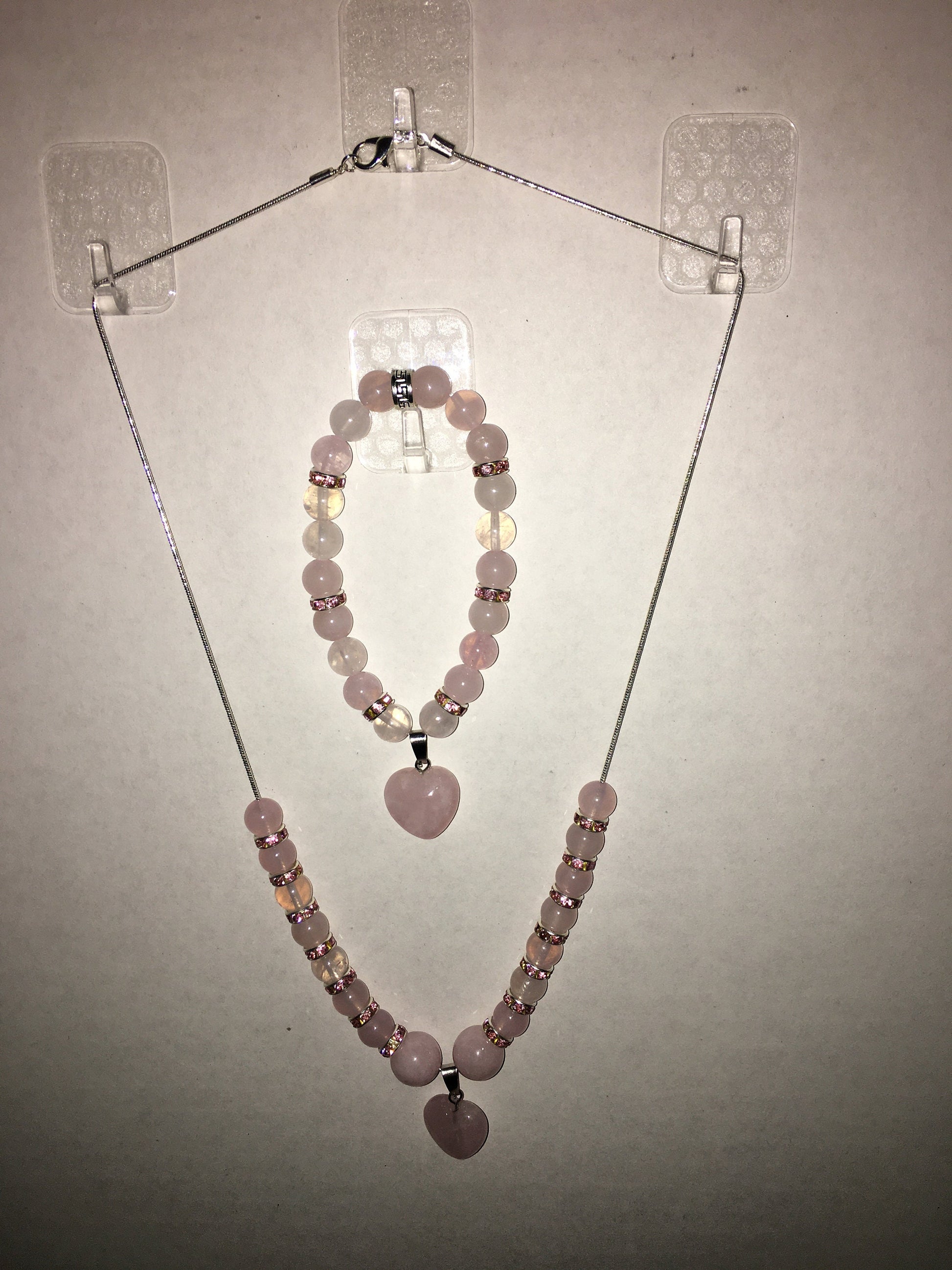PRODUCT DETAILS - Pink rose quartz gemstone heart pendant - 8mm AAA pink rose quartz gemstone beads - 8mm silver plated rondelles with sparkling rhinestones - 18–20-inch silver plated snake chain, lobster claw closure necklace - Strong, stretchy cord bracelet - Handmade in a clean and safe environment