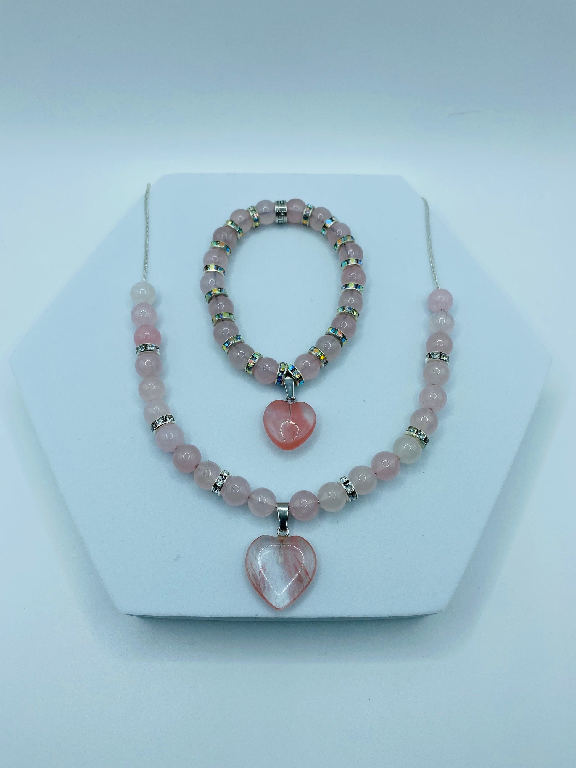 PRODUCT DETAILS - Pink Aventurine gemstone heart pendant - 8mm pink rose quartz gemstone beads - 8mm silver plated rondelles with sparkling rhinestones - 18–20-inch silver plated snake chain, lobster claw closure necklace - Strong, stretchy cord bracelet - Handmade in a clean and safe environment