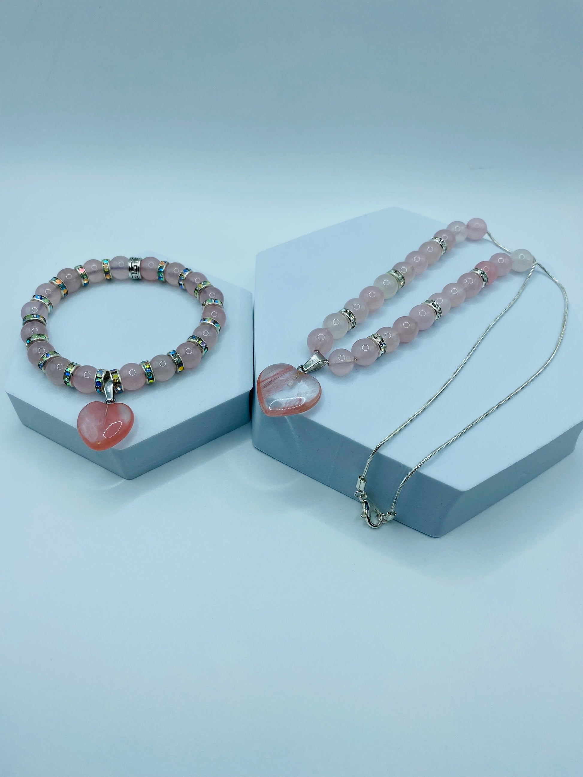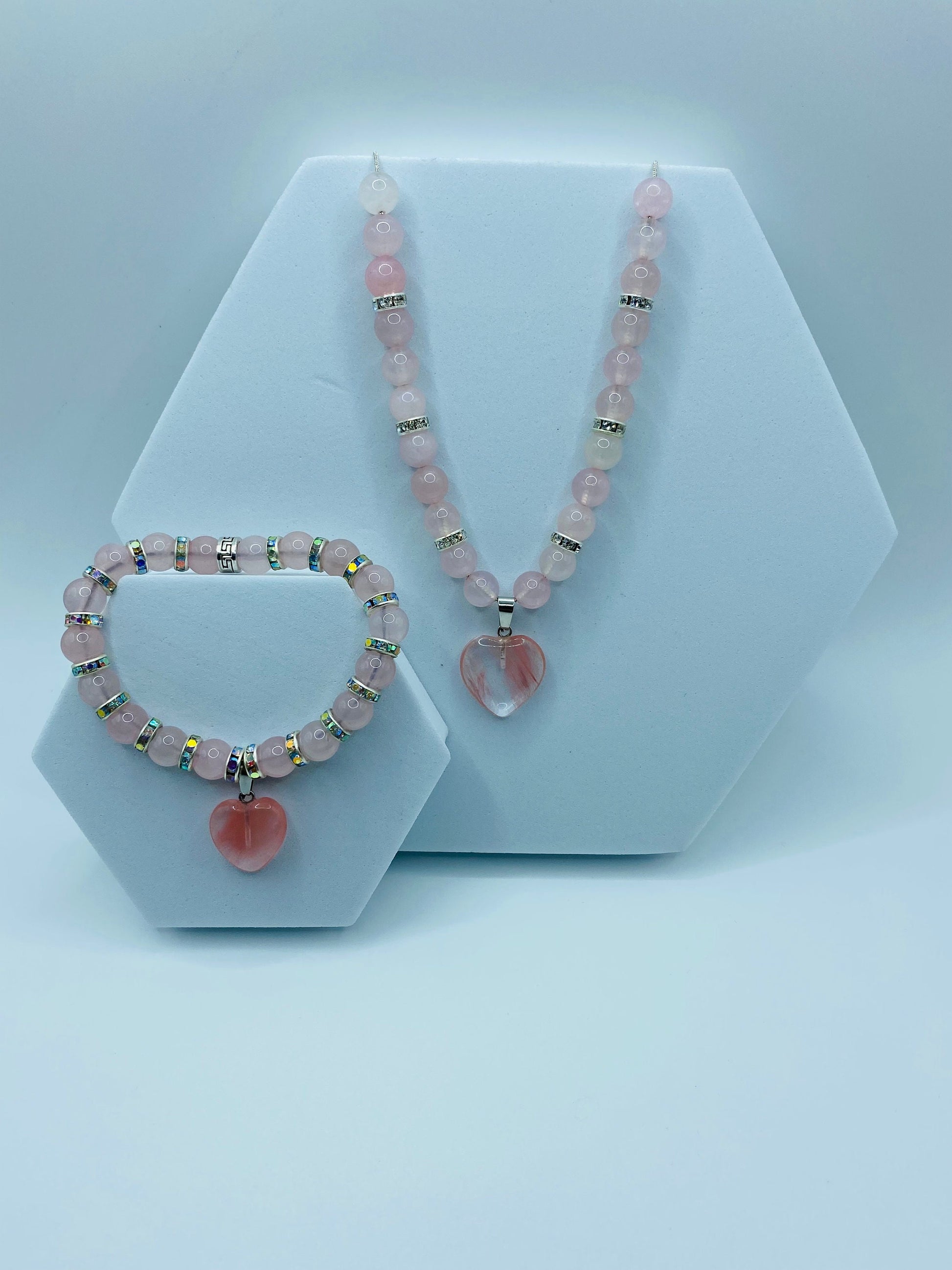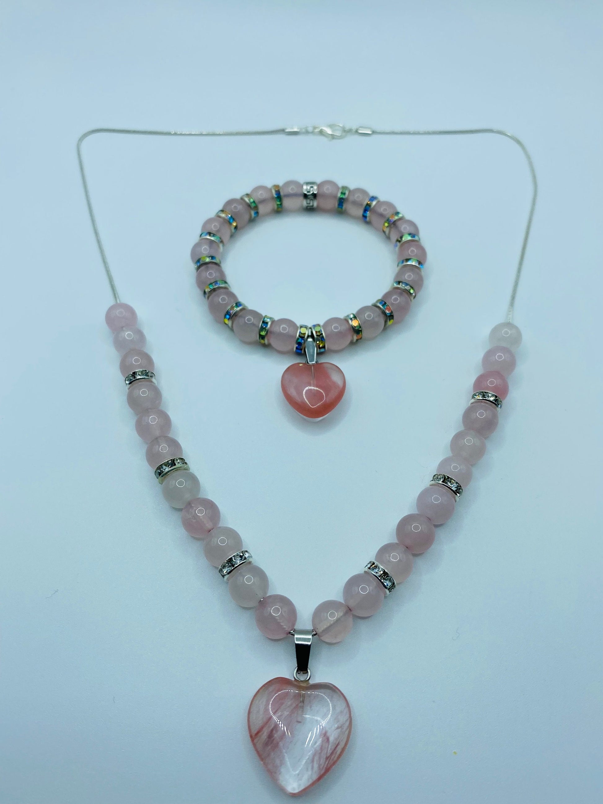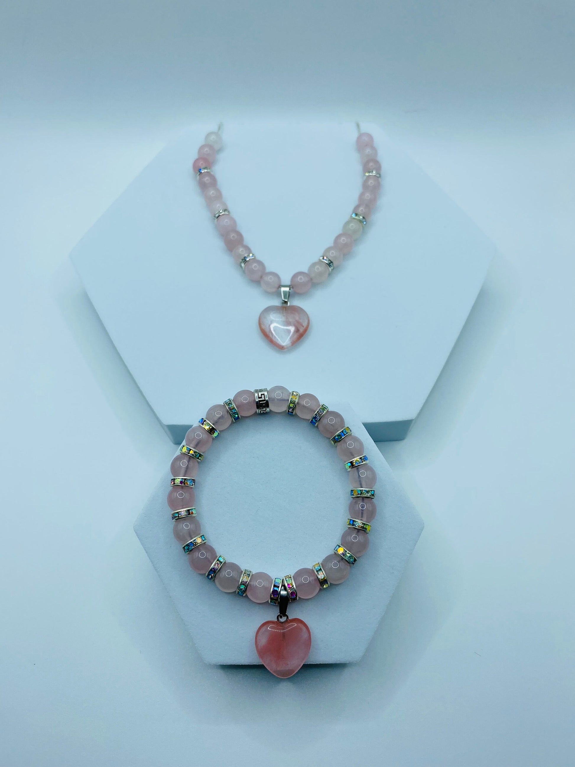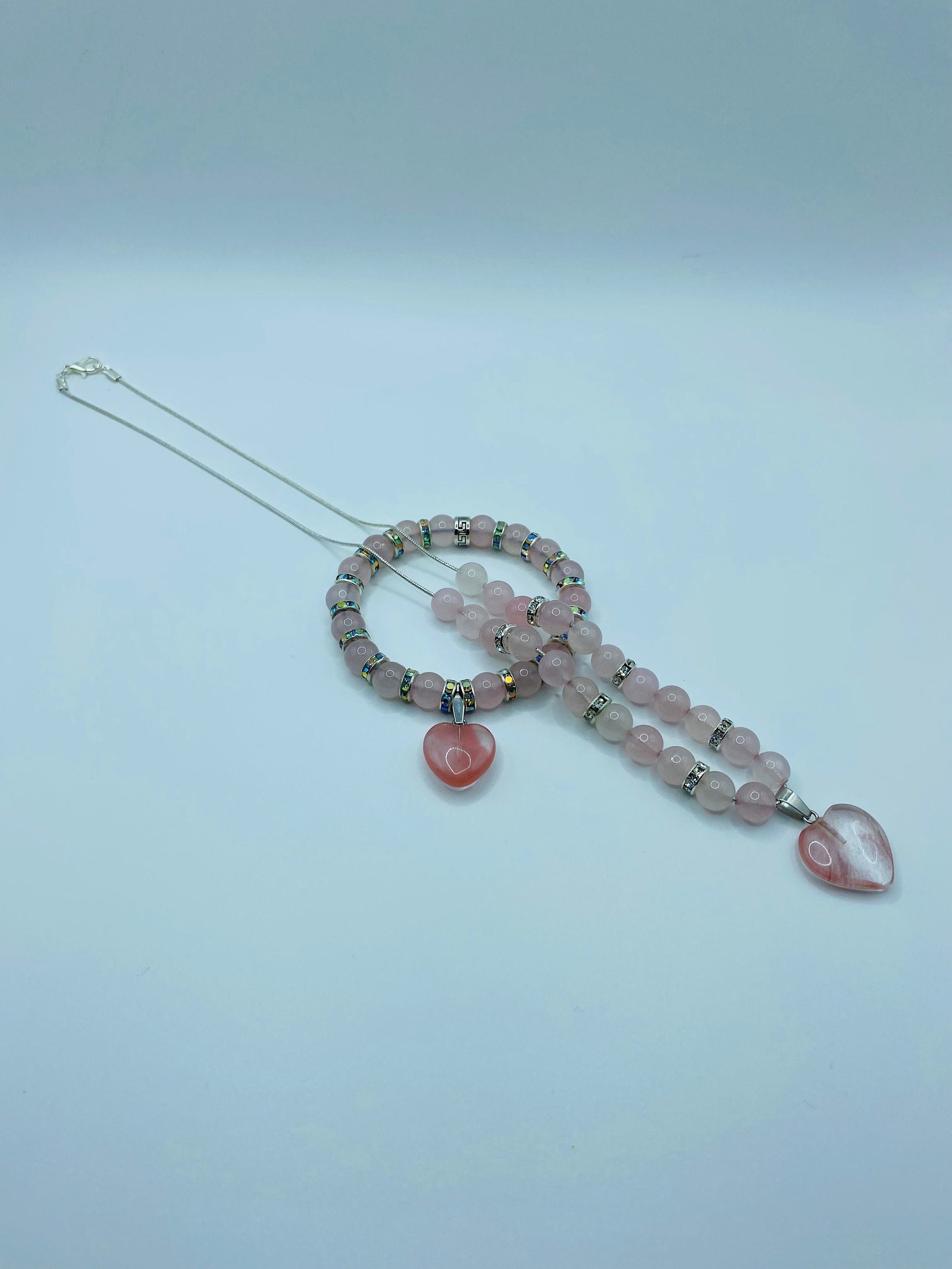 Rose Quartz Necklace Bracelet Set: Pink Aventurine Heart Charm, Rhinestone Rondelles