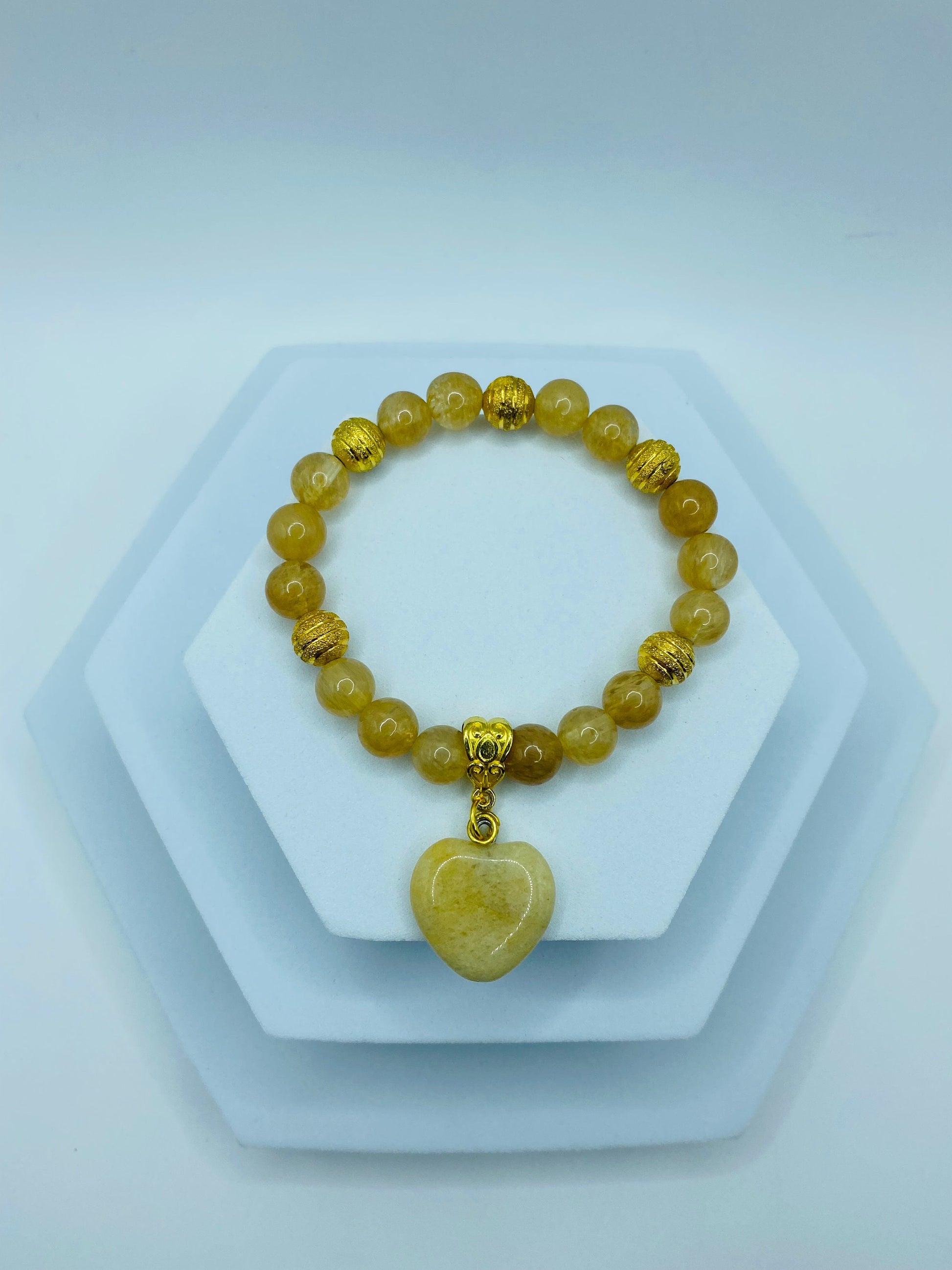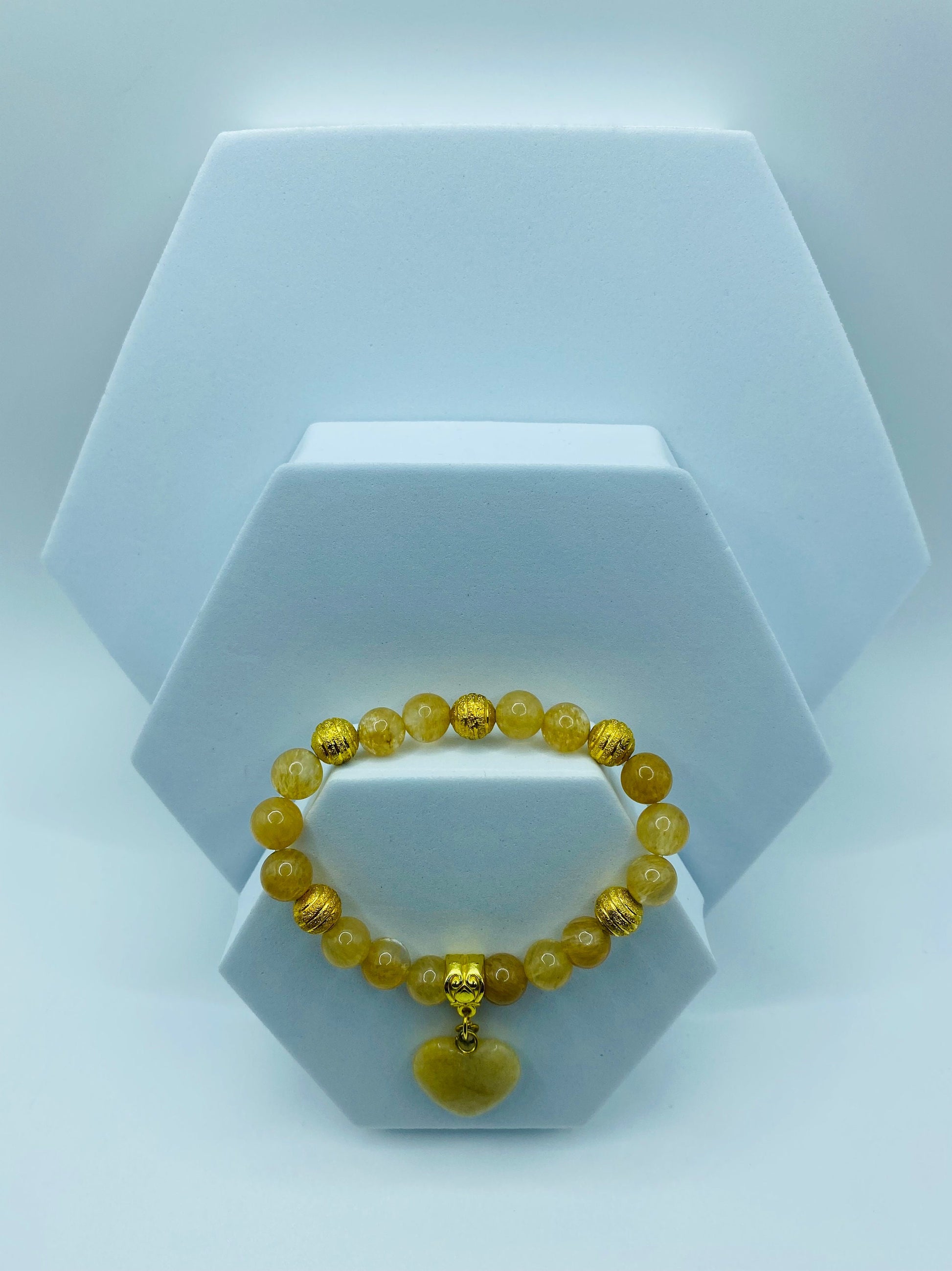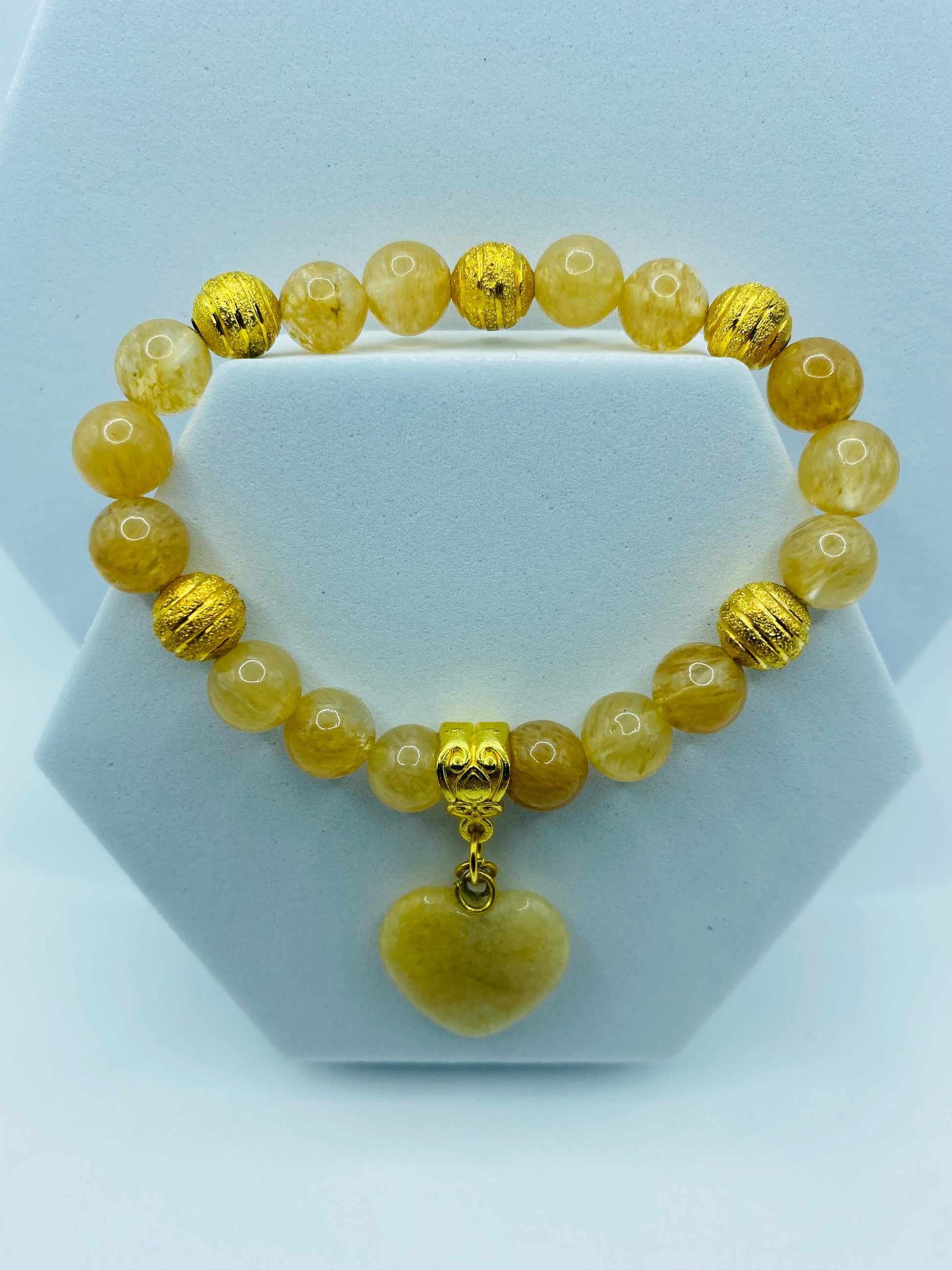 PRODUCT DETAILS - 8mm natural gold rutilated quartz - Gold rutilated quartz 20x20x5mm heart charm - 18k gold Plated charm holder - 8mm round 18k gold plated hollow beads - Strong, stretchy cord - Handmade in a clean and safe environment