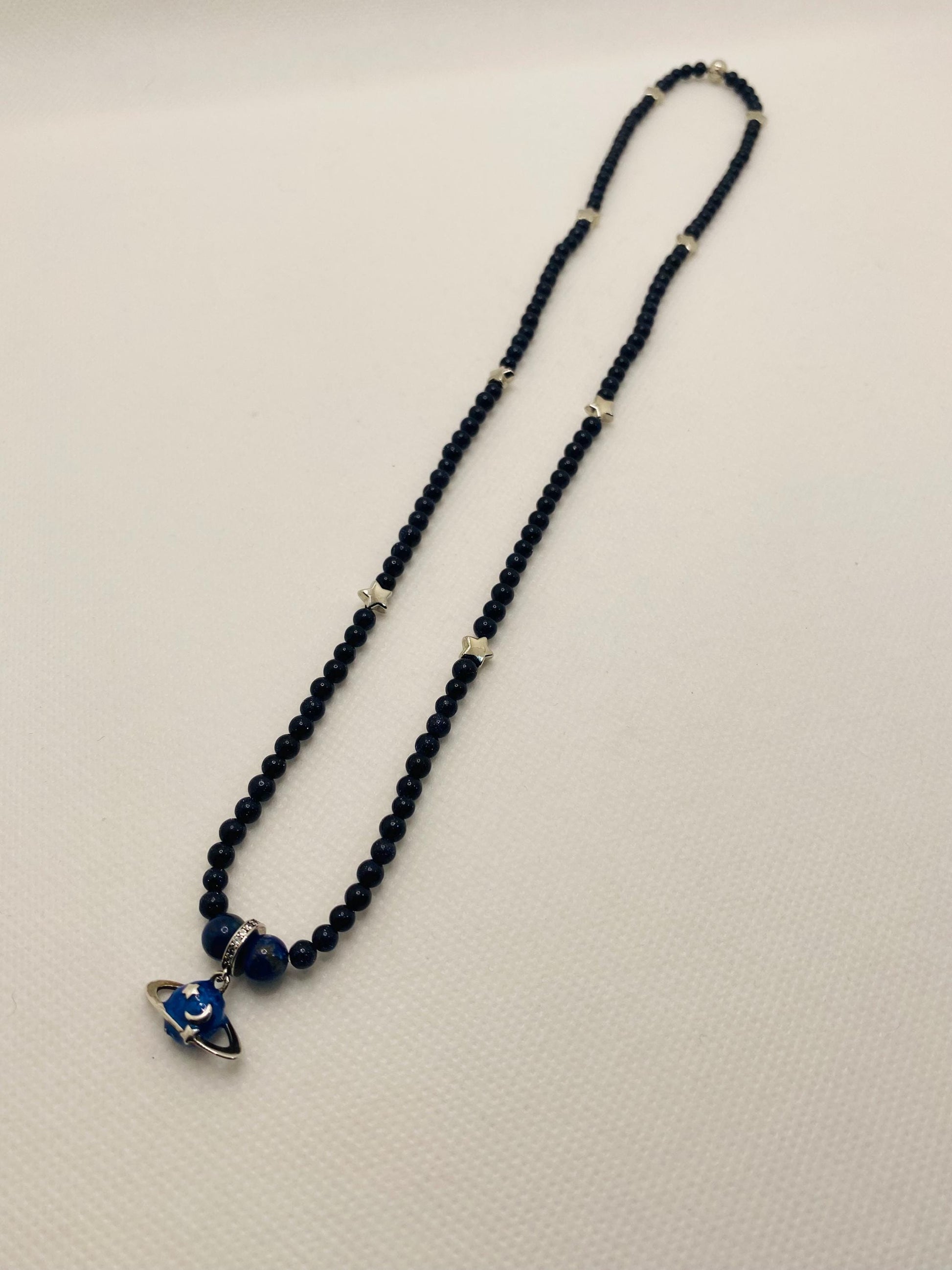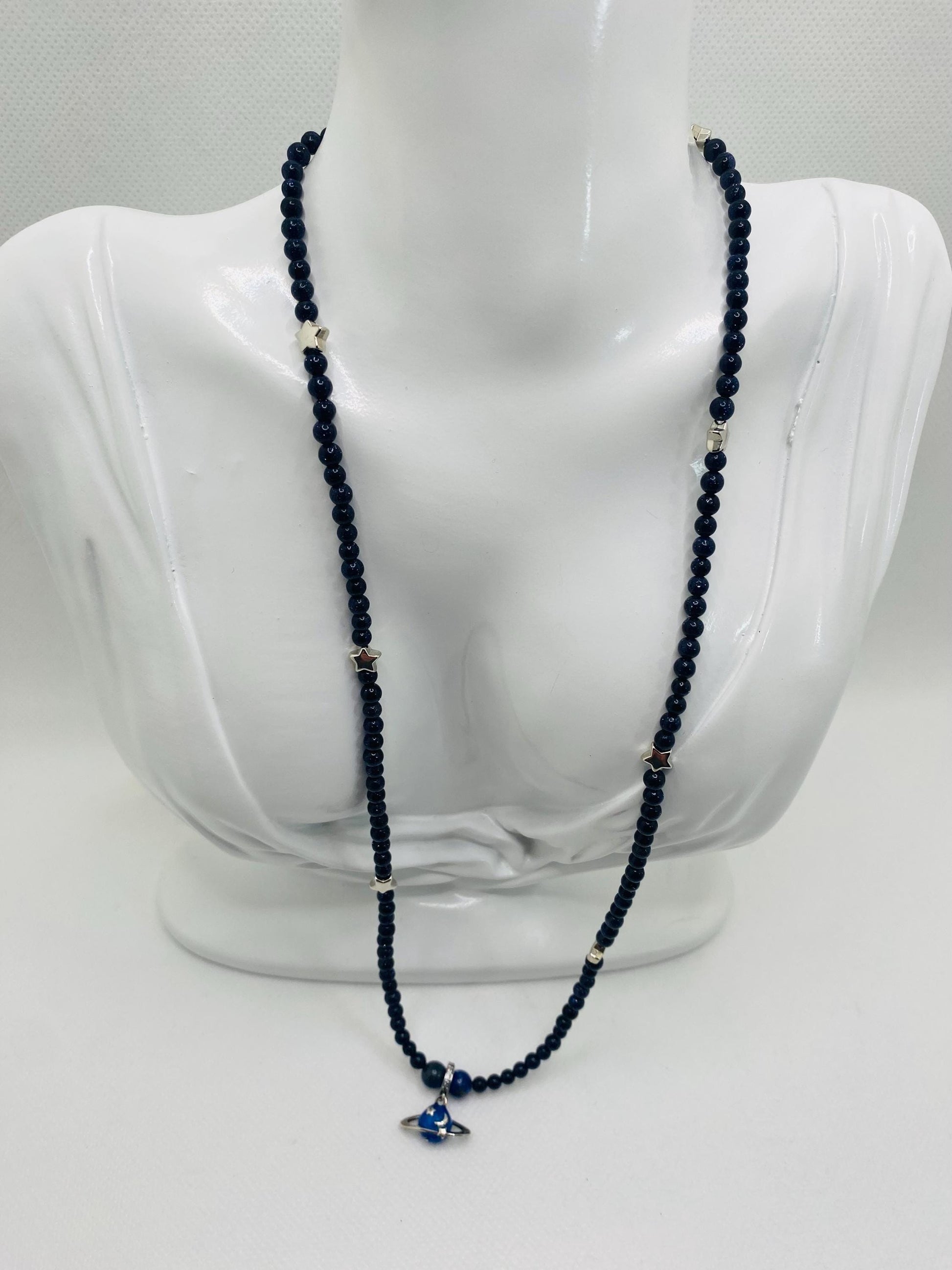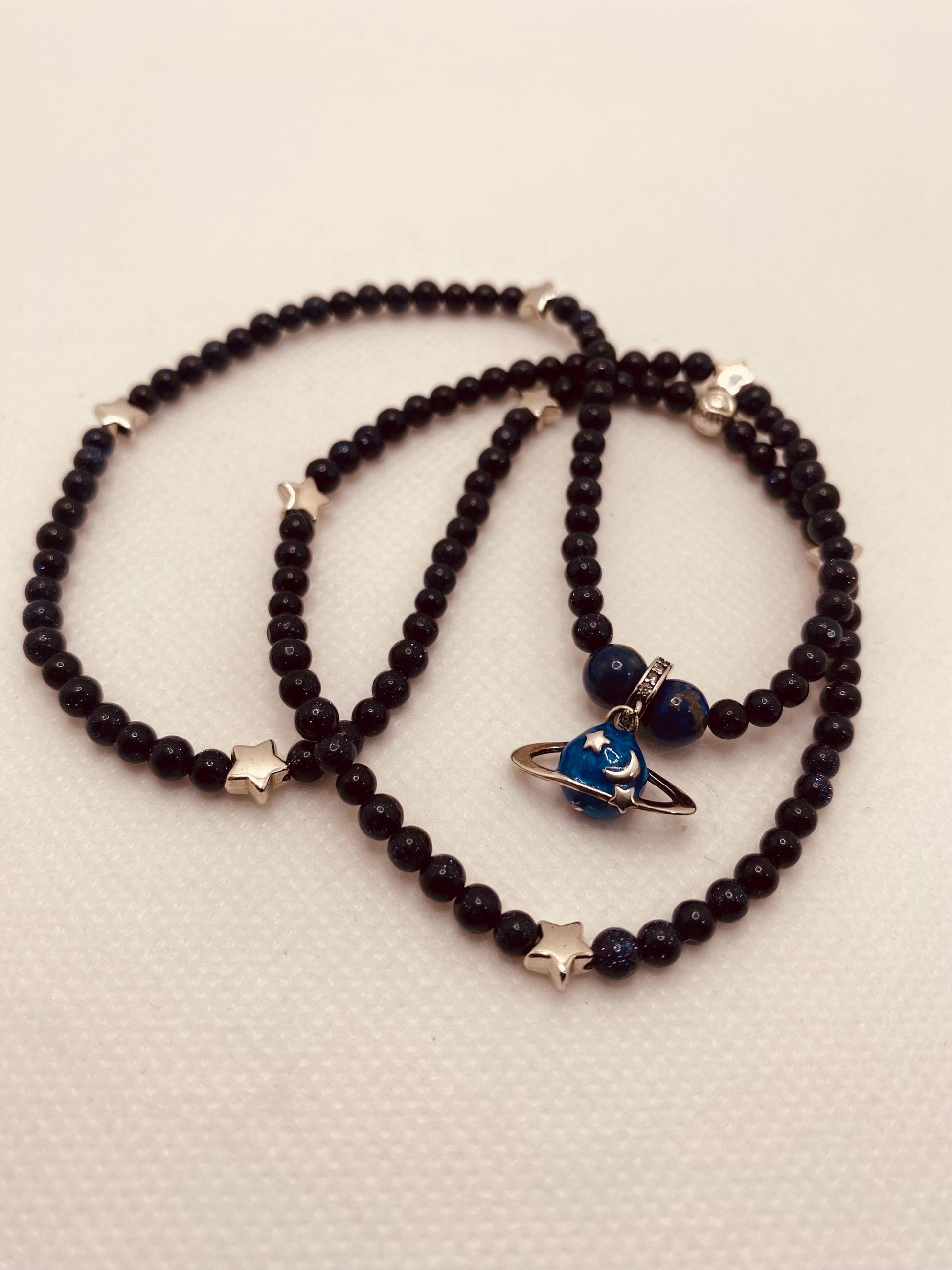 PRODUCT DETAILS - 4mm AAA dark blue goldstone gemstone beads - Silver Celestial Planetary Saturn charm Pendant - White Gold Stars - Silver plated round spacers - Strong, stretchy cord - Handmade in a clean and safe environment