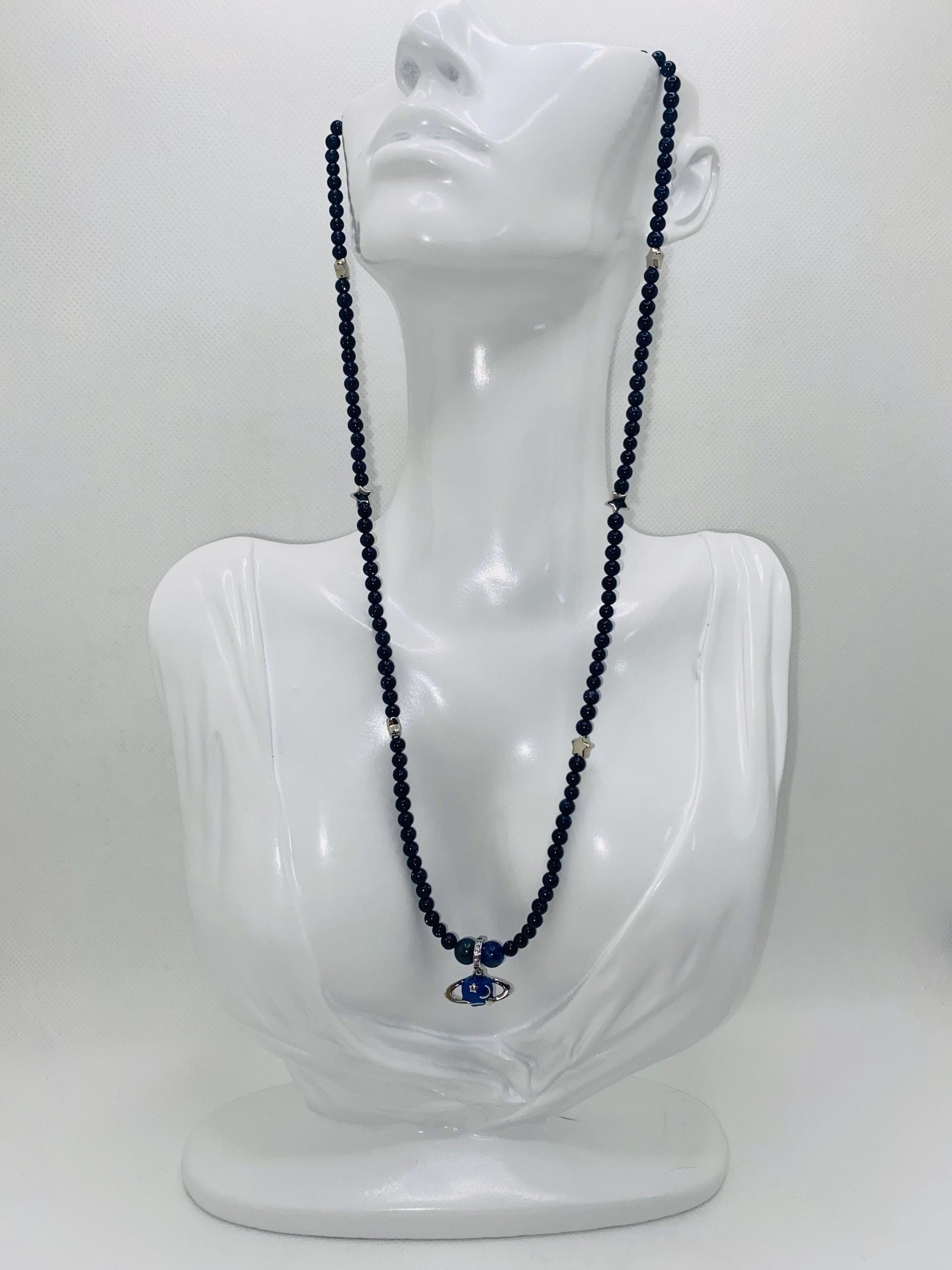 Elevate your style with the stunning Saturn Necklace, a celestial masterpiece that perfectly combines elegance and whimsy. Crafted from 4mm AAA dark blue goldstone gemstone beads, each piece captures the essence of the night sky with its twinkling shimmer. The rich, deep blue hues are not just aesthetically pleasing, but they also represent tranquility and inspiration, making this necklace a perfect companion for any outfit—whether casual or formal. At the heart of this enchanting necklace hangs a silver celestial planetary Saturn charm pendant. Its intricate design beautifully mirrors the rings of Saturn, adding a touch of cosmic charm that’s sure to turn heads. Lightweight and easy to wear, this accessory is ideal for daily wear or special occasions, allowing you to showcase your love for all things celestial in a chic way. Treat yourself or surprise a loved one with a gift that’s truly out of this world. Don’t miss out on the opportunity to own this unique piece of jewelry—add the Saturn Necklace to your collection today and let your style shine like the stars!