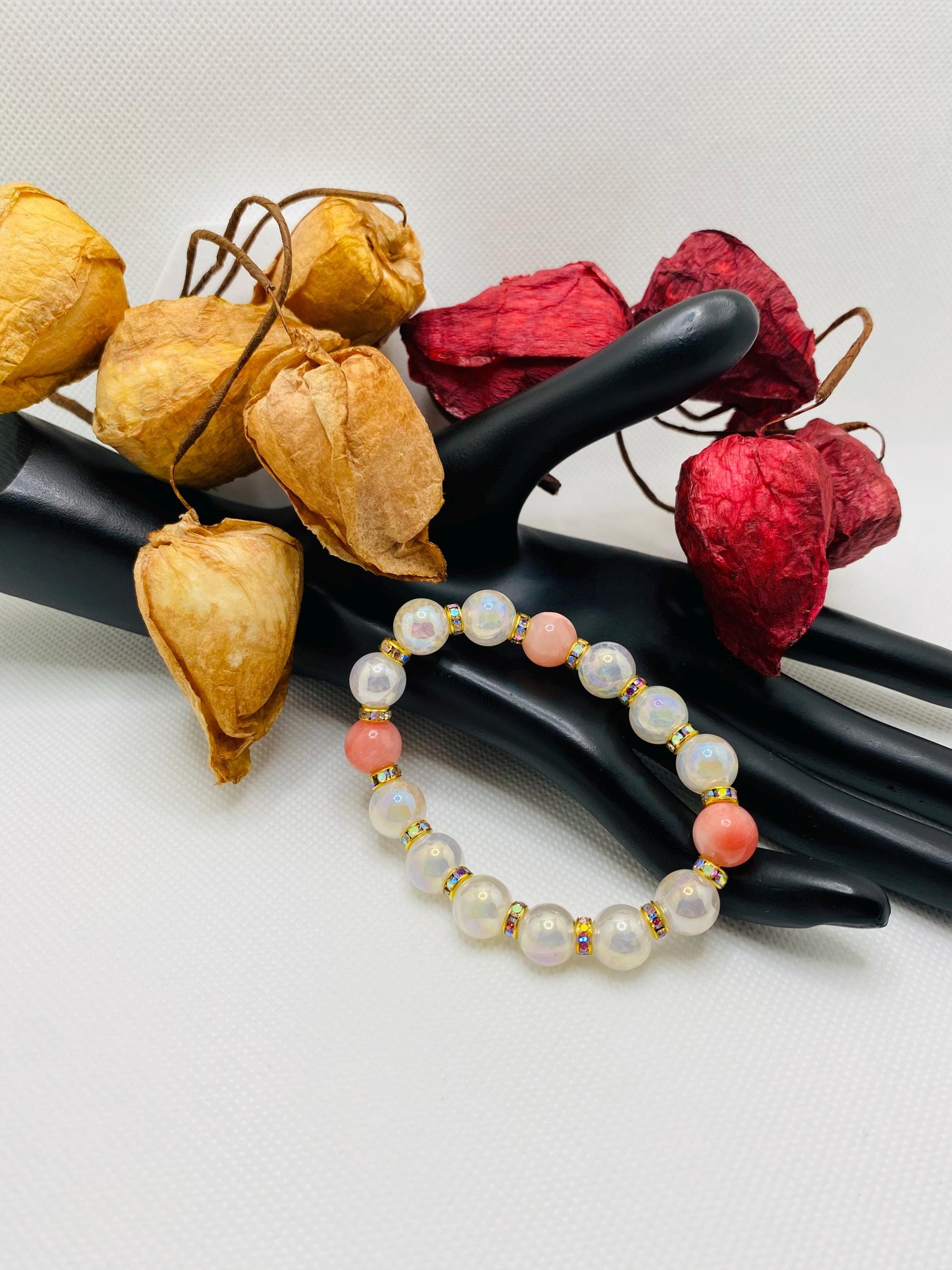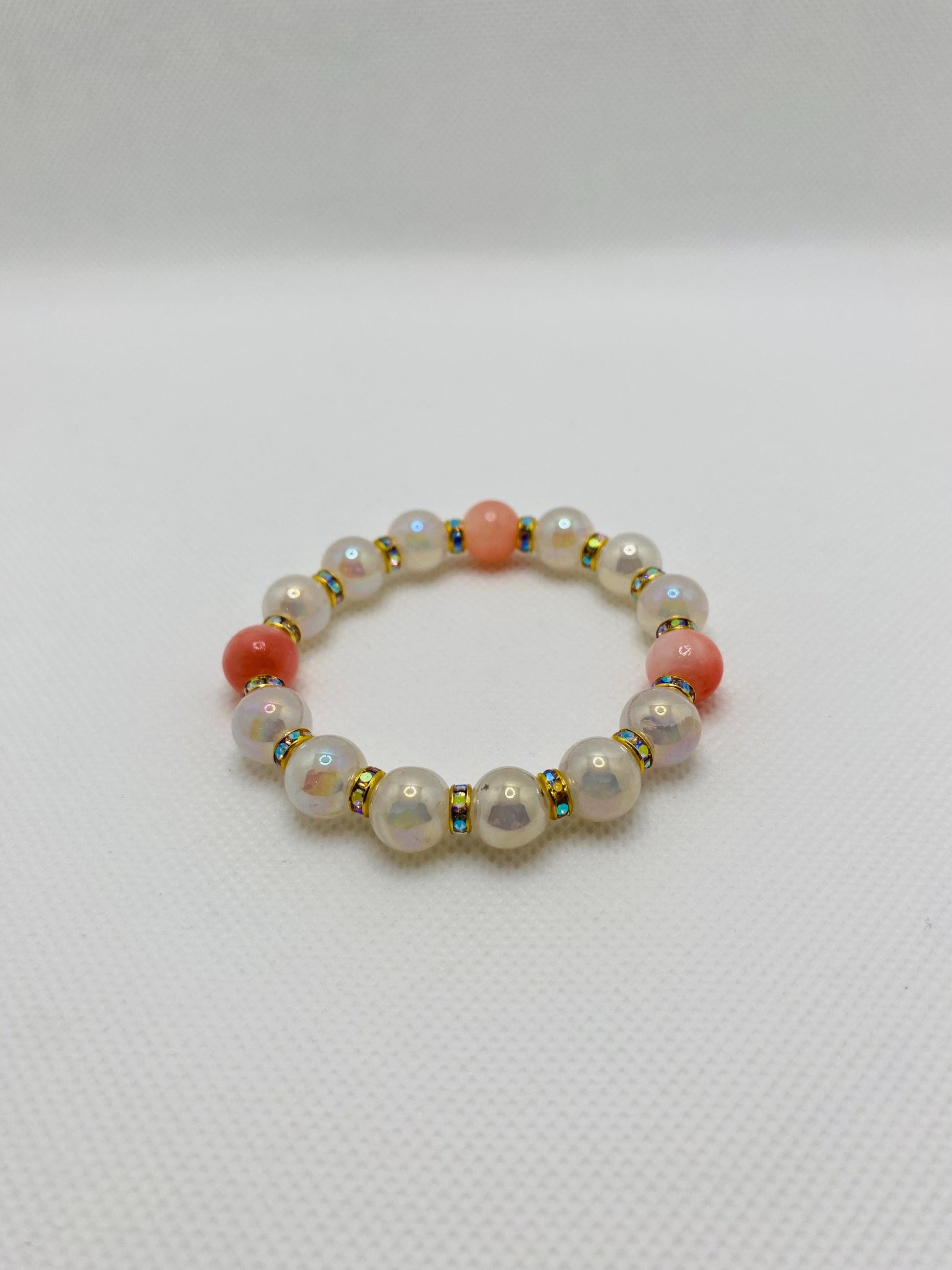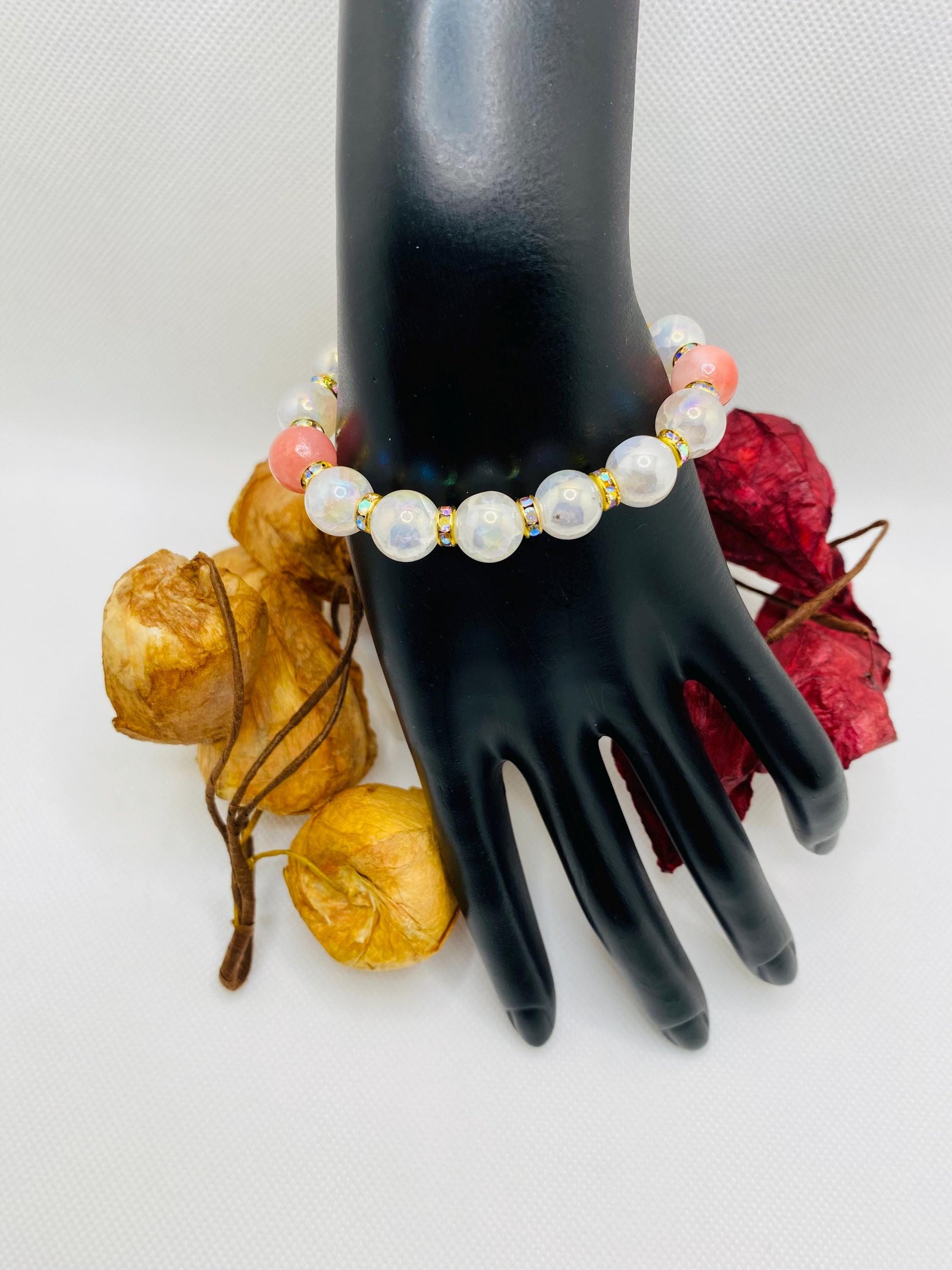 Product Info: 10mm sparkling snow crackle quartz onyx gemstone beads. 10mm Persian natural pink gemstone beads. 18k gold plated rondelle spacers with sparkling rhinestones. 0.8mm super strong stretchy cord 100 % handmade in a clean and safe environment.