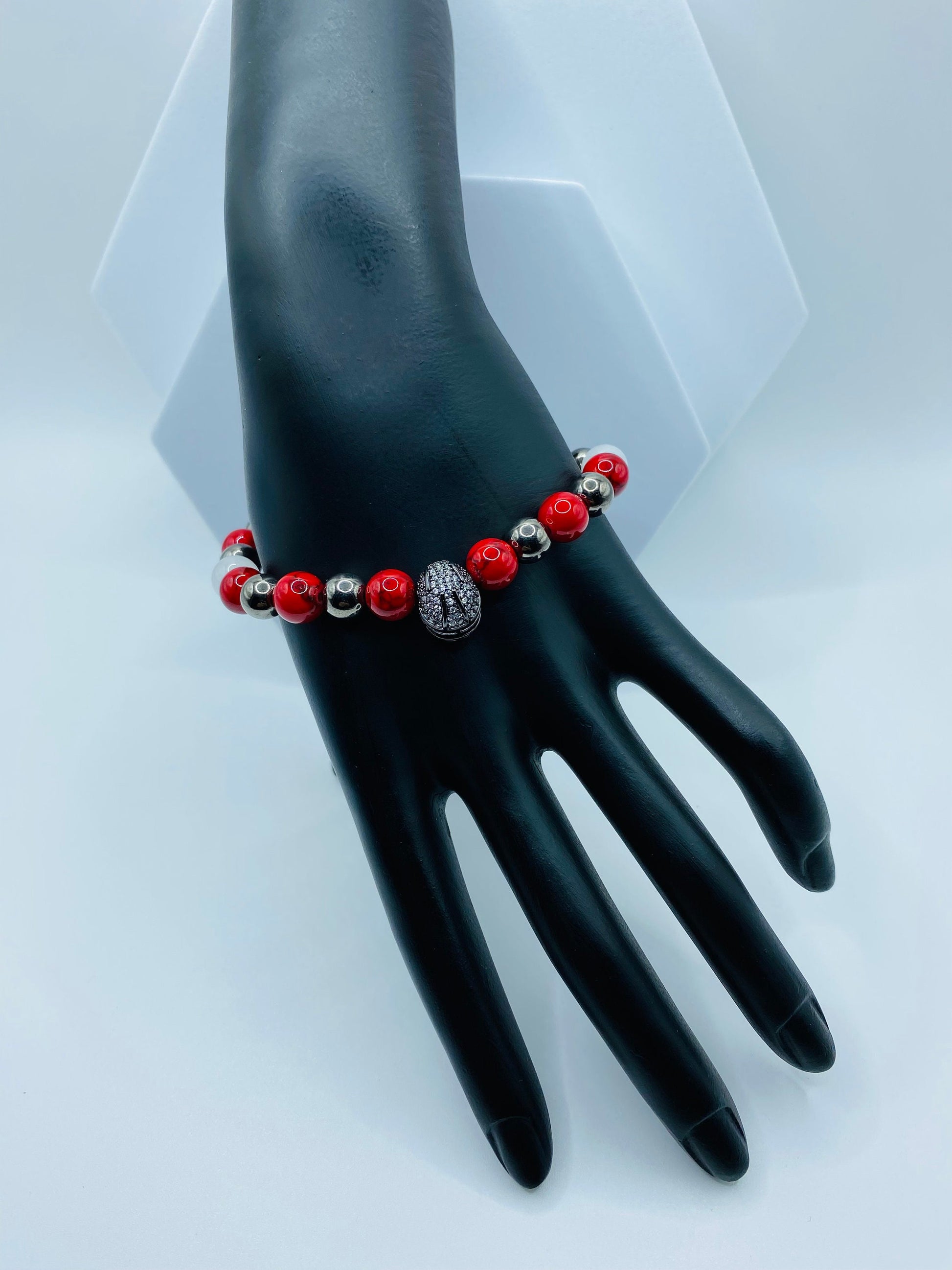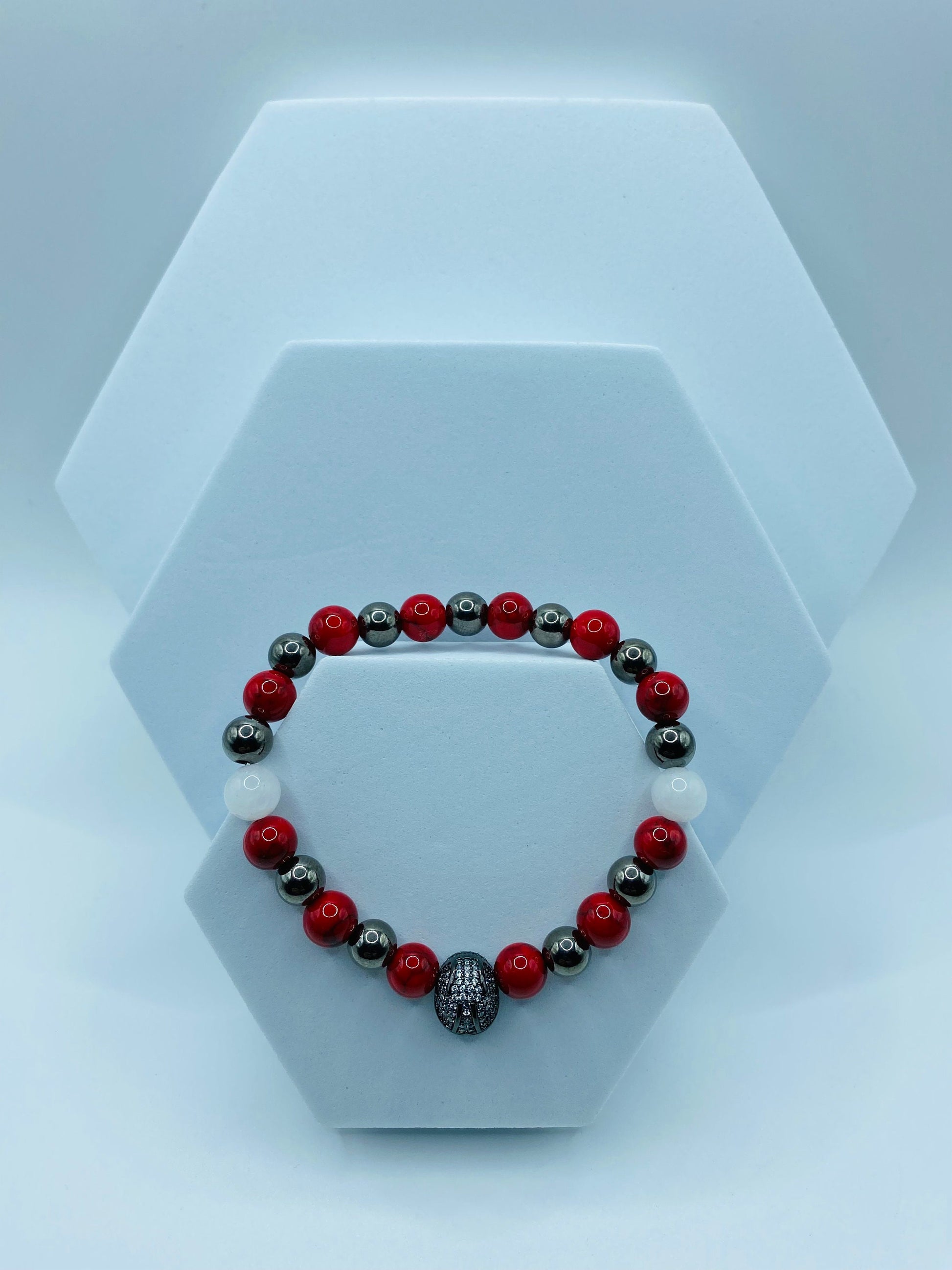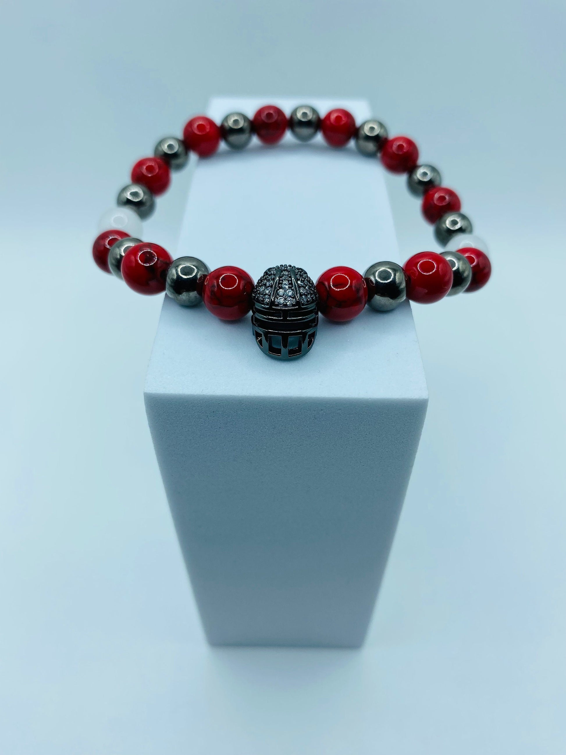 PRODUCT DETAIL - 8mm red turquoise gemstone beads - 8mm natural jade gemstone beads - 8mm natural hematite gemstone beads - Gum metal plated football helmet with inlaid cubic zirconia - Strong, stretchy cord - Handmade in a clean and safe environment