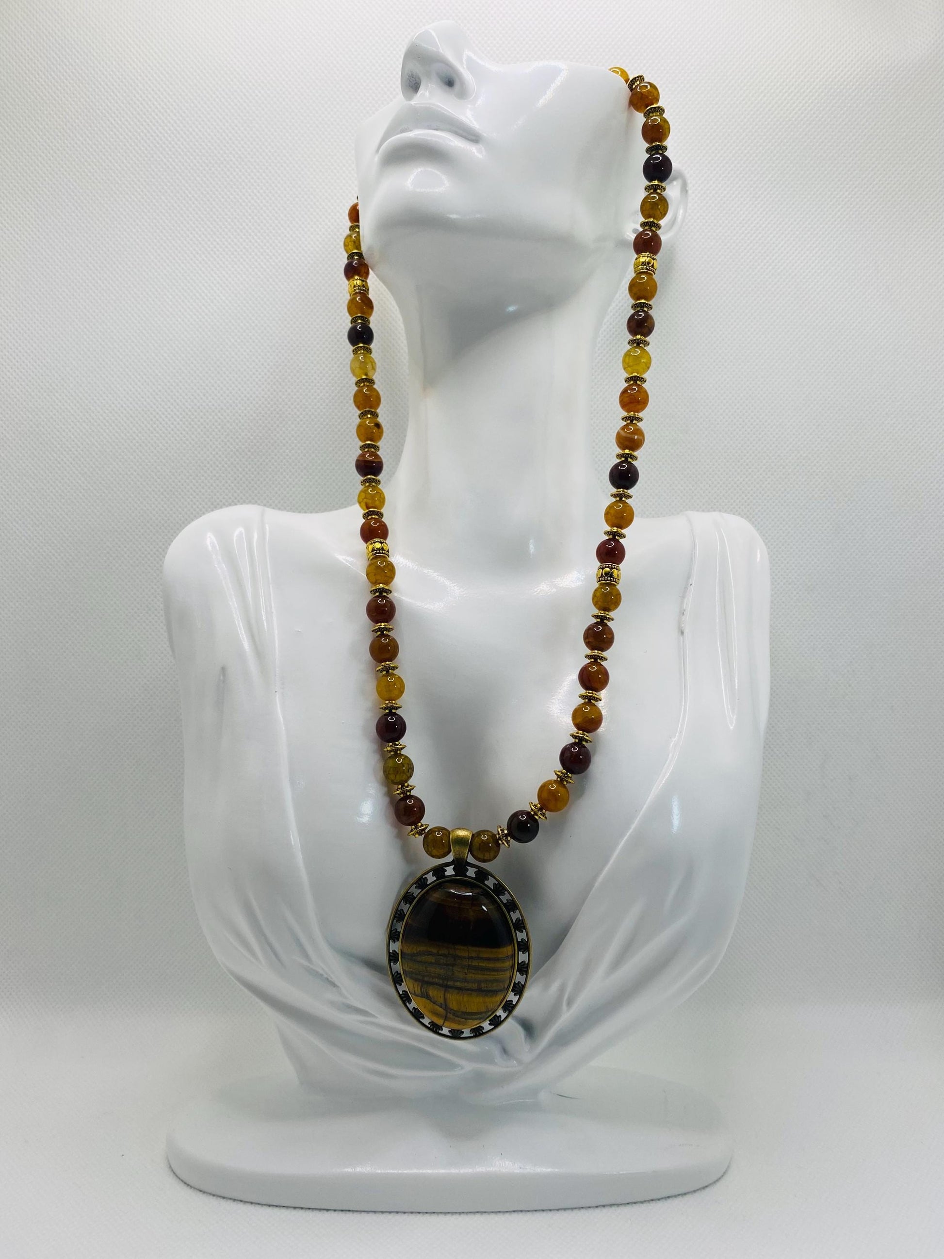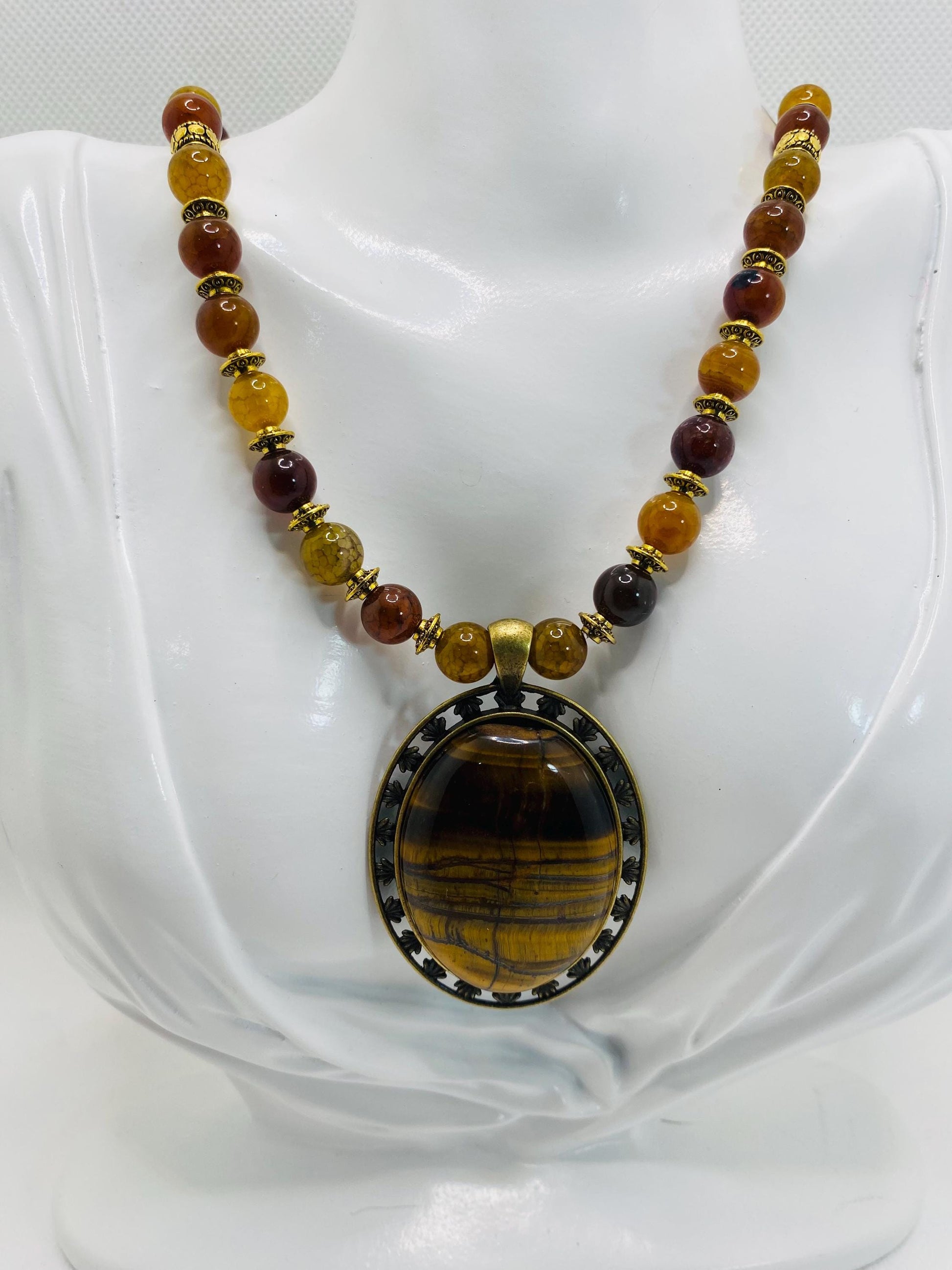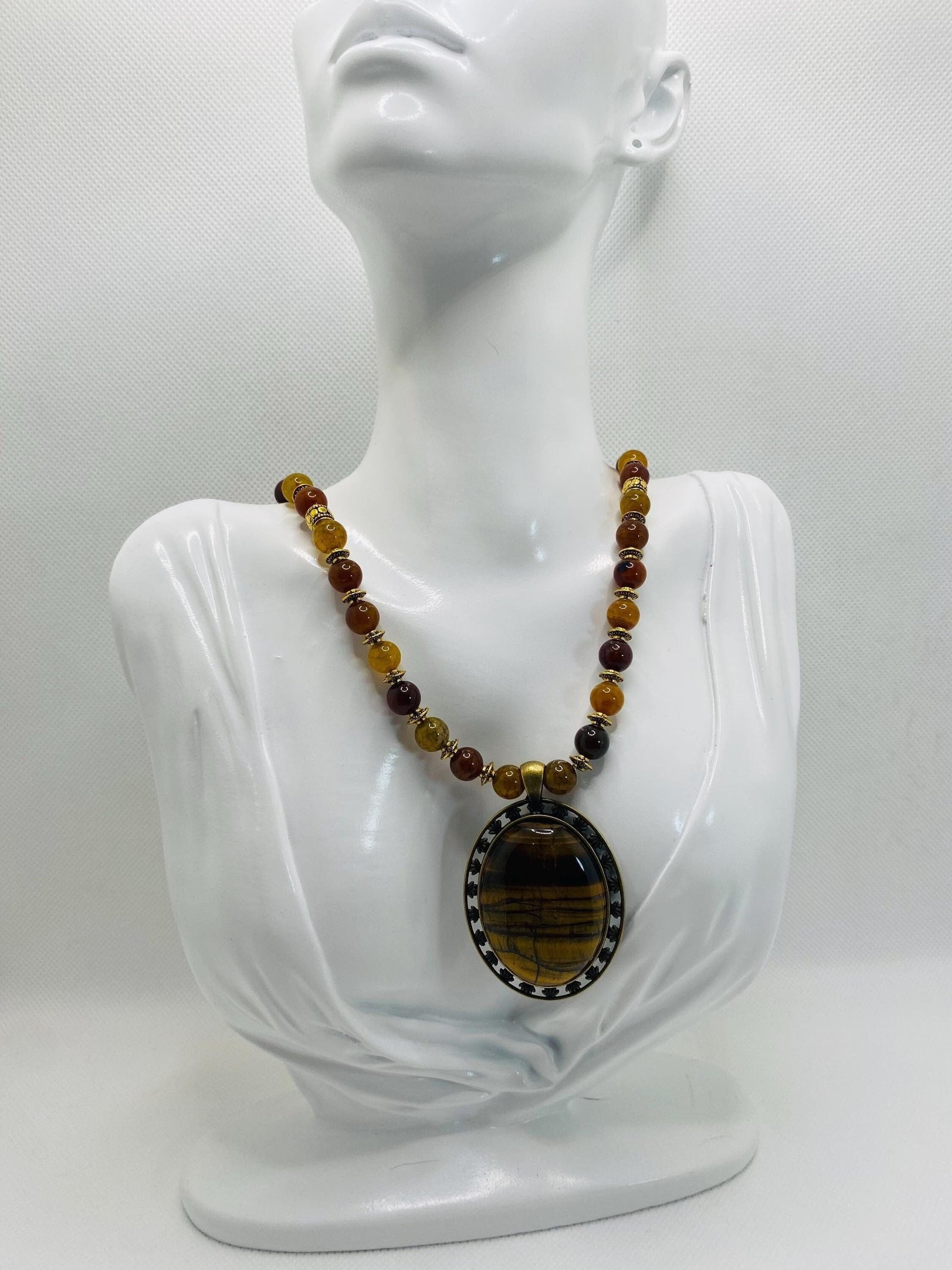 Elevate your accessory game with the stunning Tigers Eye & Dragon Vein Agate Necklace, a true masterpiece of Tibetan style gemstone jewelry. This eye-catching necklace features a striking 5cm x 4cm natural large Tigers Eye gemstone, known for its captivating golden-brown hues and unique chatoyancy. It's not just a piece of jewelry; it's a conversation starter that brings warmth and grounding energy to your style. Complementing the bold Tigers Eye are 8mm natural Dragon Vein Agate gemstone beads, each one distinct with their intricate patterns and vibrant colors. These beads not only create a visually captivating design but also carry powerful energy, fostering strength and creativity. The 6mm A-grade beads enhance the overall elegance, making this necklace suitable for both casual outings and special occasions. Whether you're treating yourself or searching for a meaningful gift, this Tigers Eye & Dragon Vein Agate Necklace is a perfect choice. Don’t miss the chance to own this beautiful piece of jewelry that harmonizes style, energy, and uniqueness. Add it to your collection today and let your personality shine!