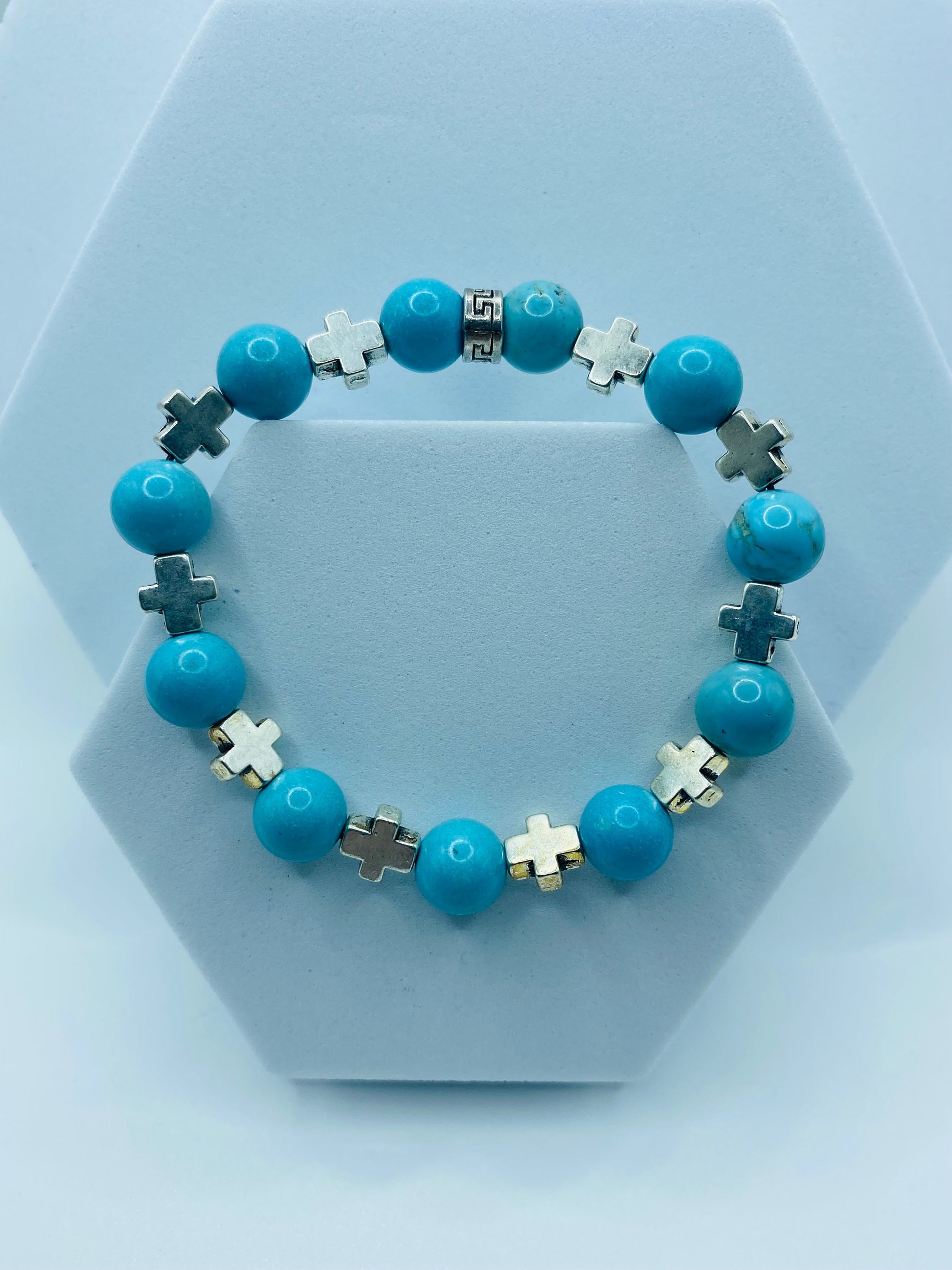 PRODUCT DETAILS - Turquoise blue gemstone religious cross bracelet - 8mm blue turquoise gemstone beads - 6x6mm antique silver mini crosses - Antique silver Tibetan tube spacer - Strong, stretchy cord - Handmade in a clean and safe environment