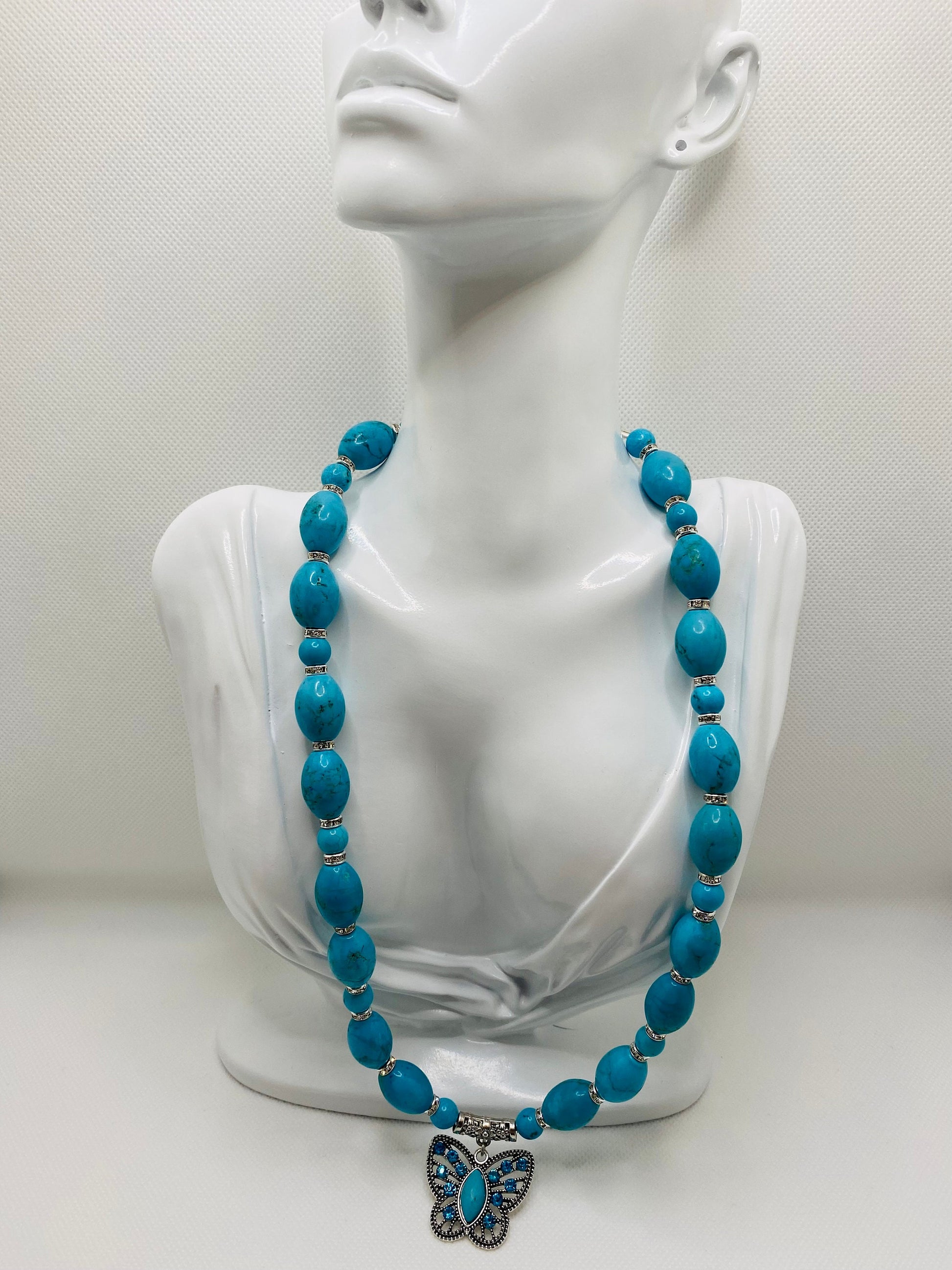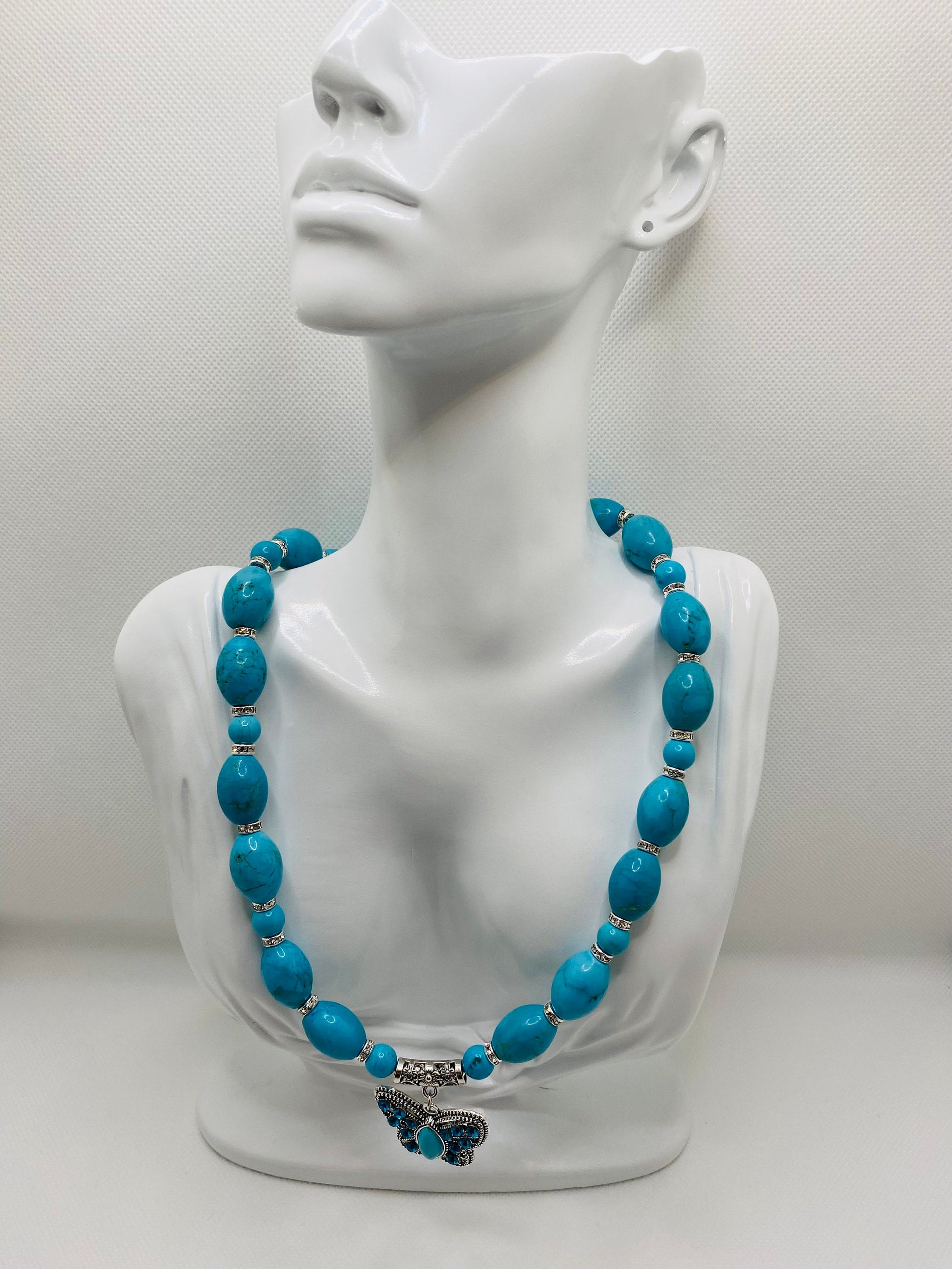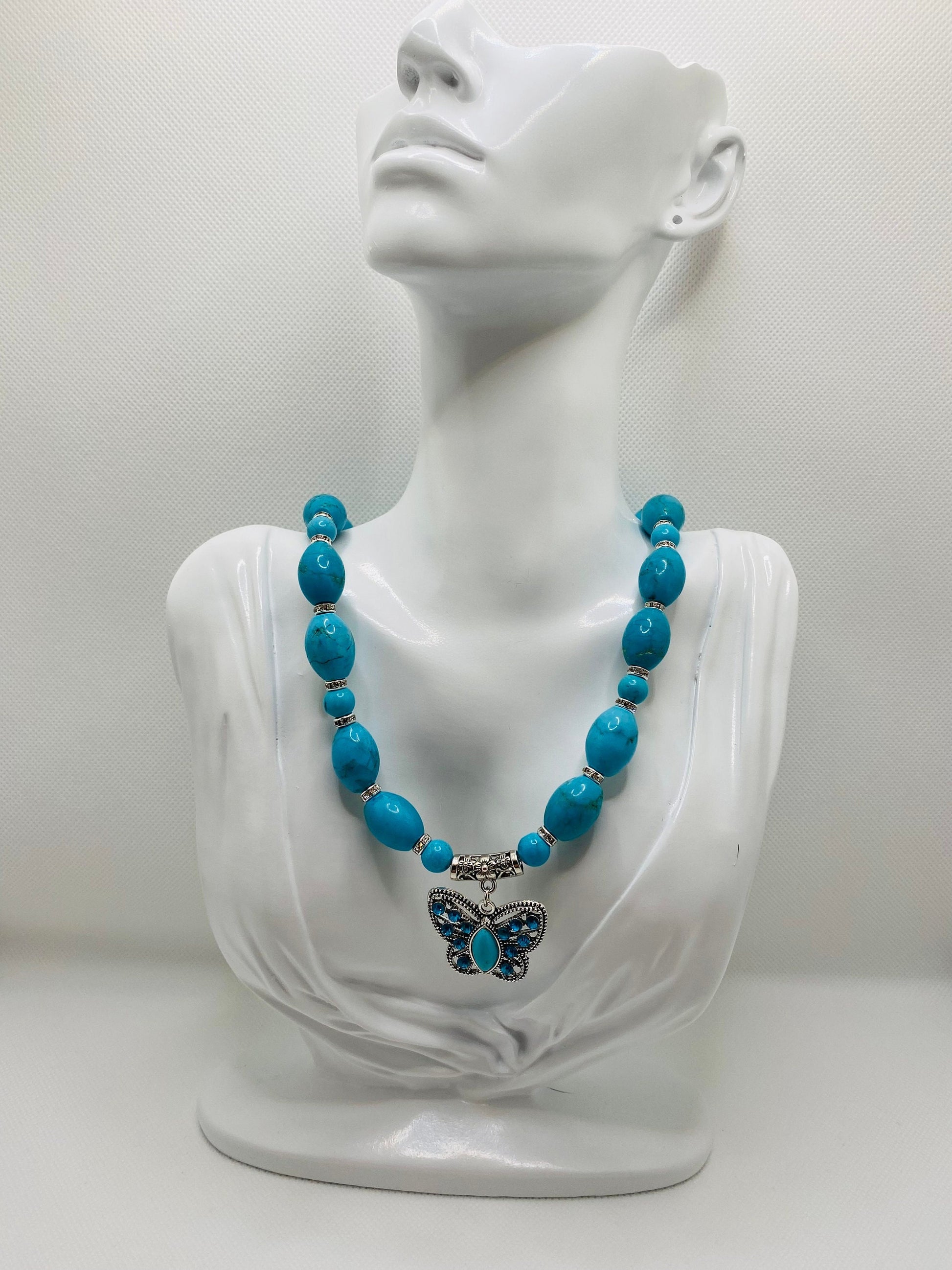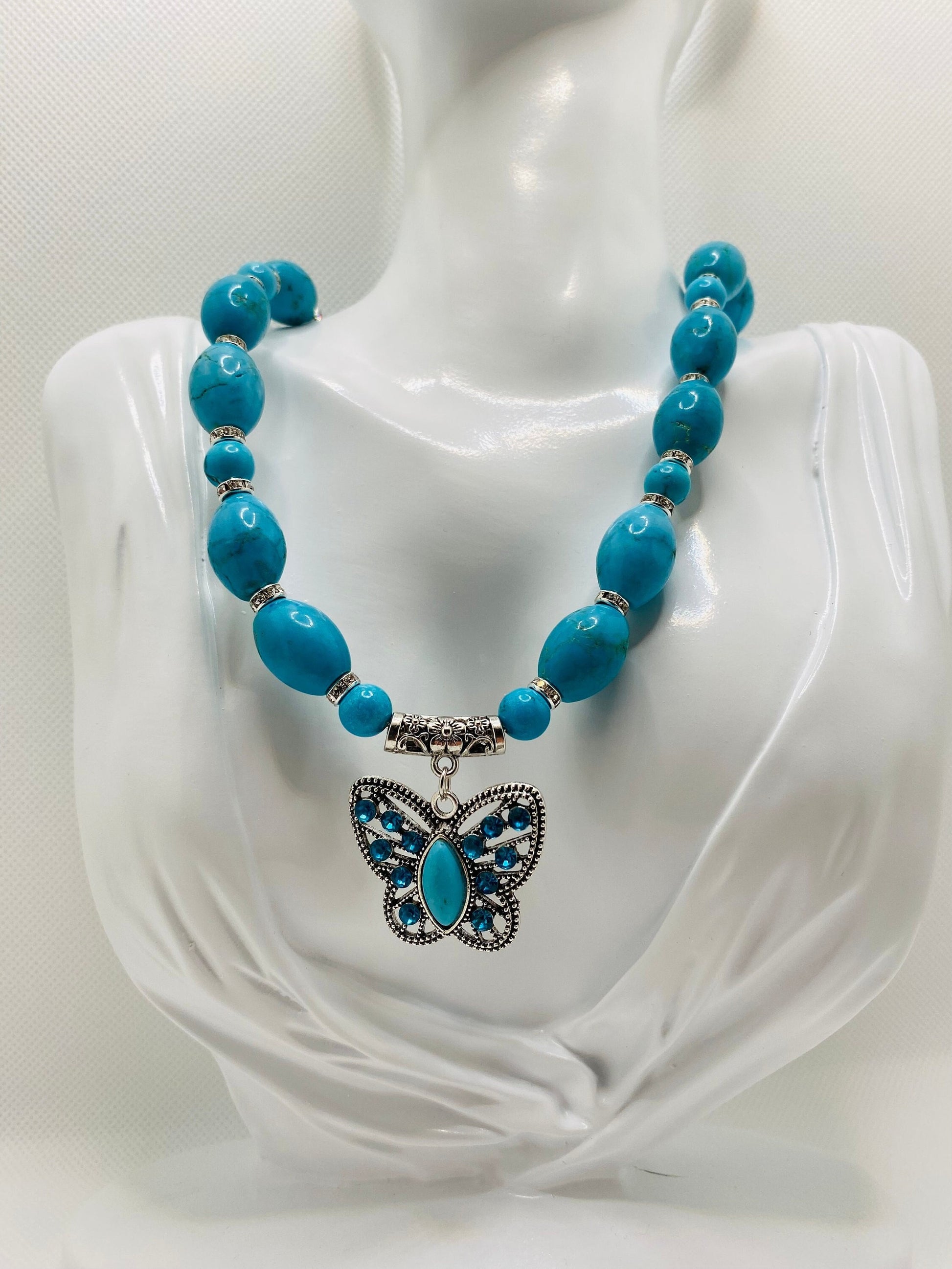 Elevate your style with our stunning Turquoise Necklace featuring a beautiful butterfly pendant adorned with sparkling rhinestone accents. This exquisite piece highlights the natural beauty of 12-16mm AA Natural Barrel Blue Turquoise semi-precious gemstone beads and 8mm natural round blue turquoise beads. Each bead is unique, bringing a vibrant hue and a sense of tranquility that only genuine turquoise can offer. Crafted with care, this necklace isn't just a piece of jewelry; it’s a statement of individuality. The butterfly pendant symbolizes transformation and freedom, making it a perfect accessory to express your personal style. Whether you’re dressing up for a special occasion or adding a pop of color to your everyday look, this necklace is versatile enough to complement any outfit. Don’t miss out on the chance to own this enchanting piece. Transform your accessory collection and let your style soar—grab the Turquoise Necklace today and wear your uniqueness with pride!