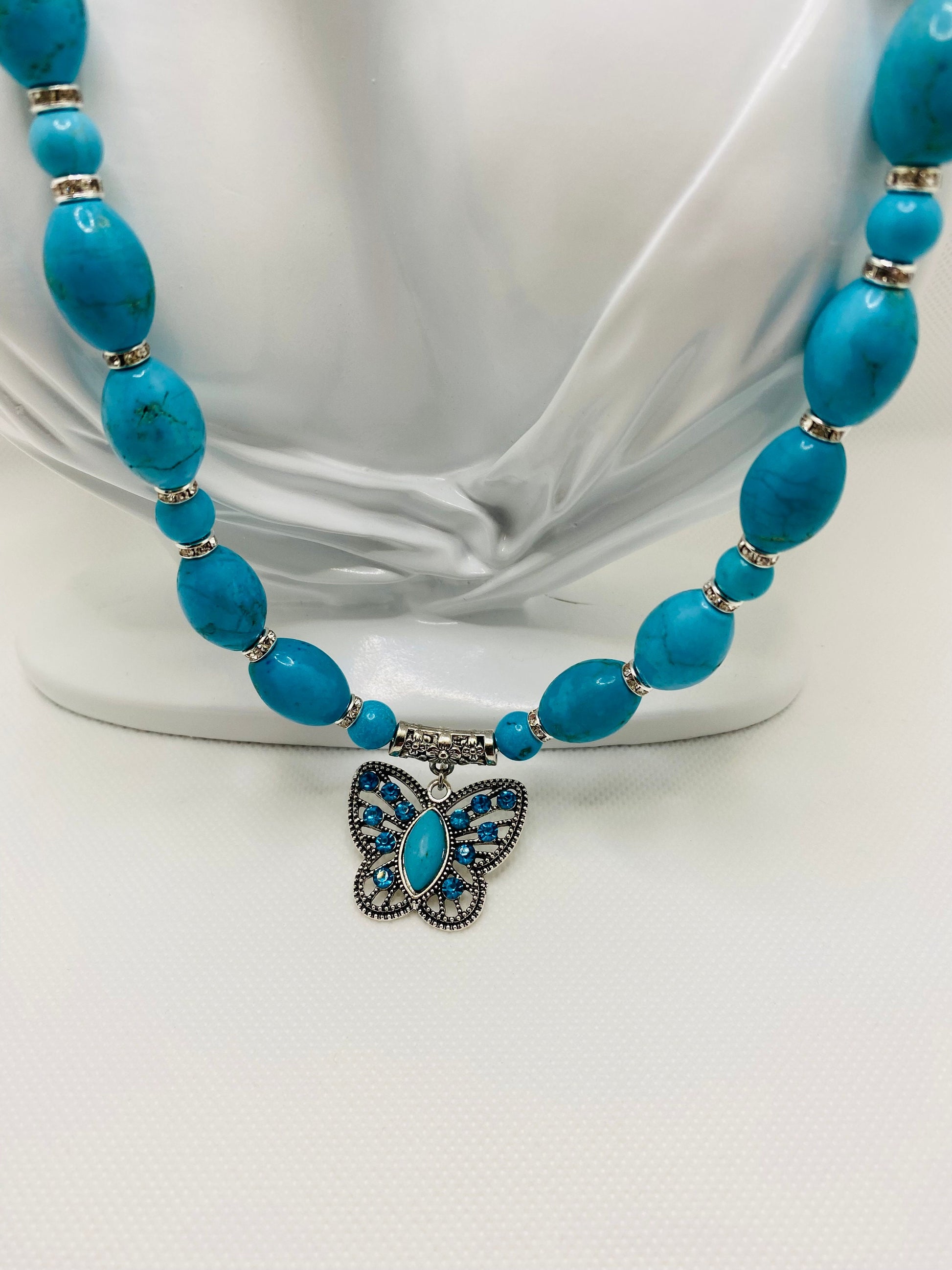 Turquoise Necklace: Butterfly Pendant, Rhinestone Accents