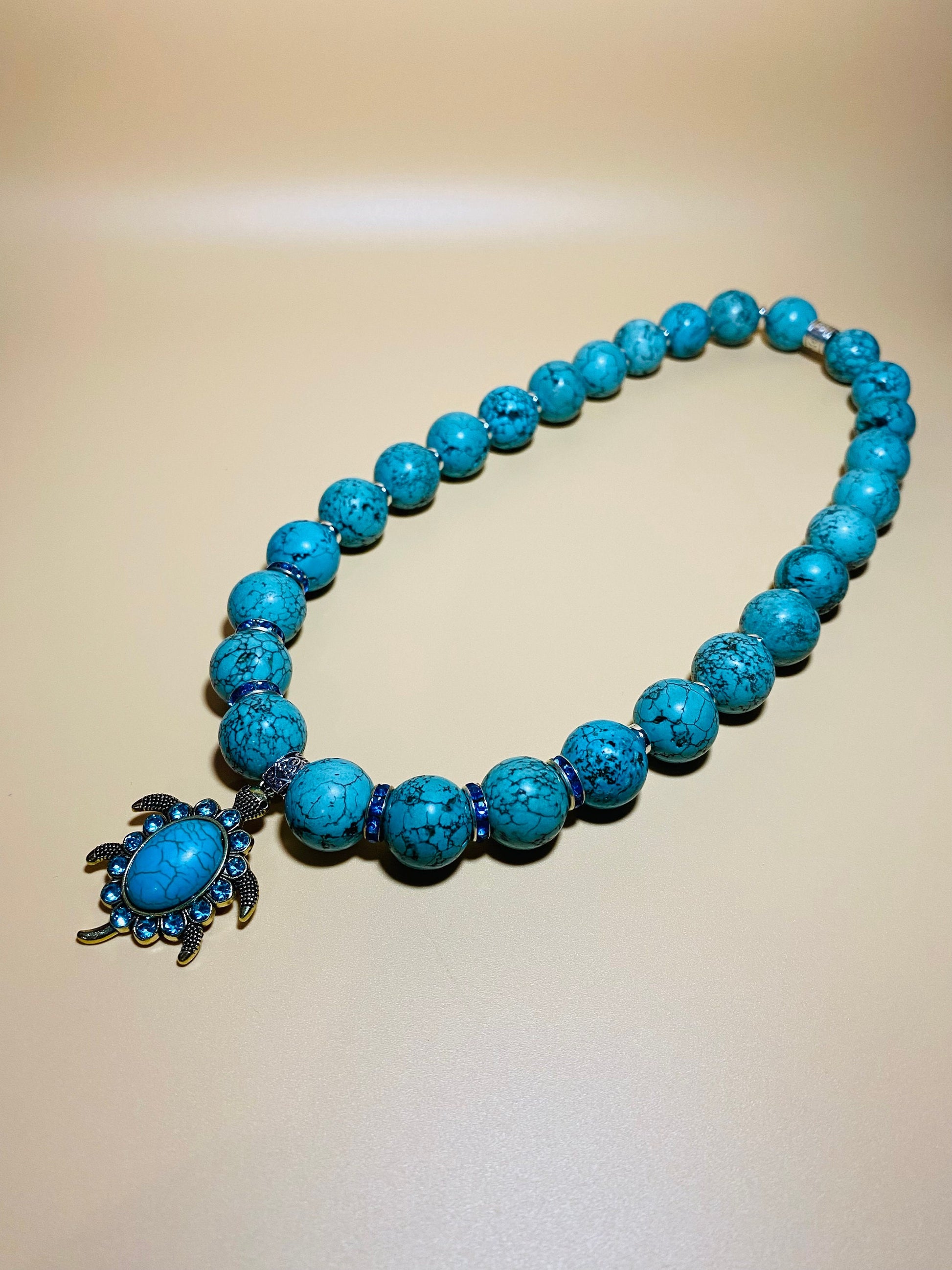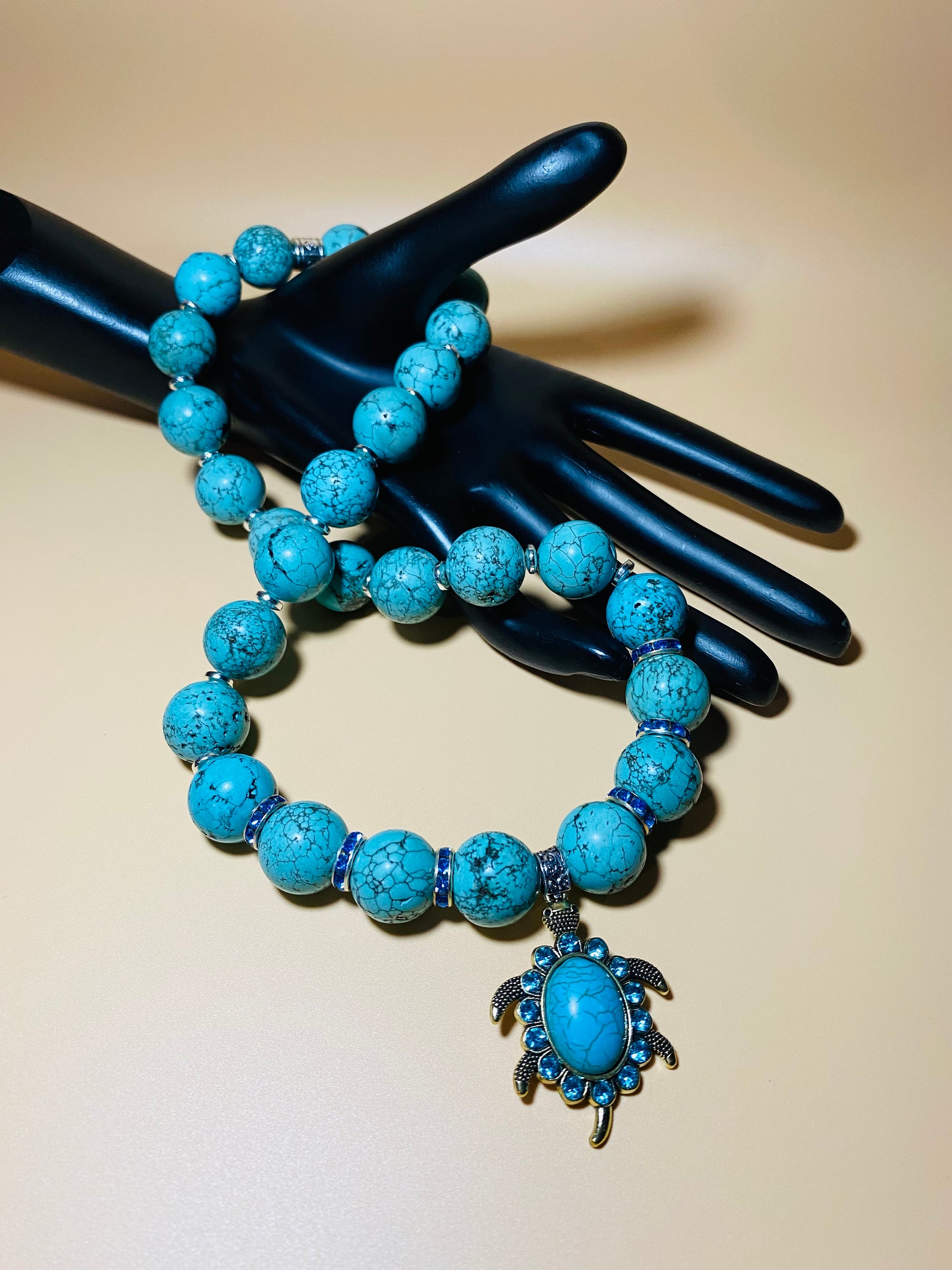 PRODUCT DETAILS - Turquoise sea turtle charm necklace - 16mm natural turquoise gemstone beads - Antique gold turquoise sea turtle pendant charm with blue rhinestone crystals - 4mm silver plated hematite rondelle spacers - Antique silver Tibetan tube spacer - 10mm rondelle's with sparkling blue rhinestone crystals - Strong, stretchy cord - Handmade in a clean and safe environment
