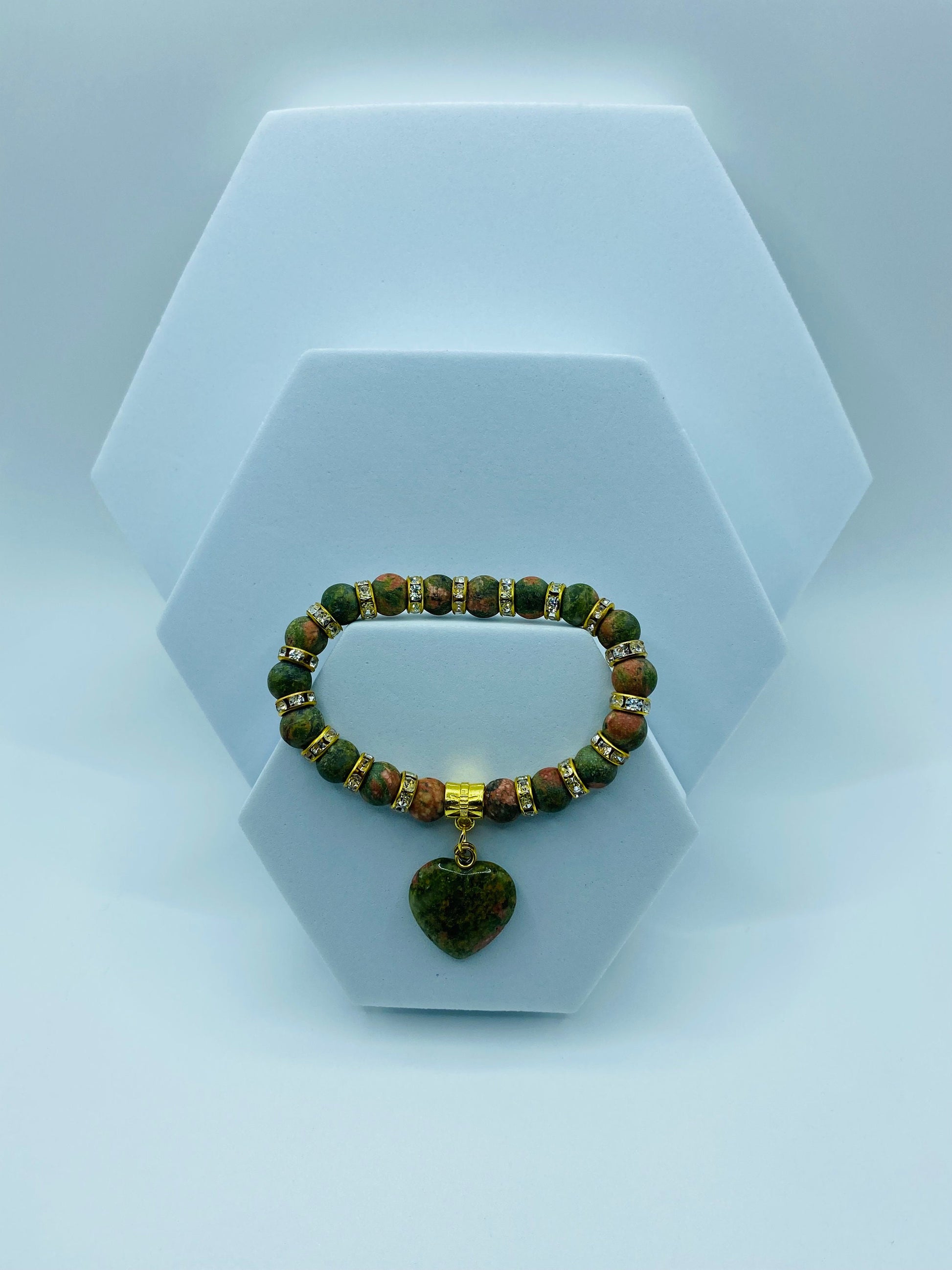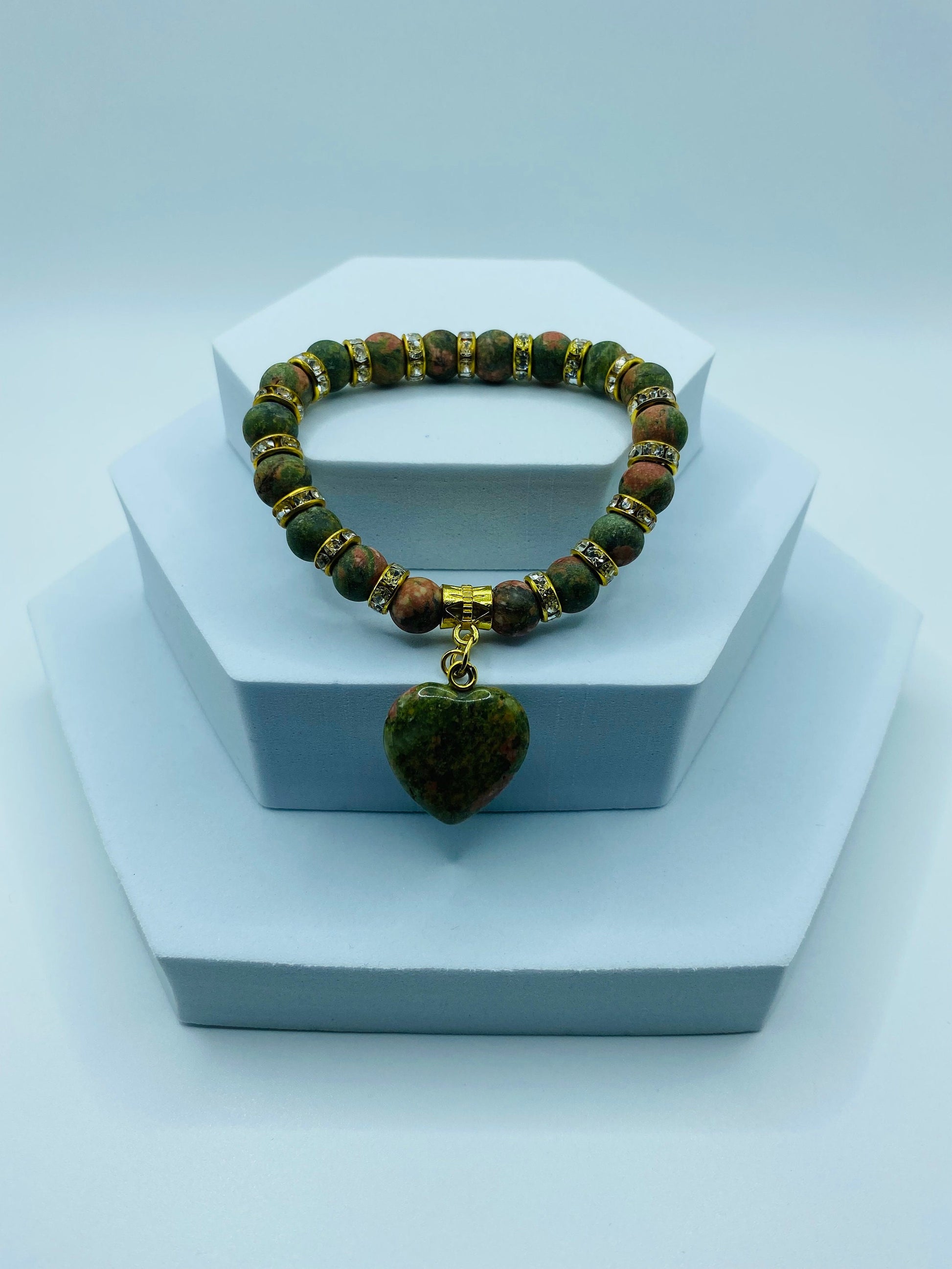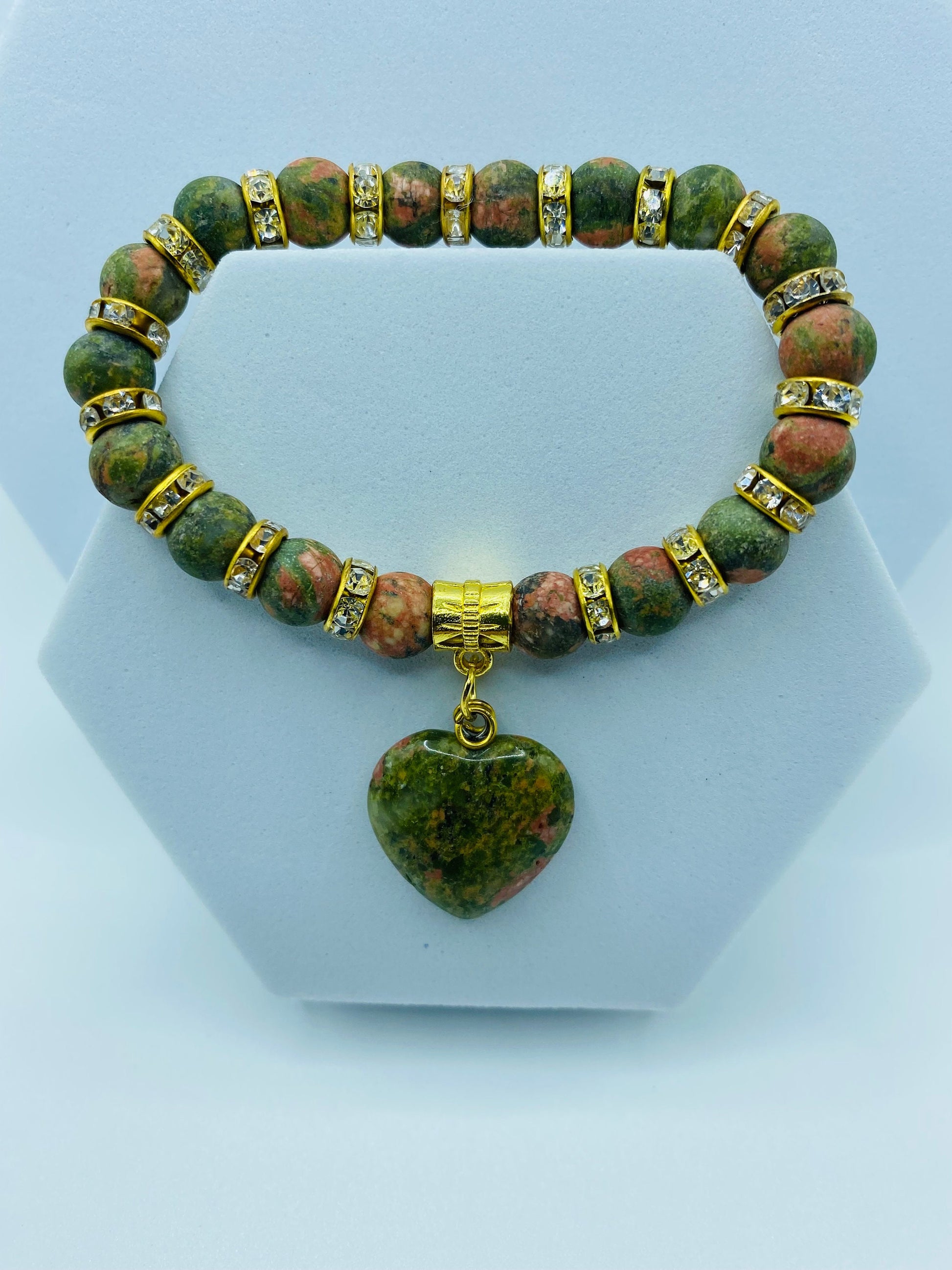 Elevate your style with this stunning Custom Jewelry Unakite Heart Charm Bracelet featuring beautiful Unakite gemstone beads accented with luxurious 18k gold spacer beads. Each bead is carefully selected to create a unique and one-of-a-kind piece that will surely turn heads. This bracelet is perfect for adding a touch of elegance to any outfit, making it a must-have accessory for your jewelry collection. Handcrafted with love and attention to detail, this bracelet is a must-have for any jewelry lover. Stand out from the crowd with this beautiful accessory that is sure to turn heads wherever you.