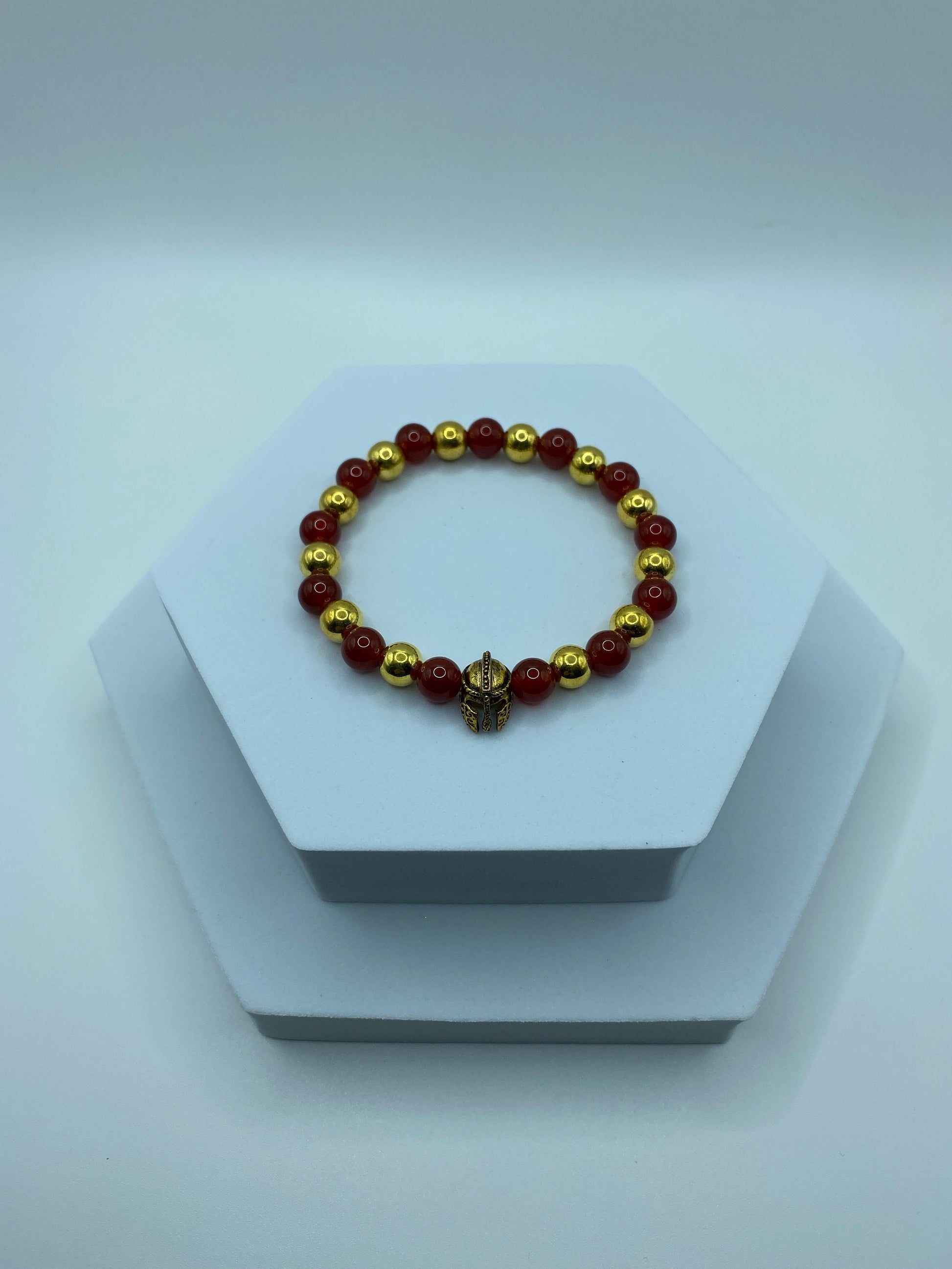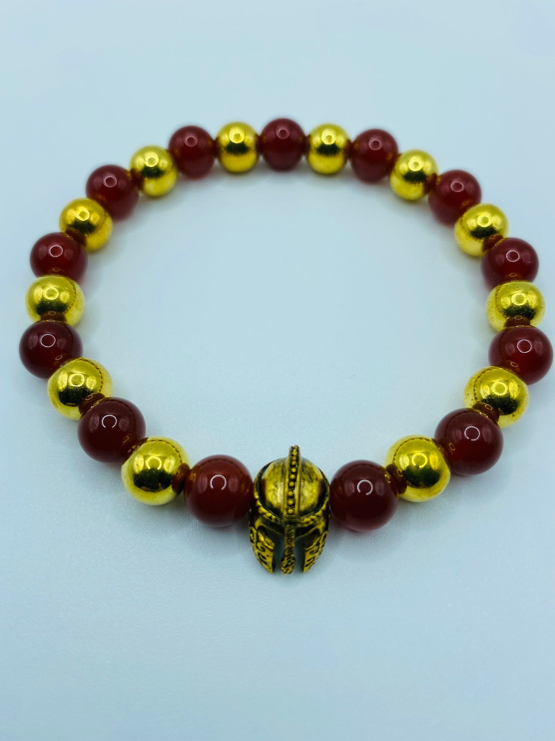 PRODUCT DETAILS - 8mm 18k gold plated hematite gemstone beads - 8mm natural carnelian gemstone beads - Antique gold Sparta helmet - Strong, stretchy cord - Handmade in a clean and safe environment