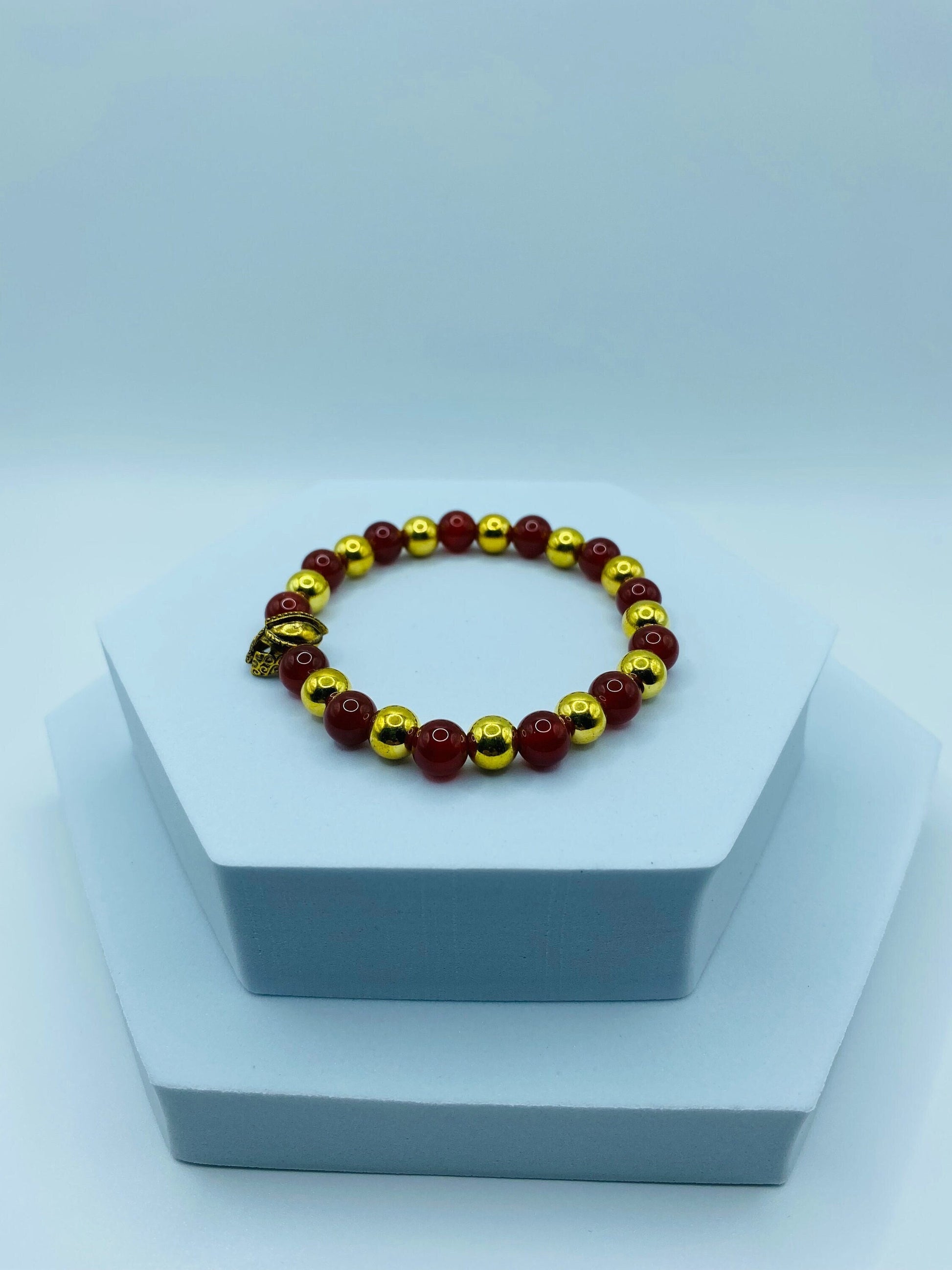 USC Trojans Bracelet: Red Carnelian & Gold Spartan Helmet Beaded Bracelet