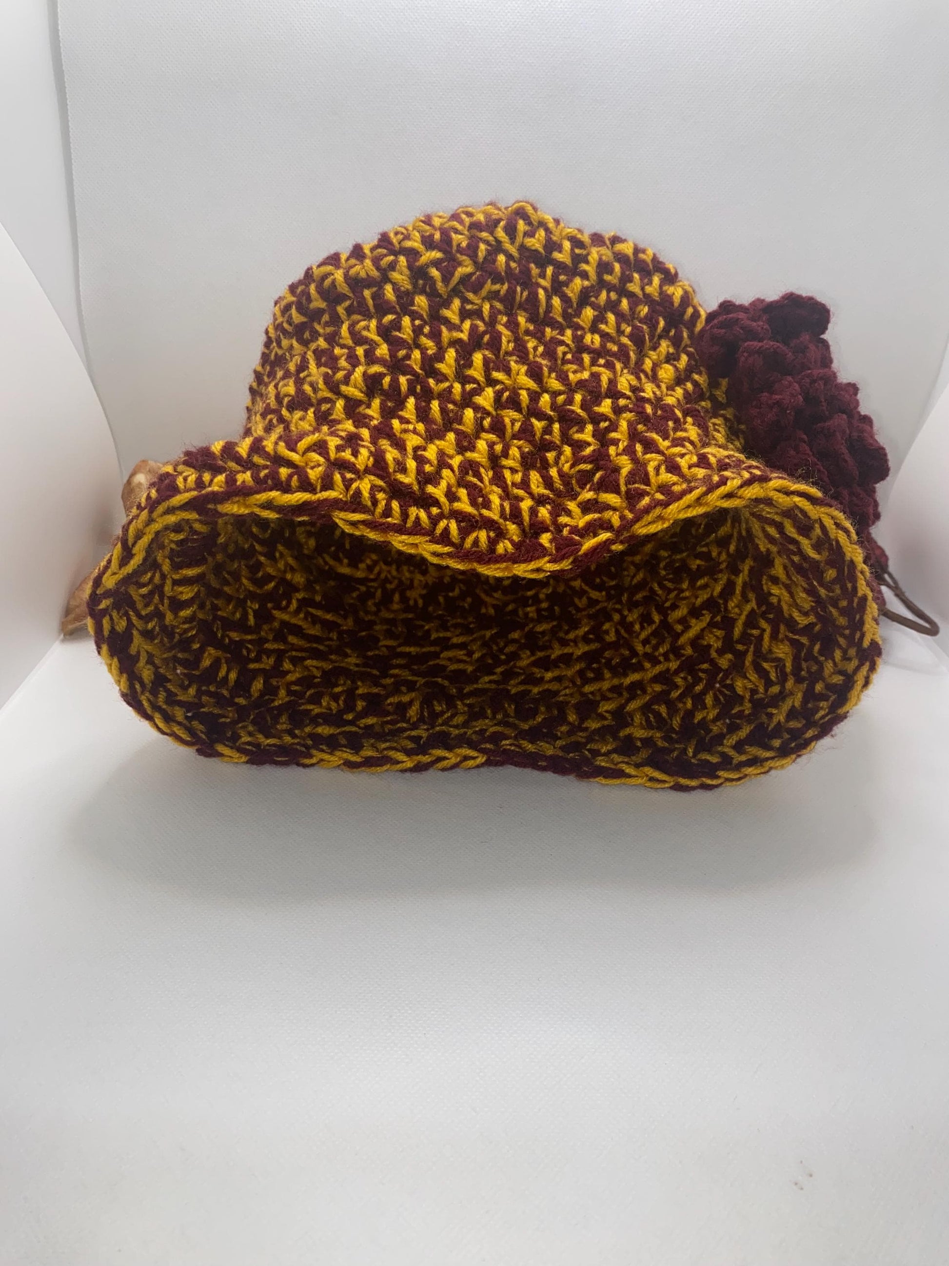 Stay stylish while supporting your favorite team with this handmade Women's Hat USC College Apparel in Gold & Crimson Red! This slouchy beanie features a fun crochet design and can also be worn as a bucket hat for versatile styling options. Whether you're headed to a game or just out and about, this hat is perfect for showing off your team spirit in a fashionable way. Add this to your game day wardrobe or gift it to a fellow Trojans fan! The vibrant colors of gold and crimson red make it a trendy accessory to complete your outfit. Stay cozy and fashionable with this must-have college apparel item!