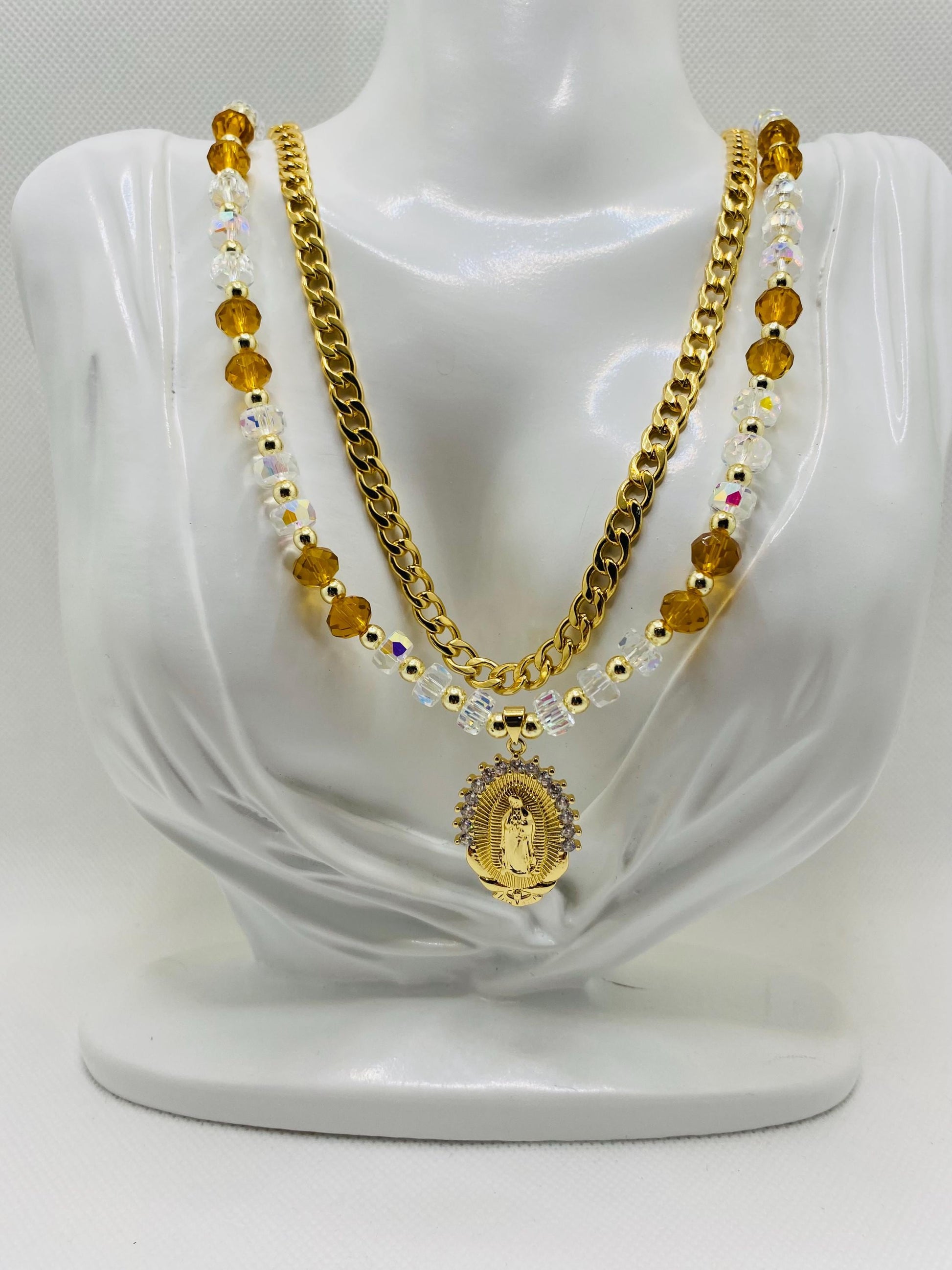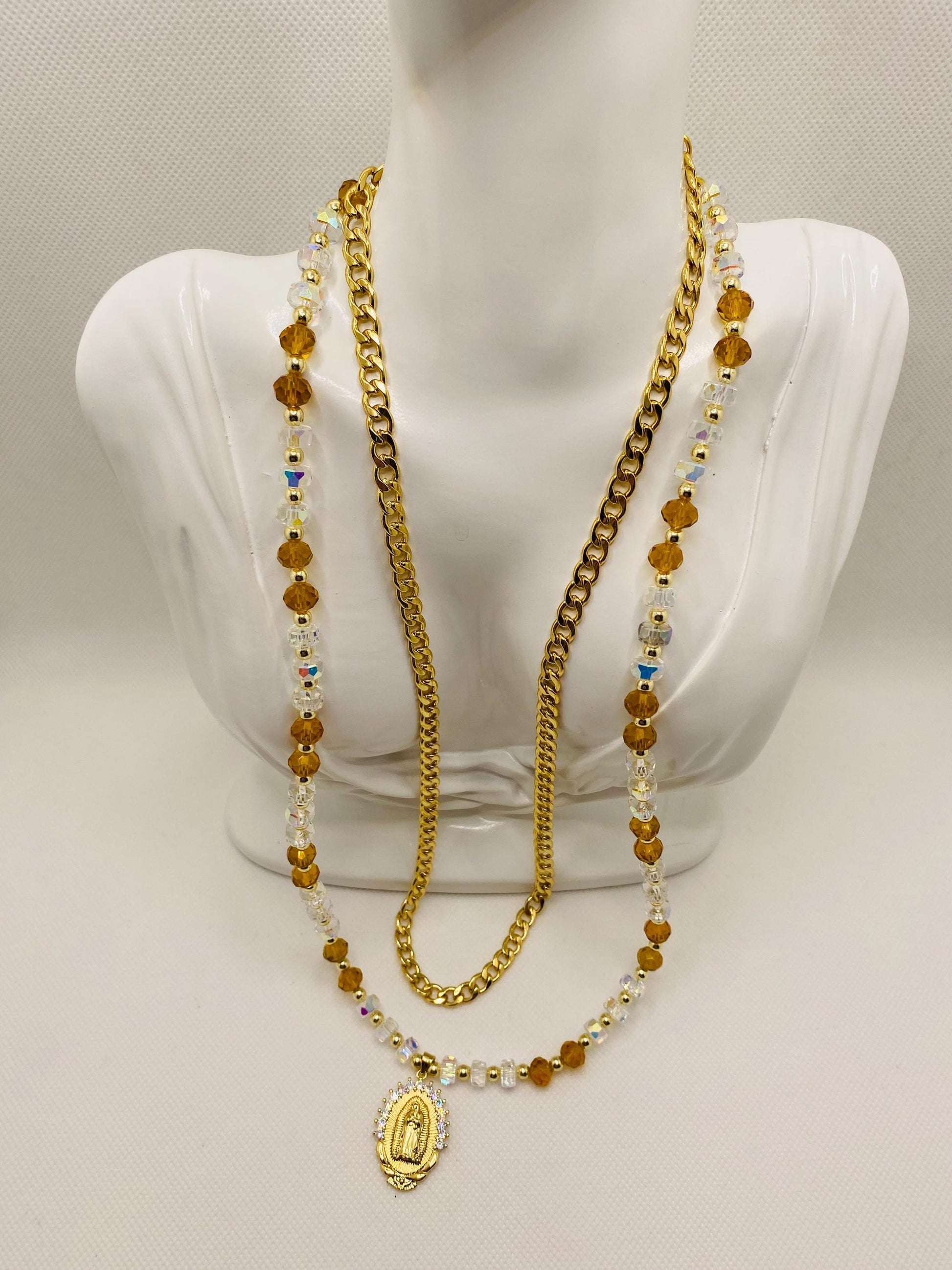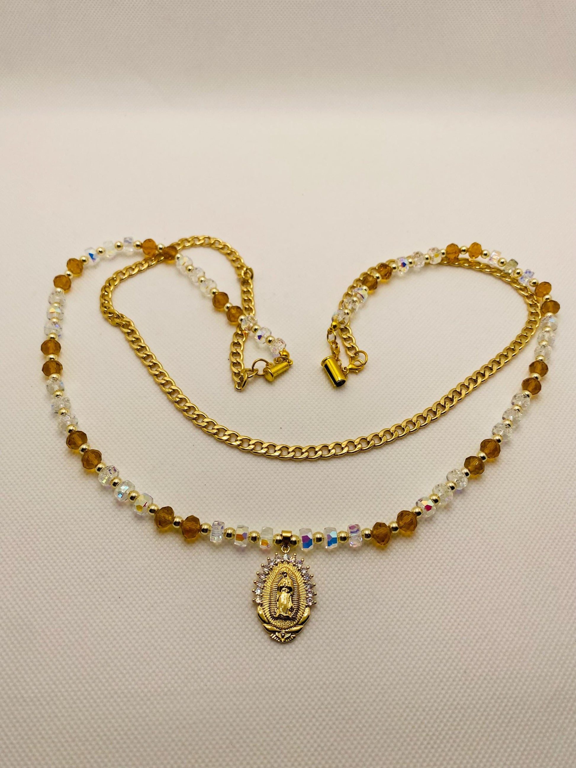 PRODUCT DETAILS : 6mm Curb 18k Gold Plated Cuban Link Chain 24 inches long. : 8mm Clear Crystal Faceted Beads. : 8mm Golden Crystal Faceted Beads. : 4mm Natural Gold Plated Hematite Gemstone Beads. : 7/8inch x 1.26inch Stainless-Steel Gold-Plated Virgin Mary Medalion with Syn, Cubic Zirconia : 18k Gold Plated Lobster Clasp. : 18k Gold Plated Jump Rings. : 18k Gold Plated Magnetic Tube Clasp : Handmade in a Clean and Safe Environment
