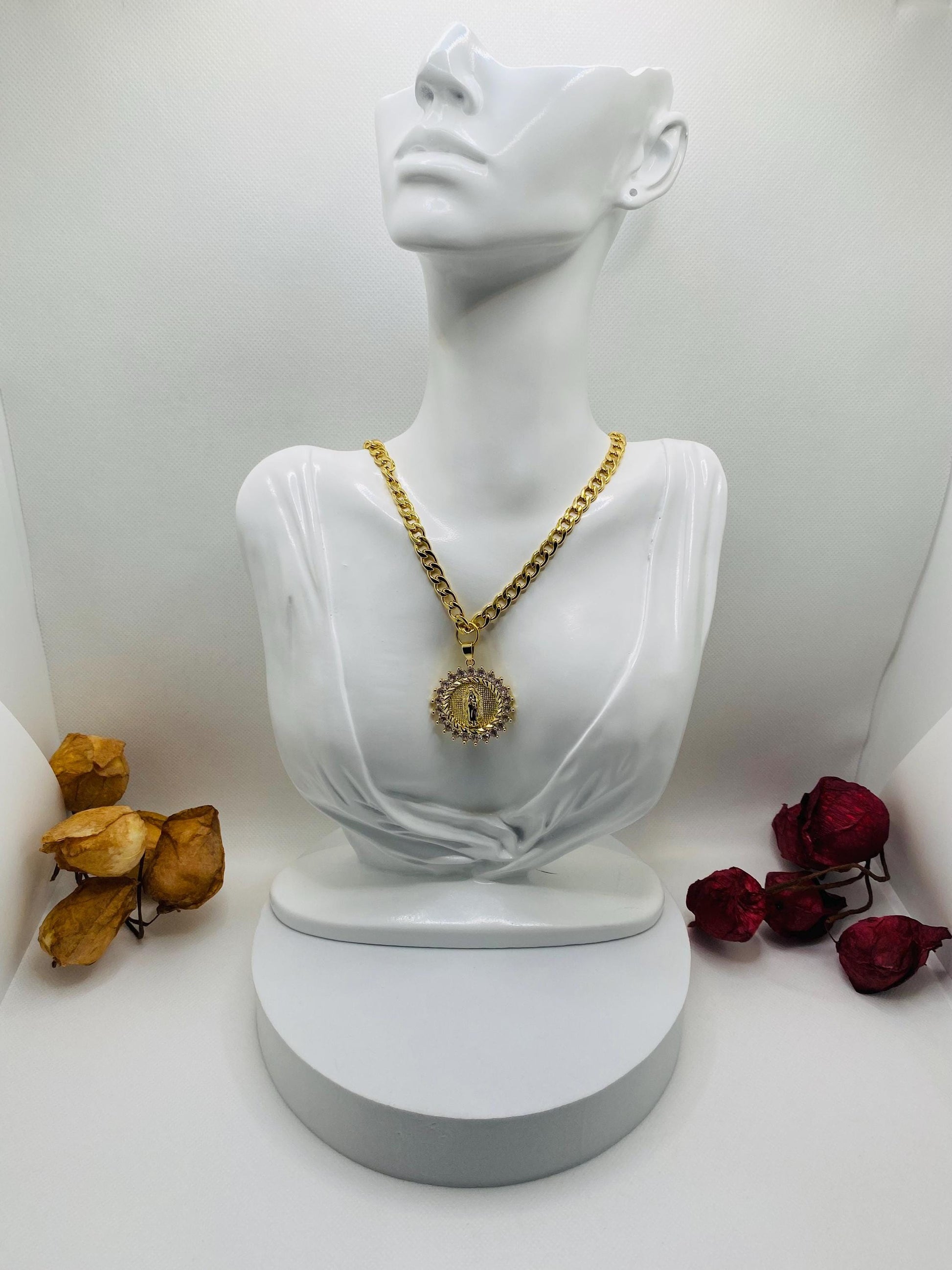 Enhance your style with this stunning Virgin Mary necklace for women! Crafted with gold plated jewelry, this religious piece features a beautiful pendant of the Virgin Mary. The necklace is adorned with a fashionable Cuban link chain, adding a trendy touch to your ensemble. Perfect for everyday wear or special occasions, this piece is a must-have for any jewelry lover seeking both faith and fashion in one accessory. Embrace your faith with this stunning Virgin Mary necklace for women. This gold-plated jewelry piece features intricate detailing on a Cuban link chain, making it a beautiful statement of your spirituality. Elevate your style with this elegant religious jewelry.